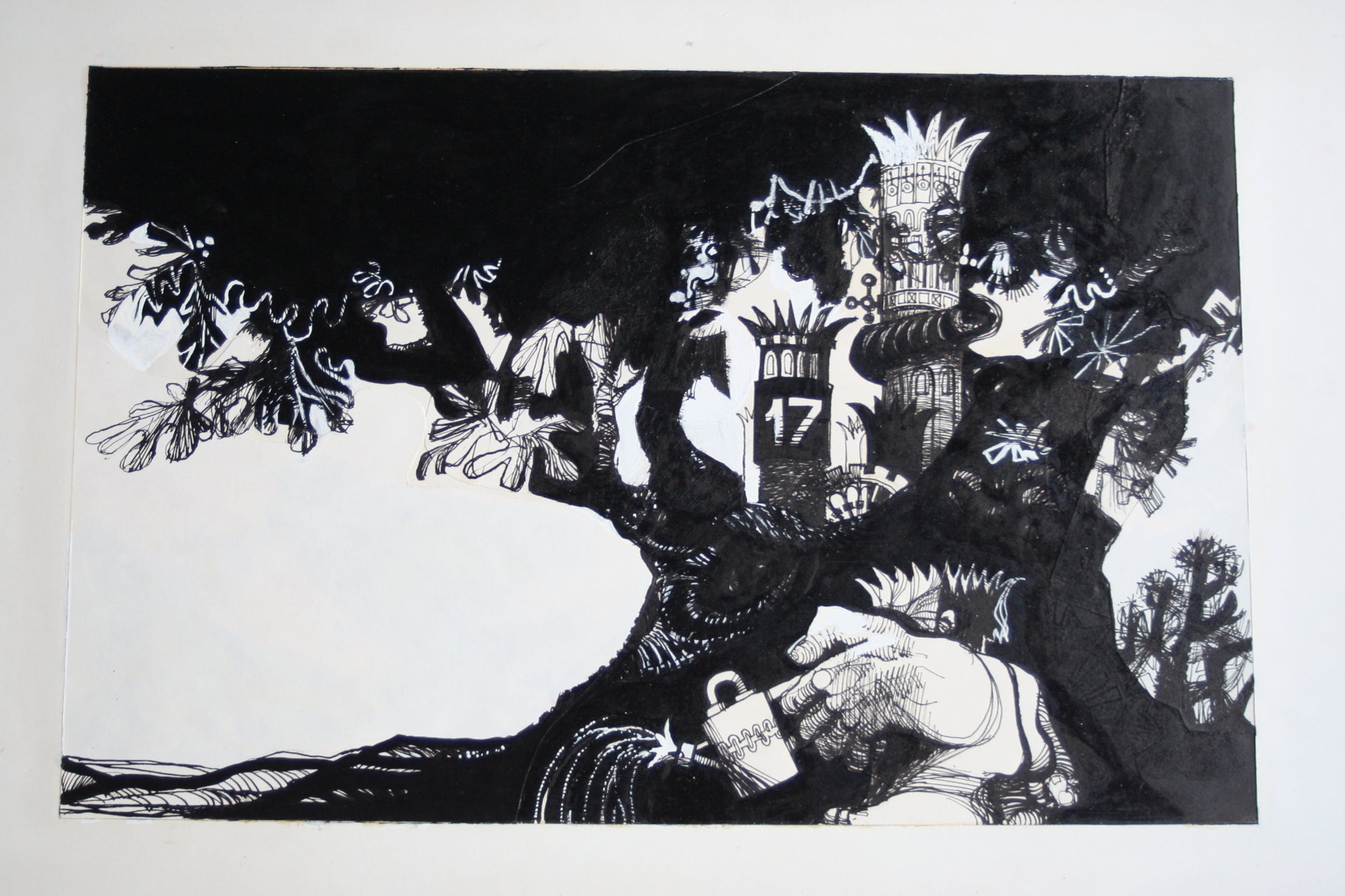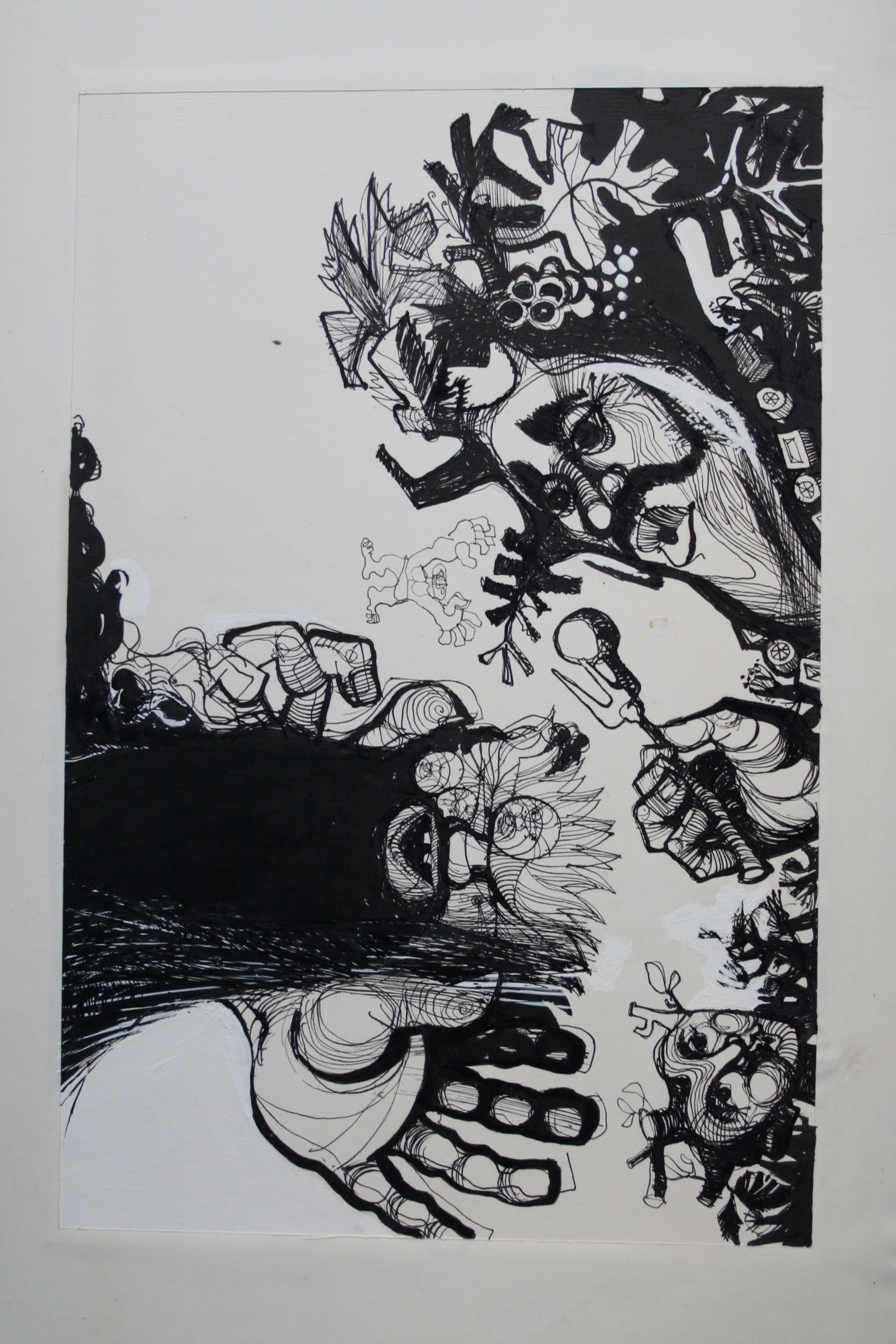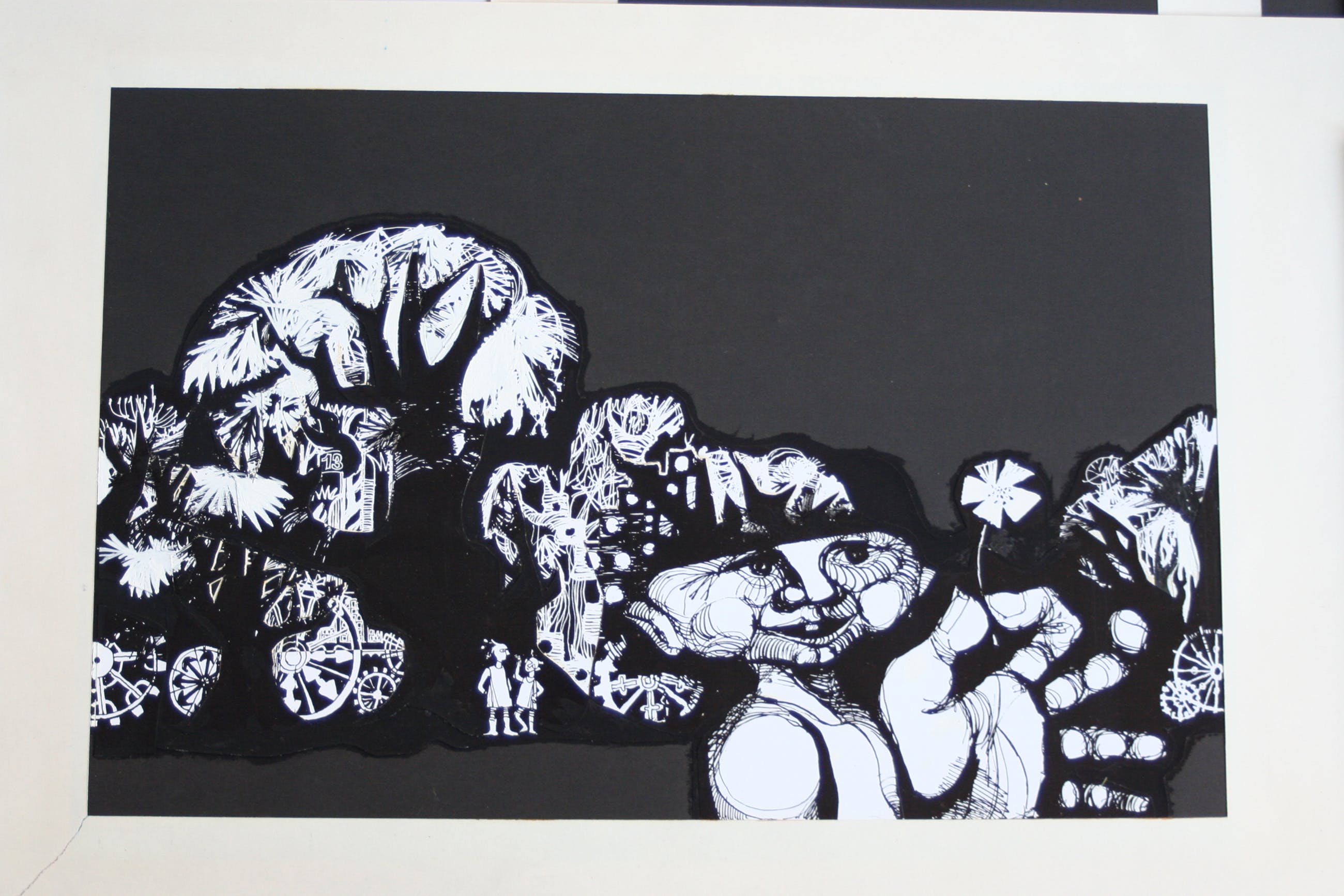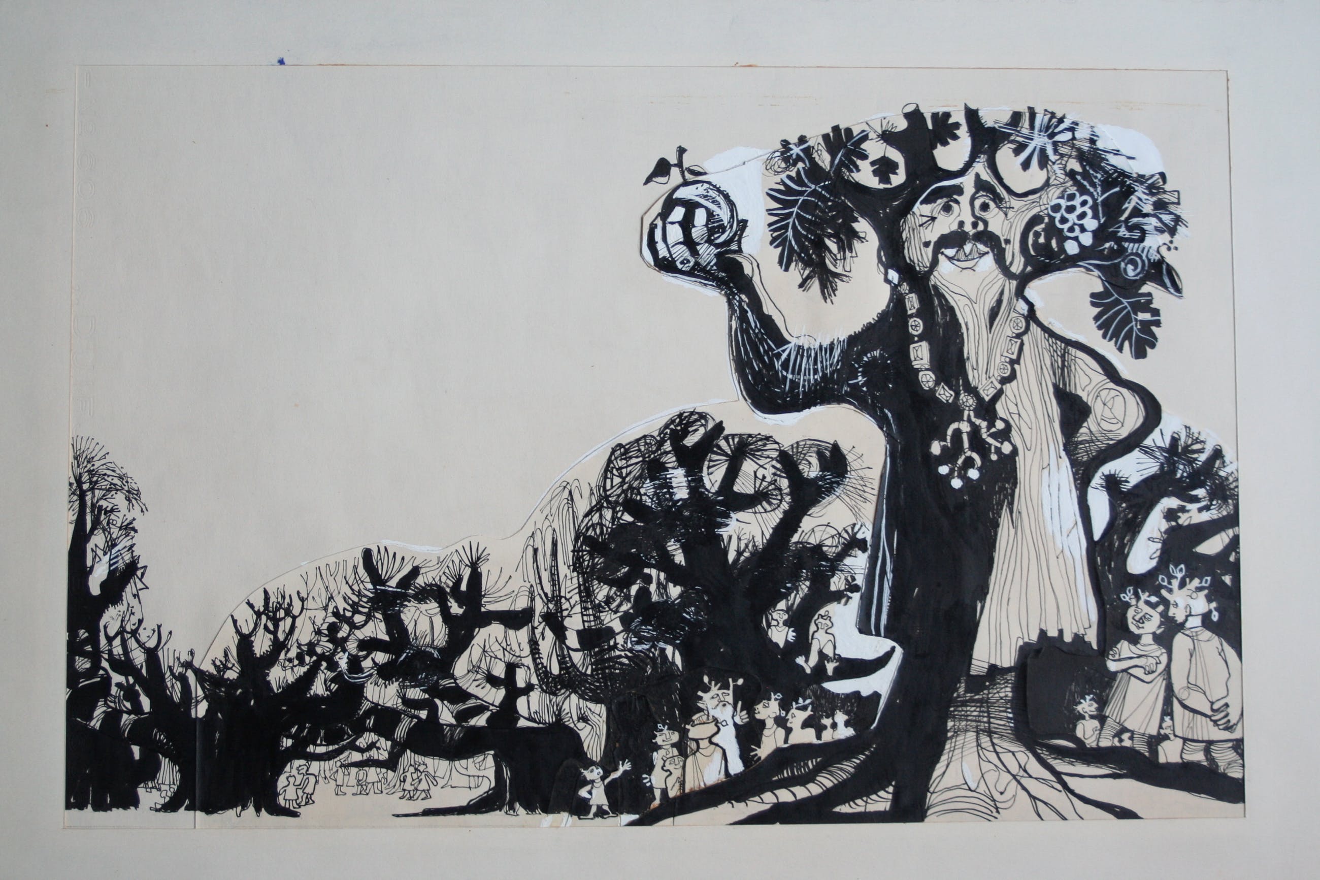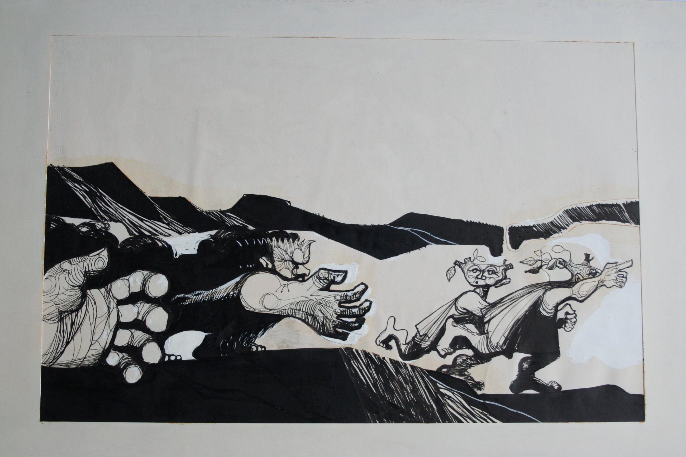 Deze 8 schilderijen zijn gemaakt met inkt en witte en zwarte acrylverf. Onbekend of het bestemd was als illustratie of zelfstandig werk. De fantasy figuren noemde de kunstenaar 'stapele maarders' De tekeningen / schilderijen zijn circa 31 x 48 cm, het passepartout en blad waarop het bevestigd is meet 63 breed en 39 hoog.