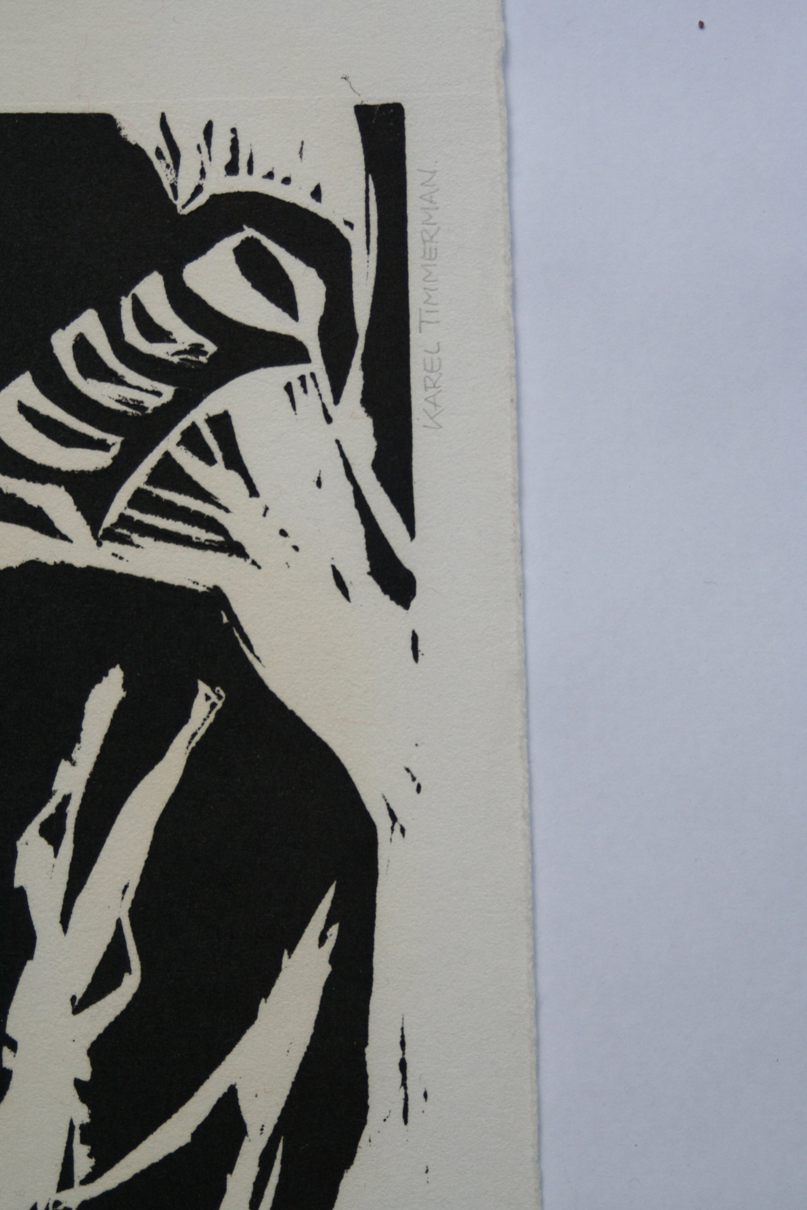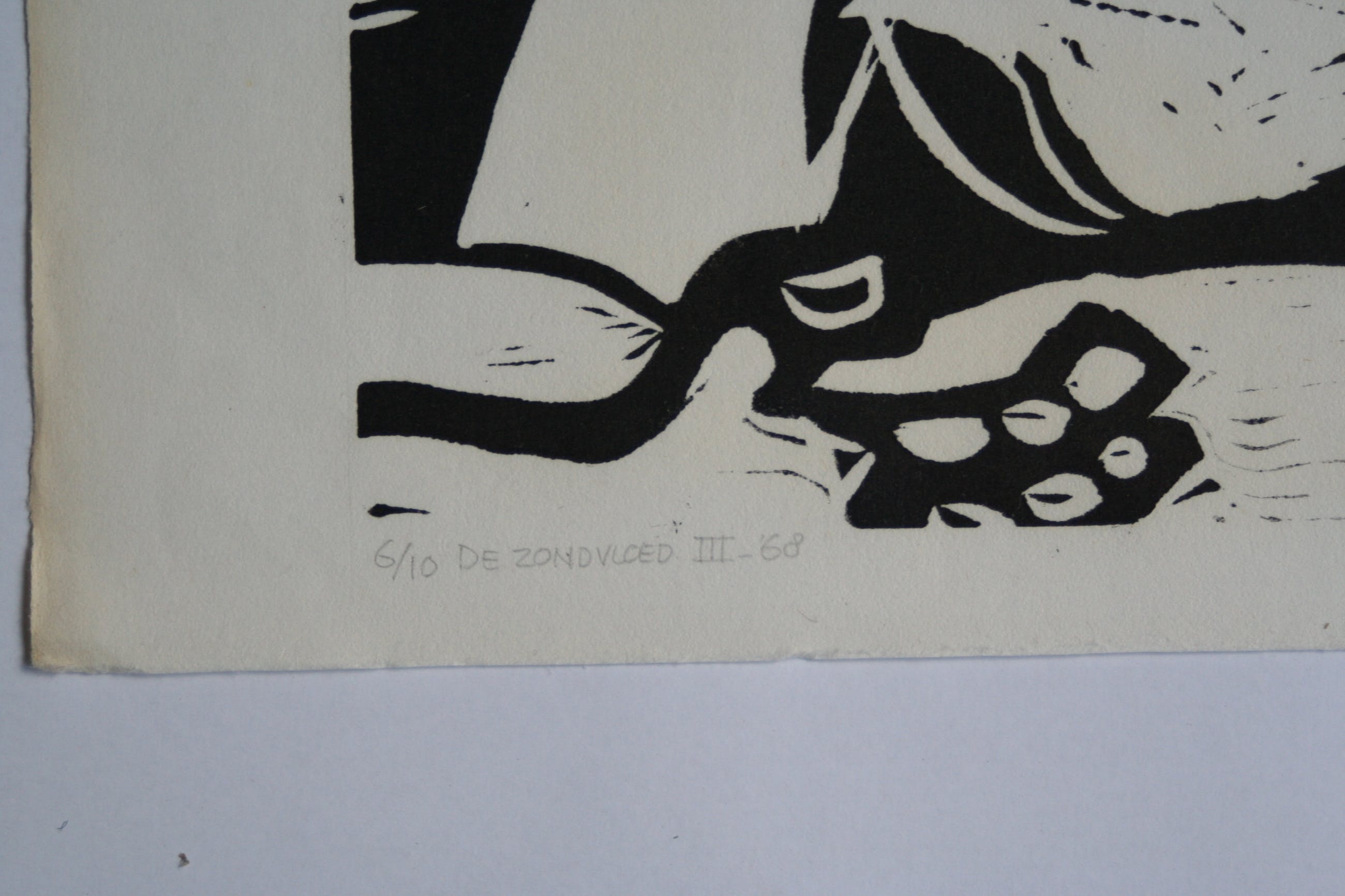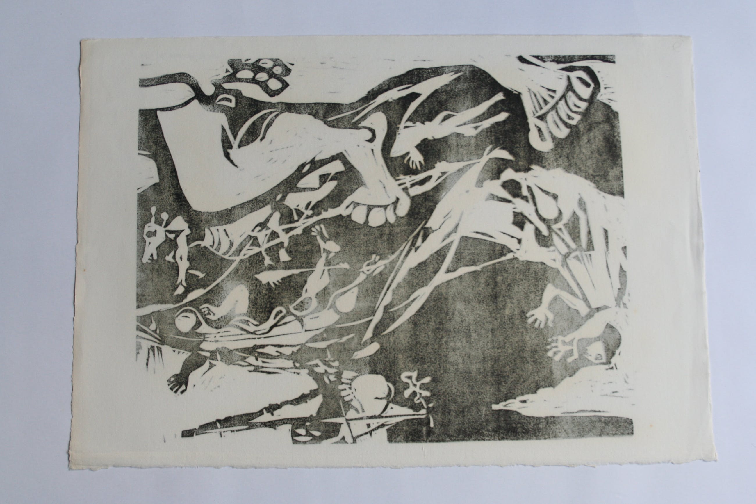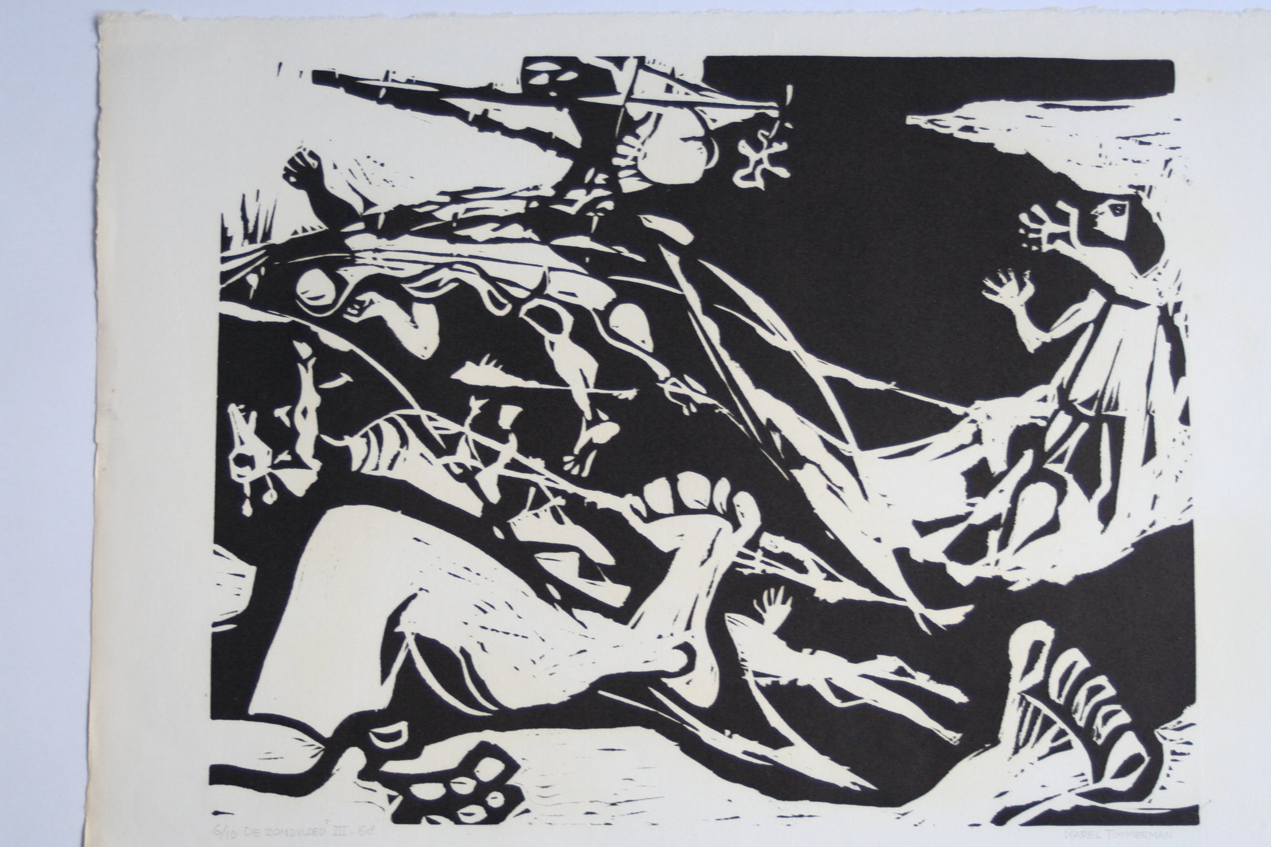 Linodruk van Karel Timmerman. Geïnspireerd op bijbels verhaal van de Zondvloed. Genummerd 6/10. Wordt plat verzonden