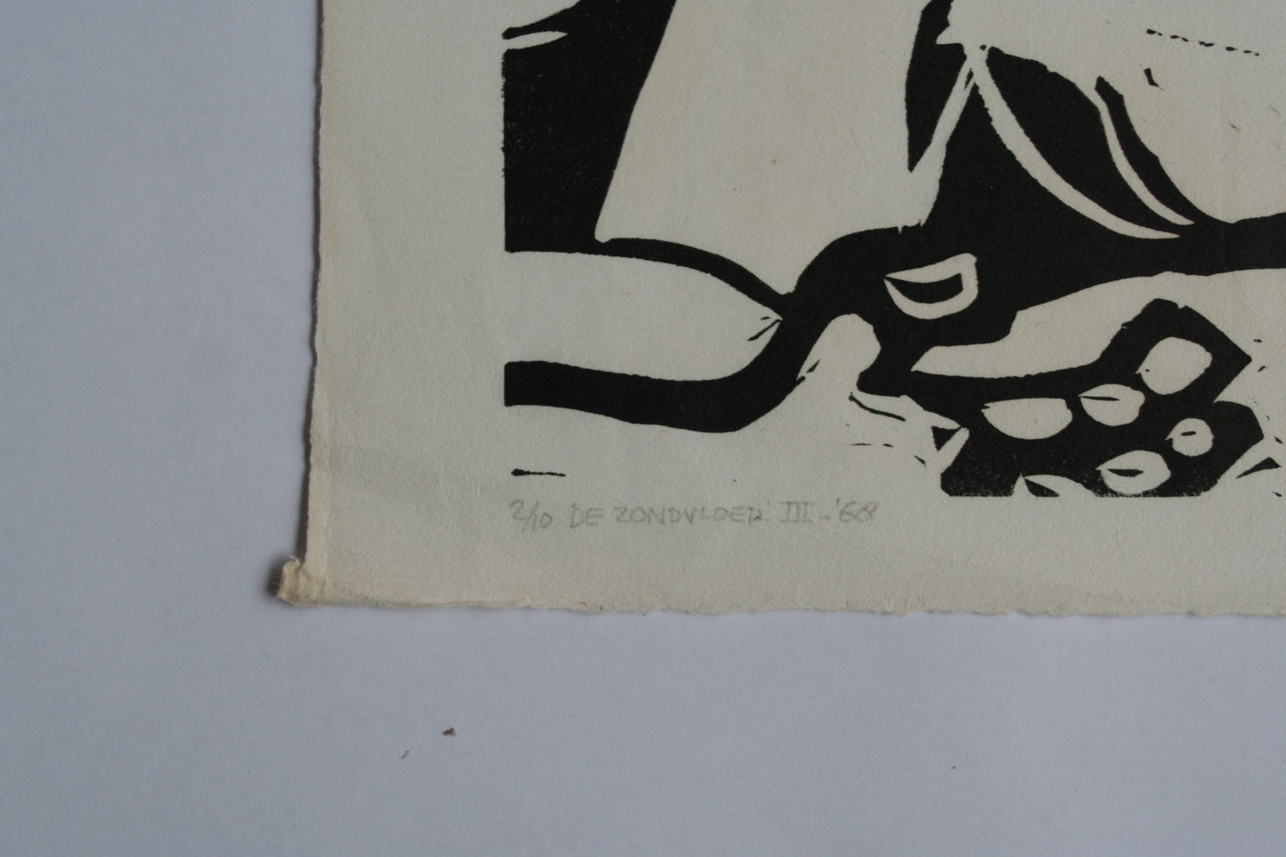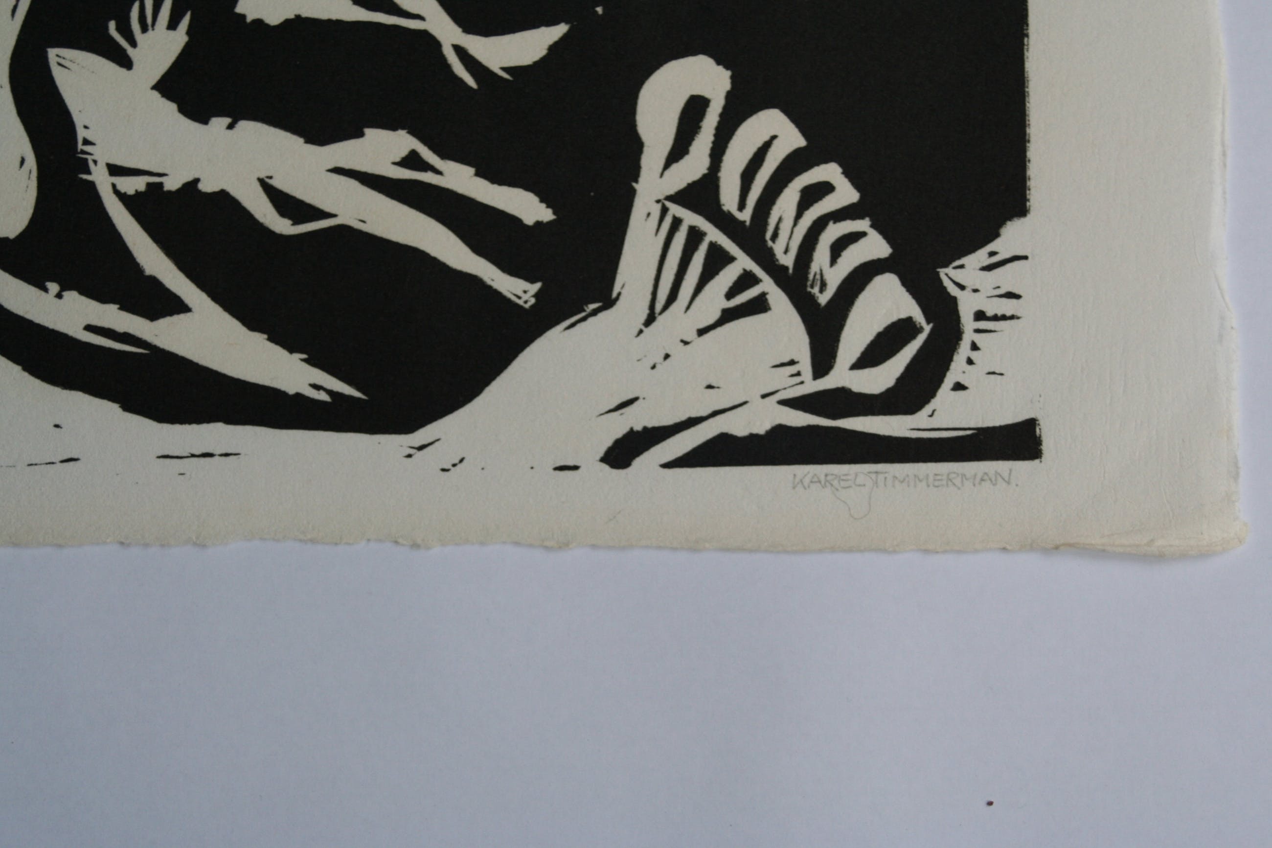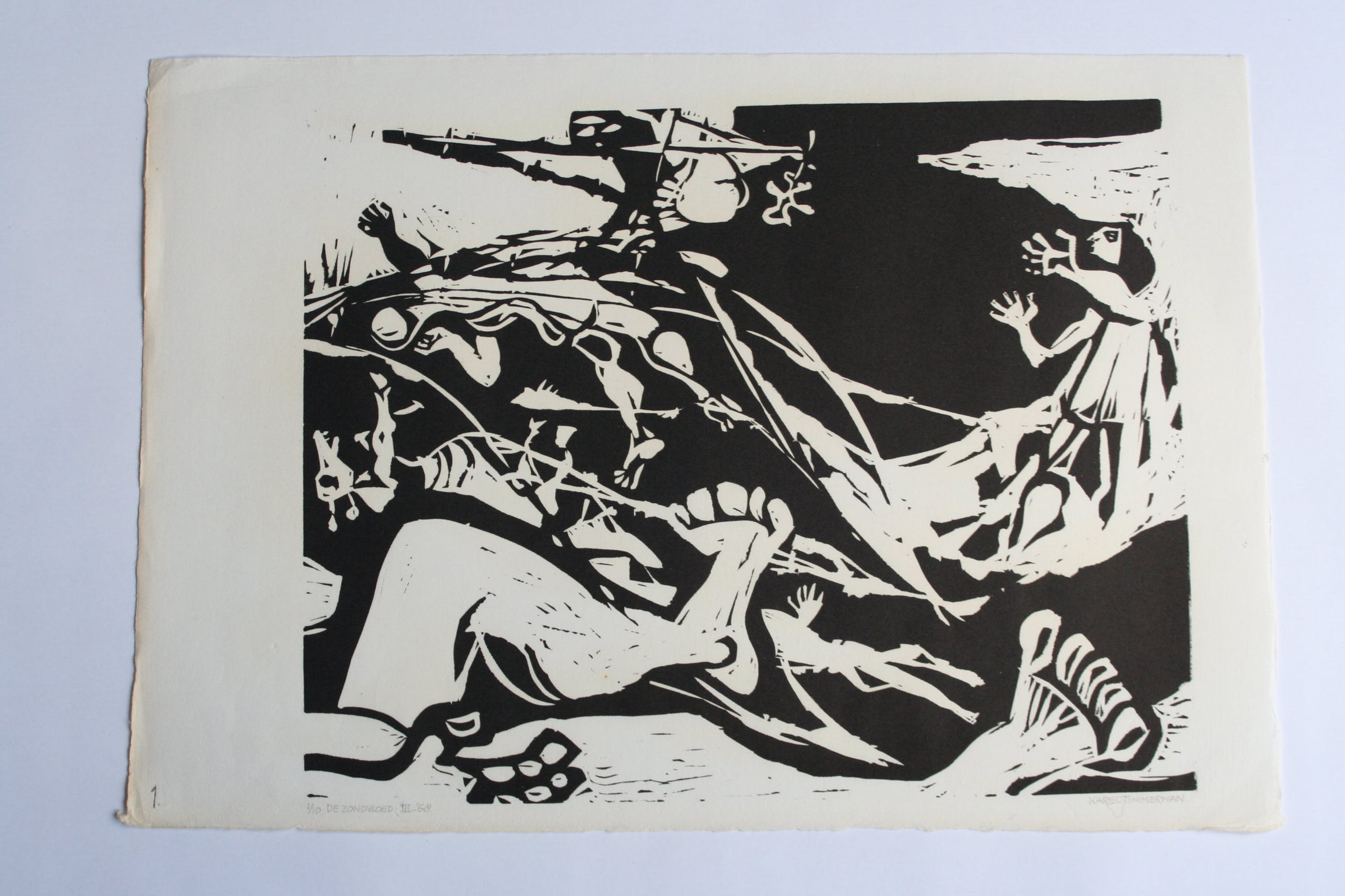 Linodruk van Karel Timmerman. Geïnspireerd op bijbels verhaal van de Zondvloed. Genummerd 2/10. Wordt plat verzonden