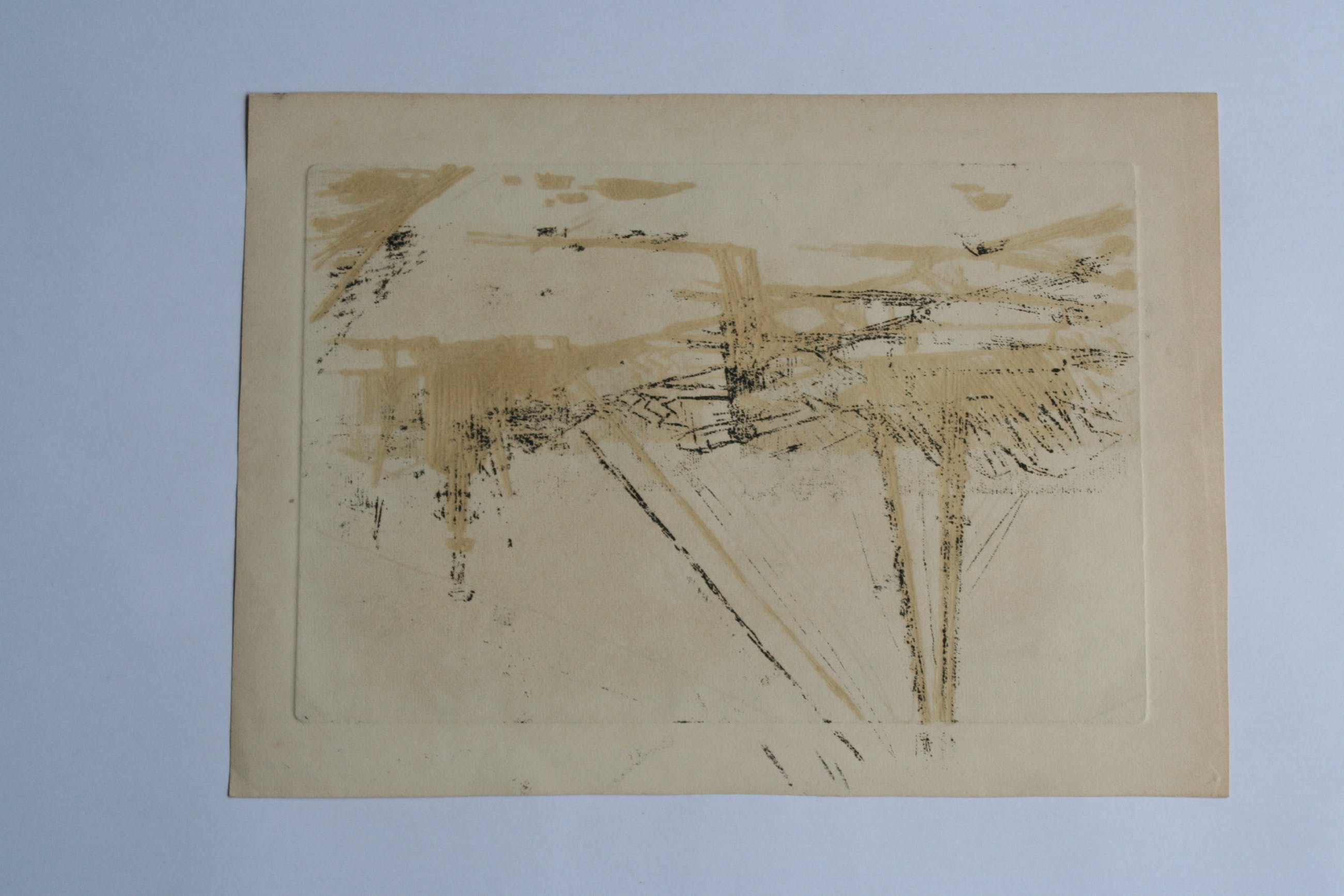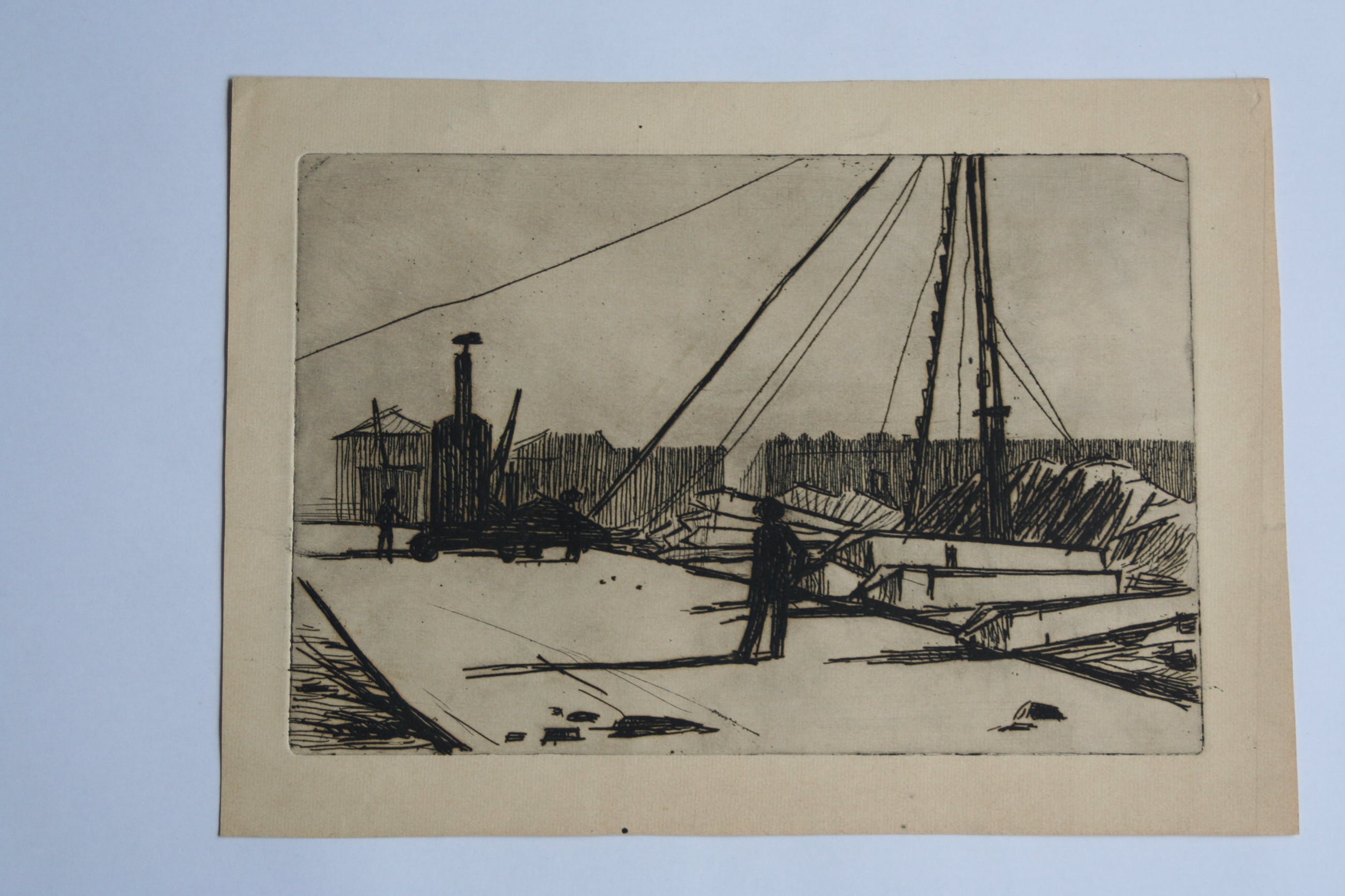 Ets van Karel Timmerman. Niet gesigneerd, wel gegarandeerd, ik verkocht eerder werk van hem. De afbeelding is 27,5 breed en 18,5 hoog. Afbeelding van een kraan en palen en arbeiders.