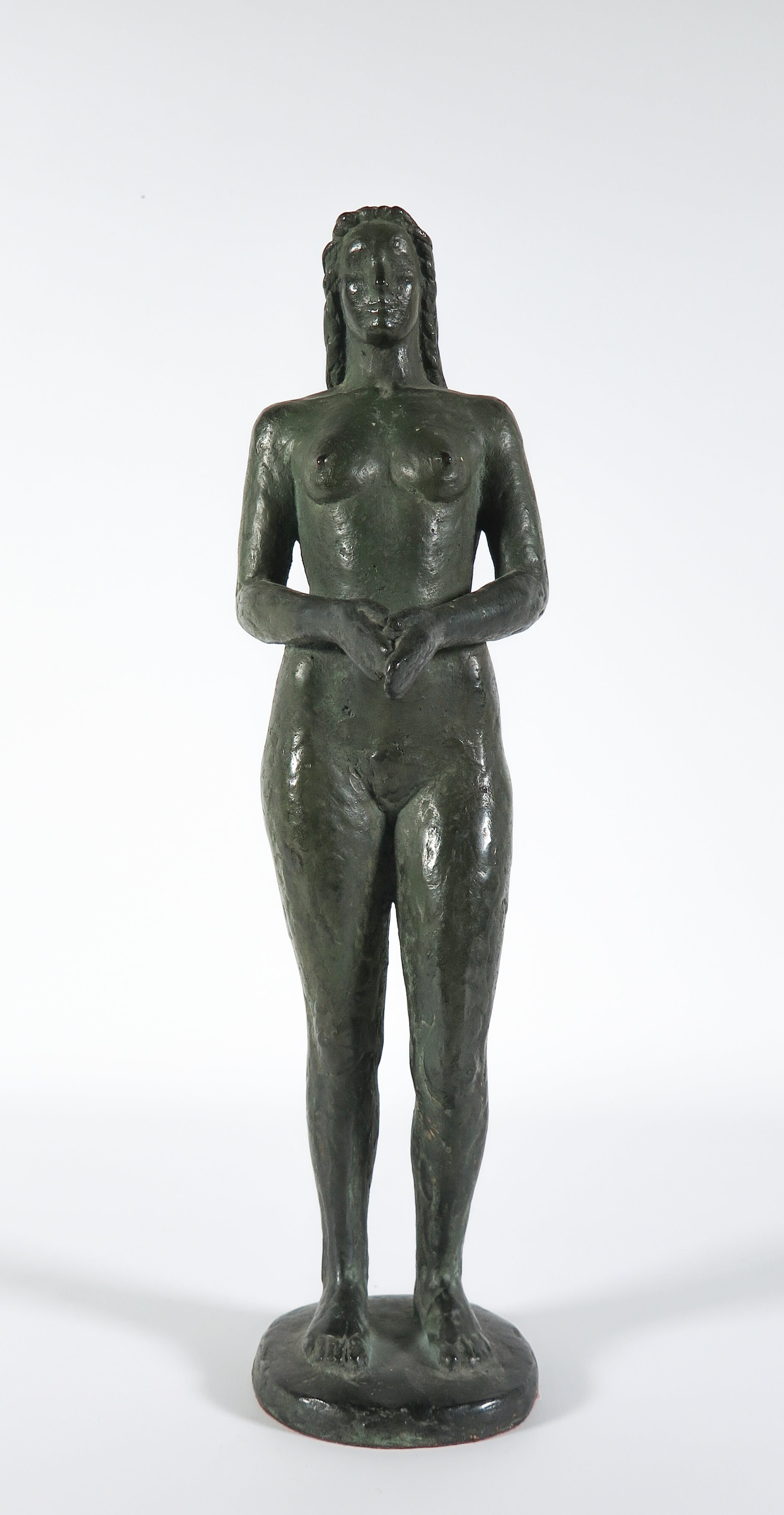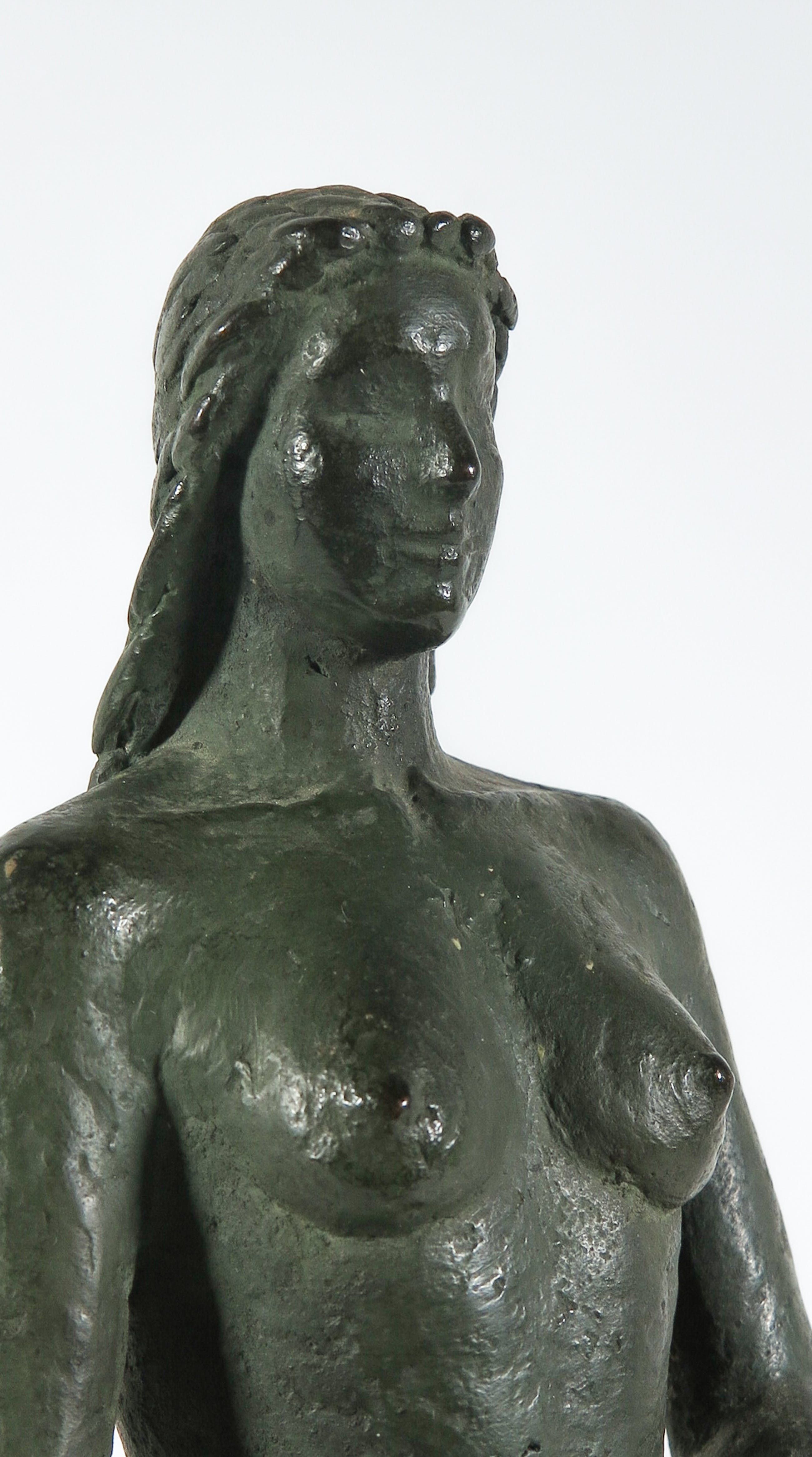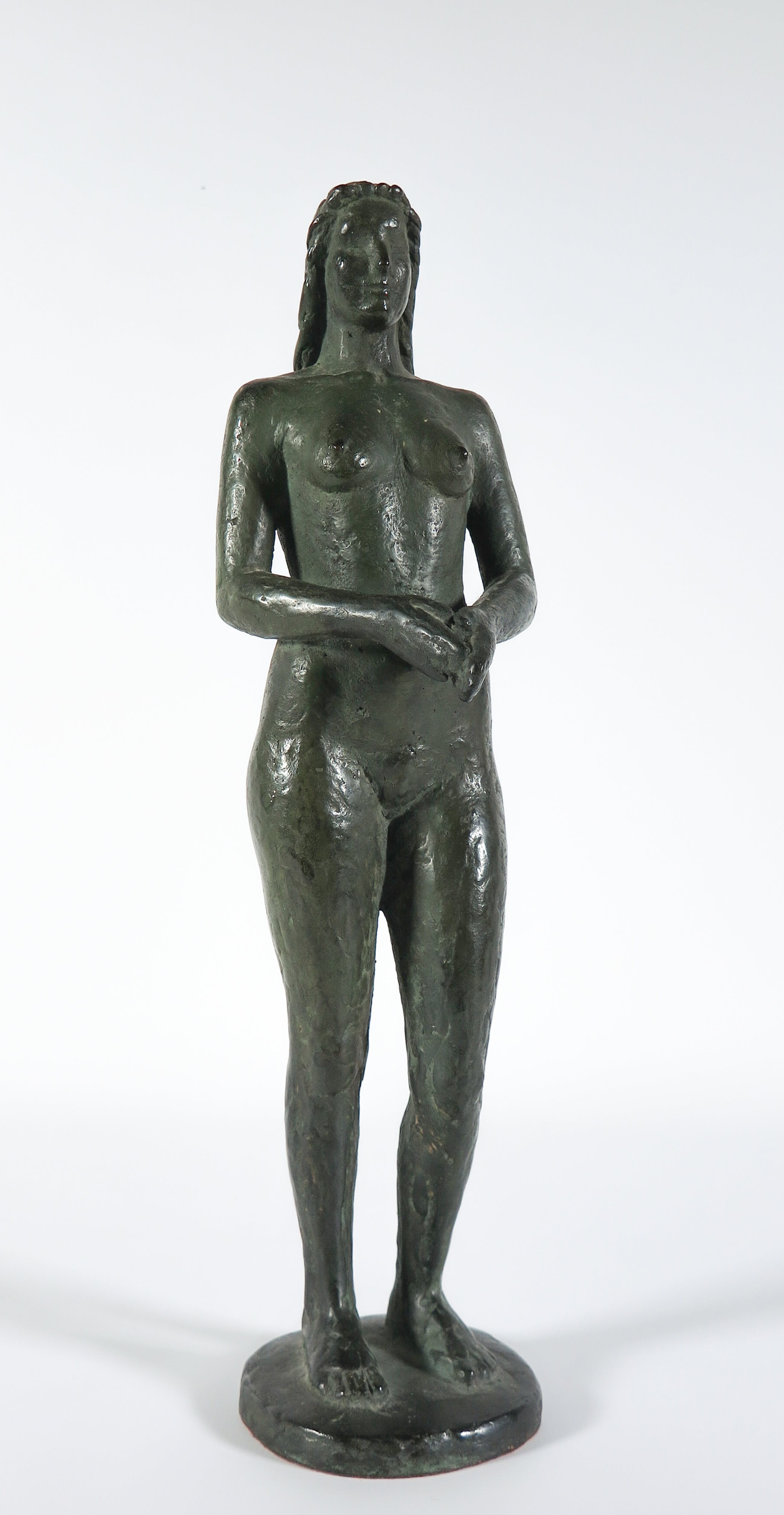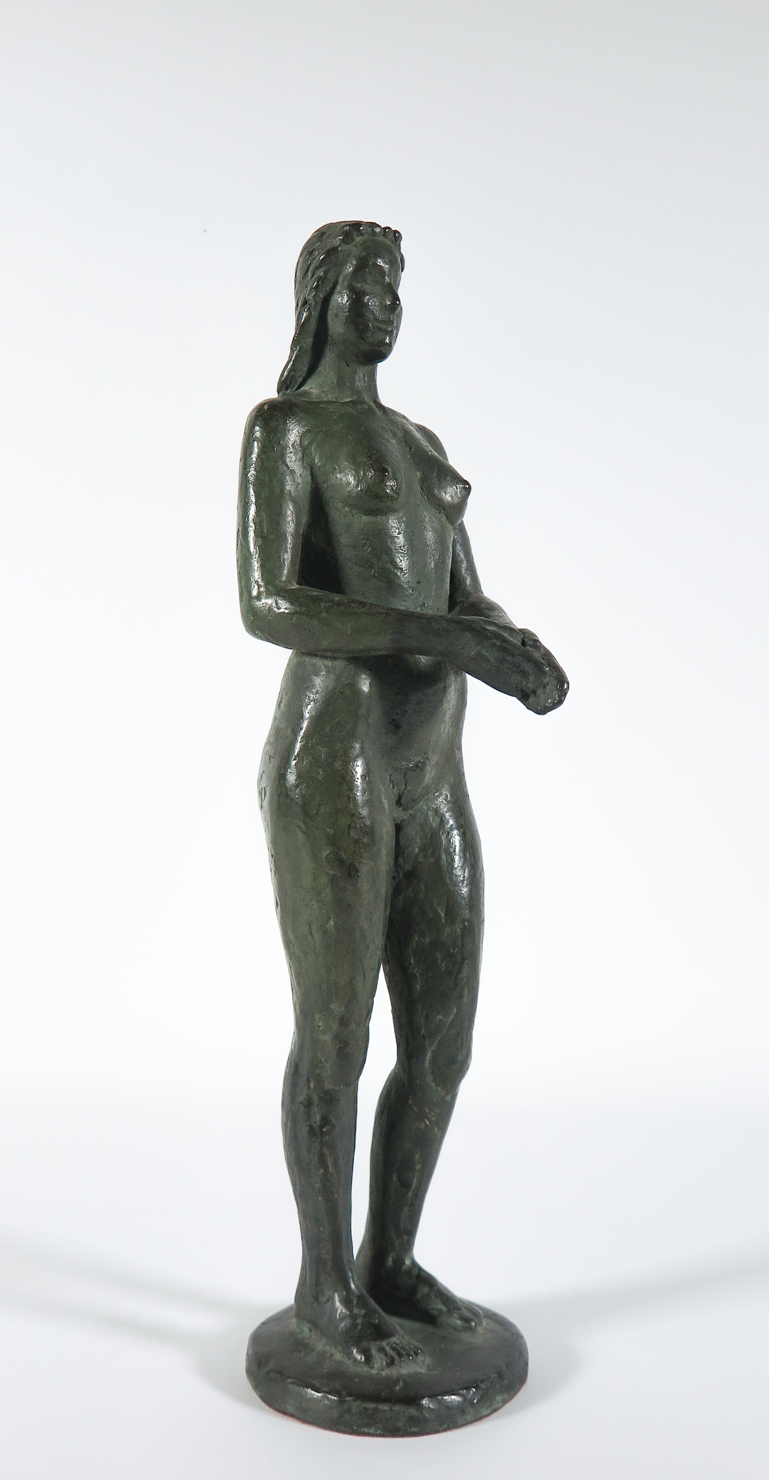 Staand bronzen naakt, getiteld Gwen, door de Amsterdamse kunstenares Karin Beek.