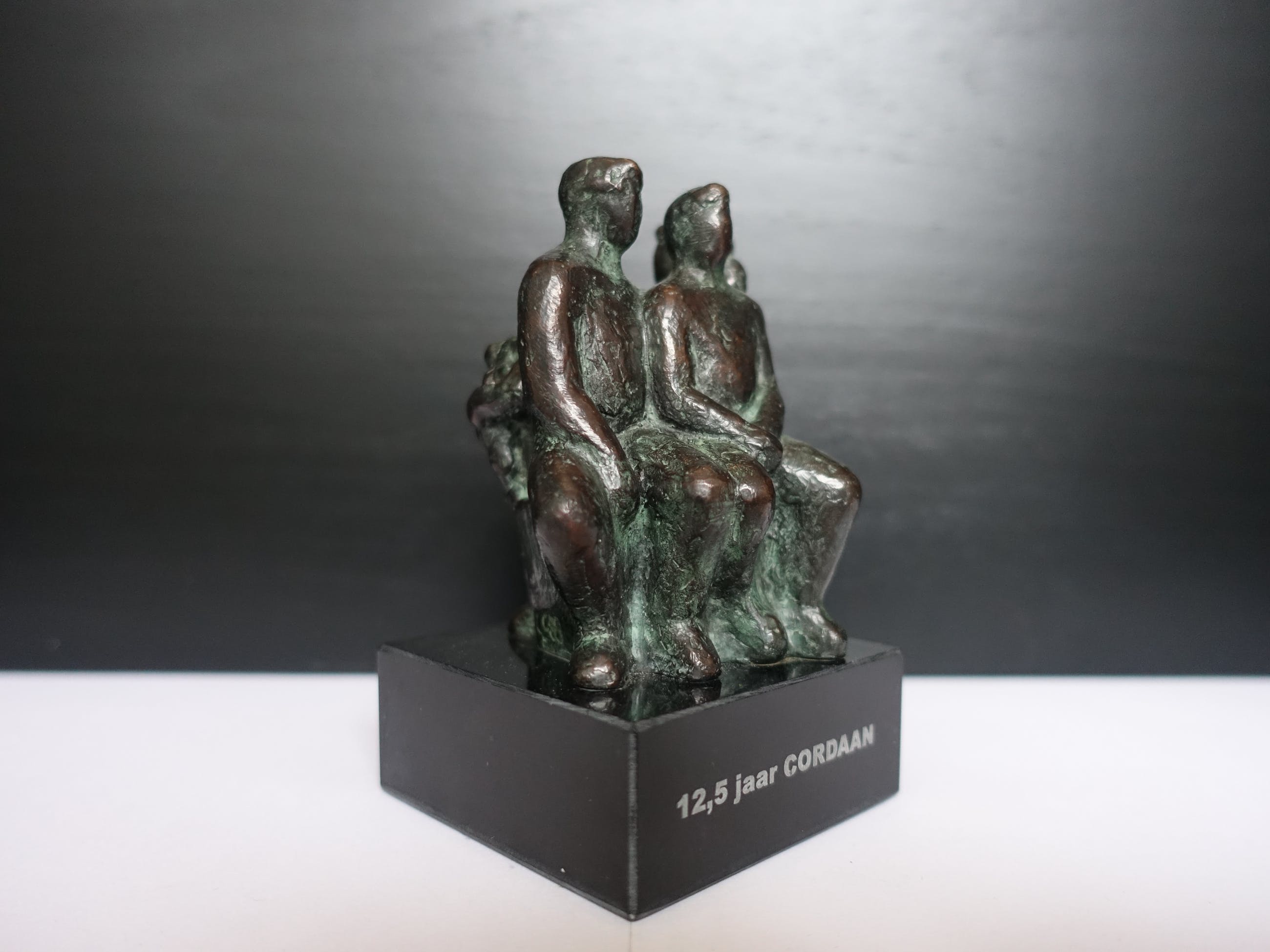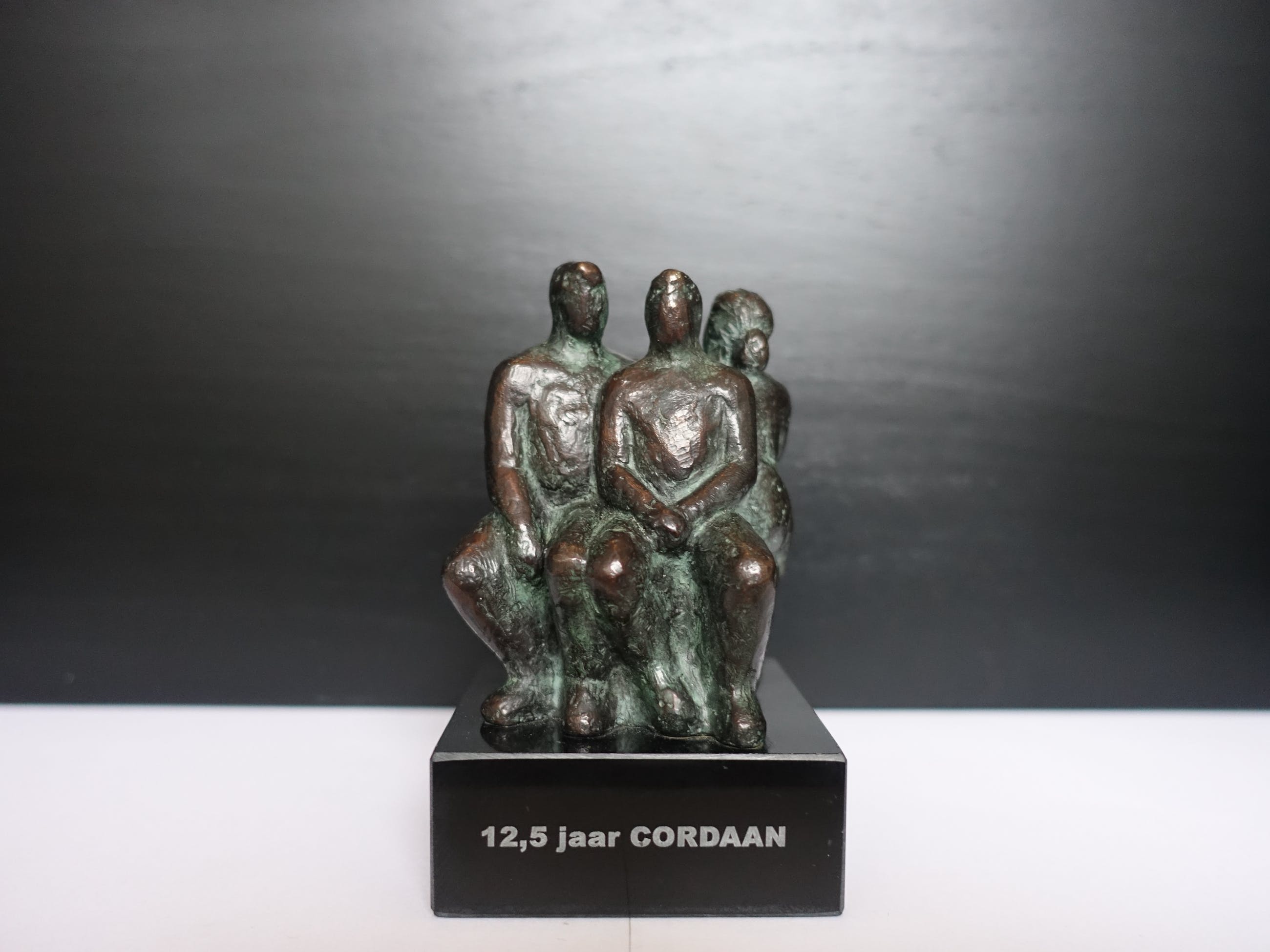Bronzen beeldje van een groep menselijke figuren genaamd "familie". Het bronzen beeld staat op een voetje met hierop de tekst "12,5 jaar Cordaan". Het brons is gesigneerd met initialen . De afmetingen zijn inclusief de sokkel.