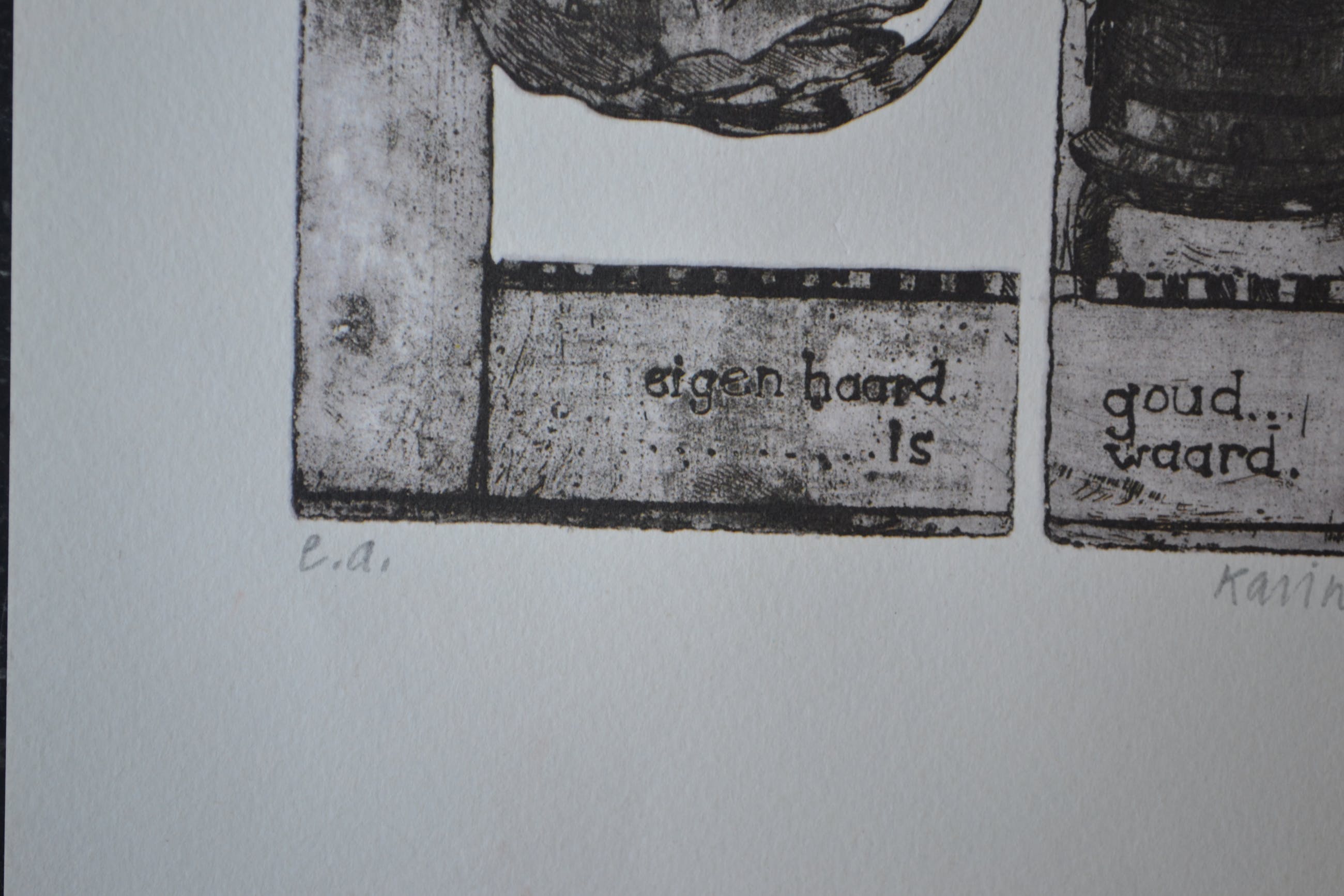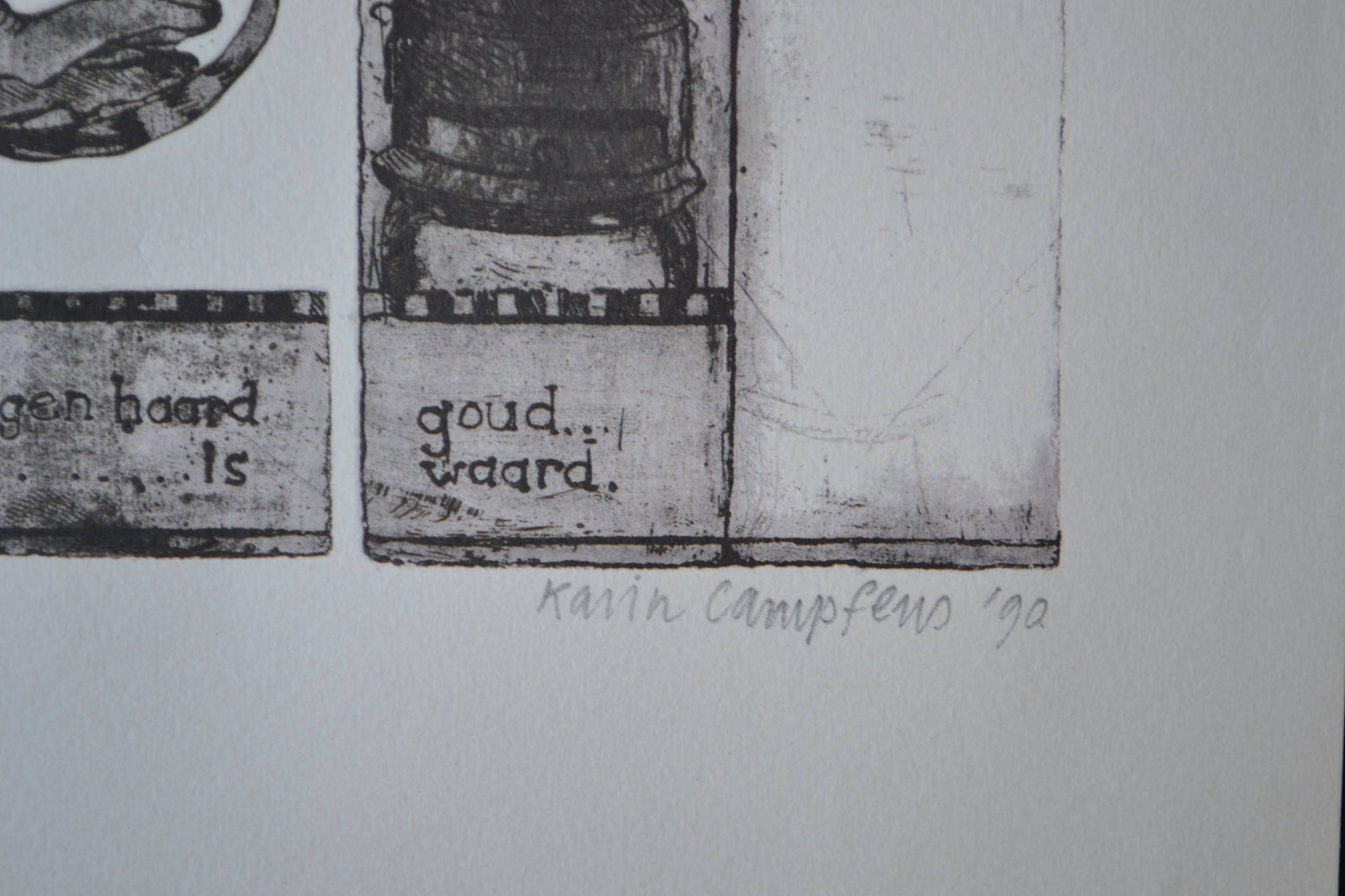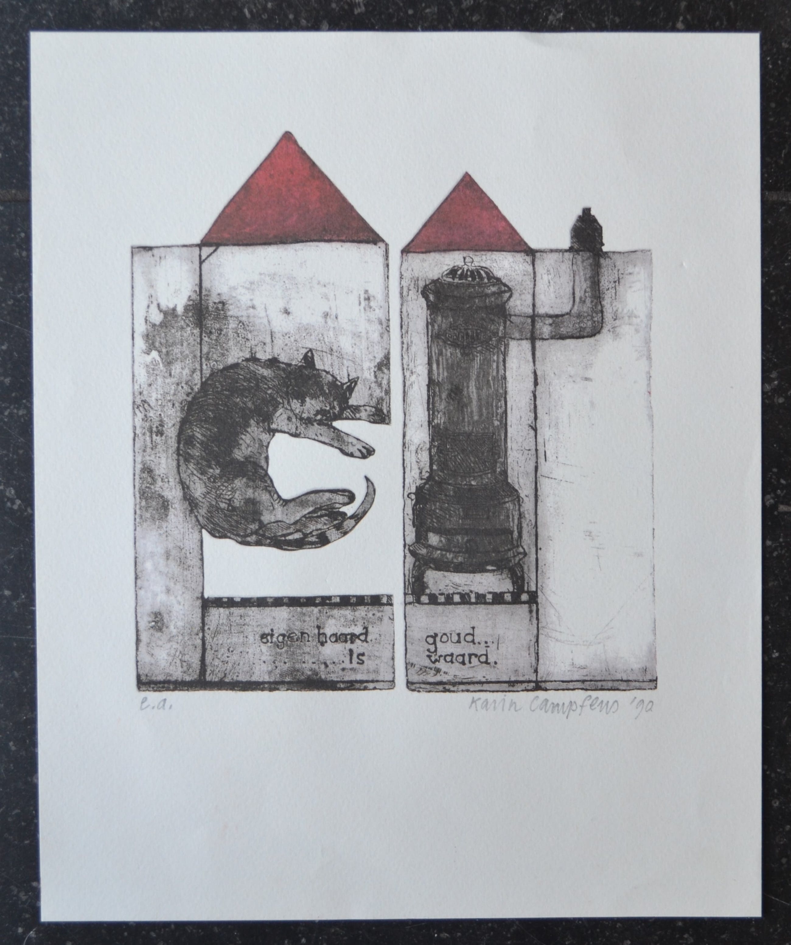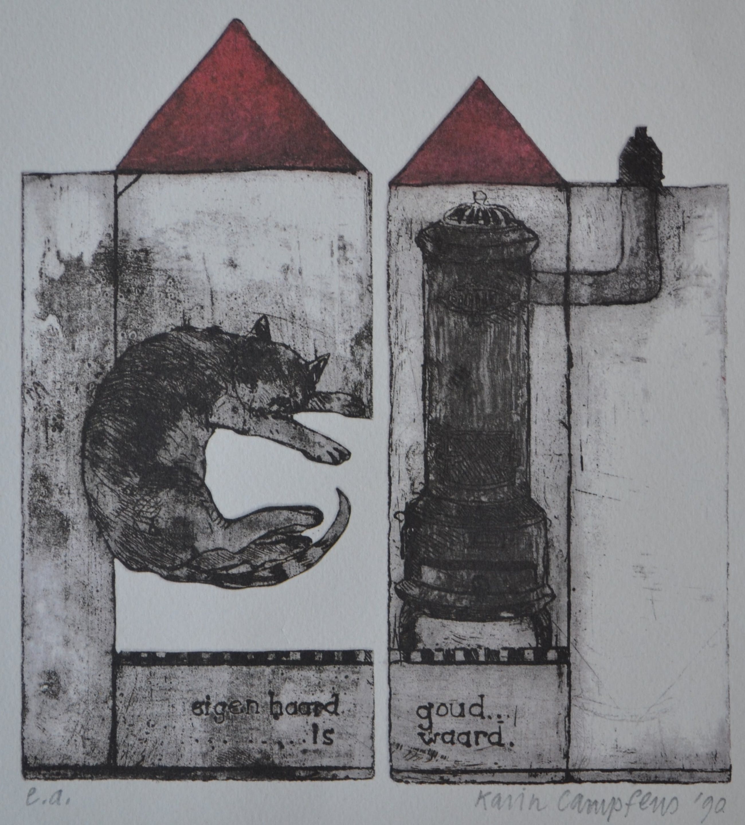 Litho uit de bekende serie van Karin Campfens. het betreft hier 'Eigen haard is goud waard'. Rechtsonder in potlood gesigneerd. In uitstekende conditie. Wordt goed verpakt en aangetekend verstuurd.