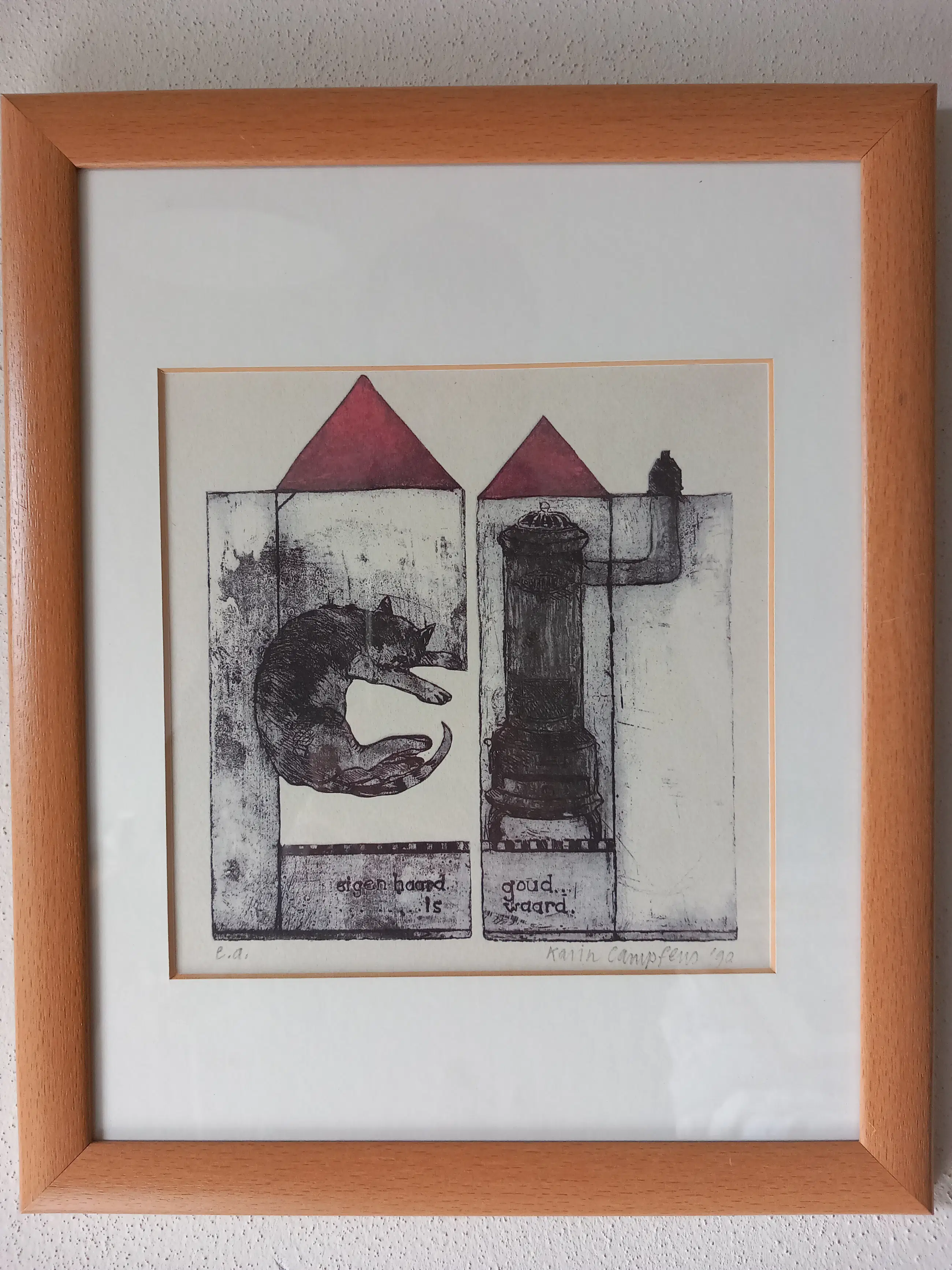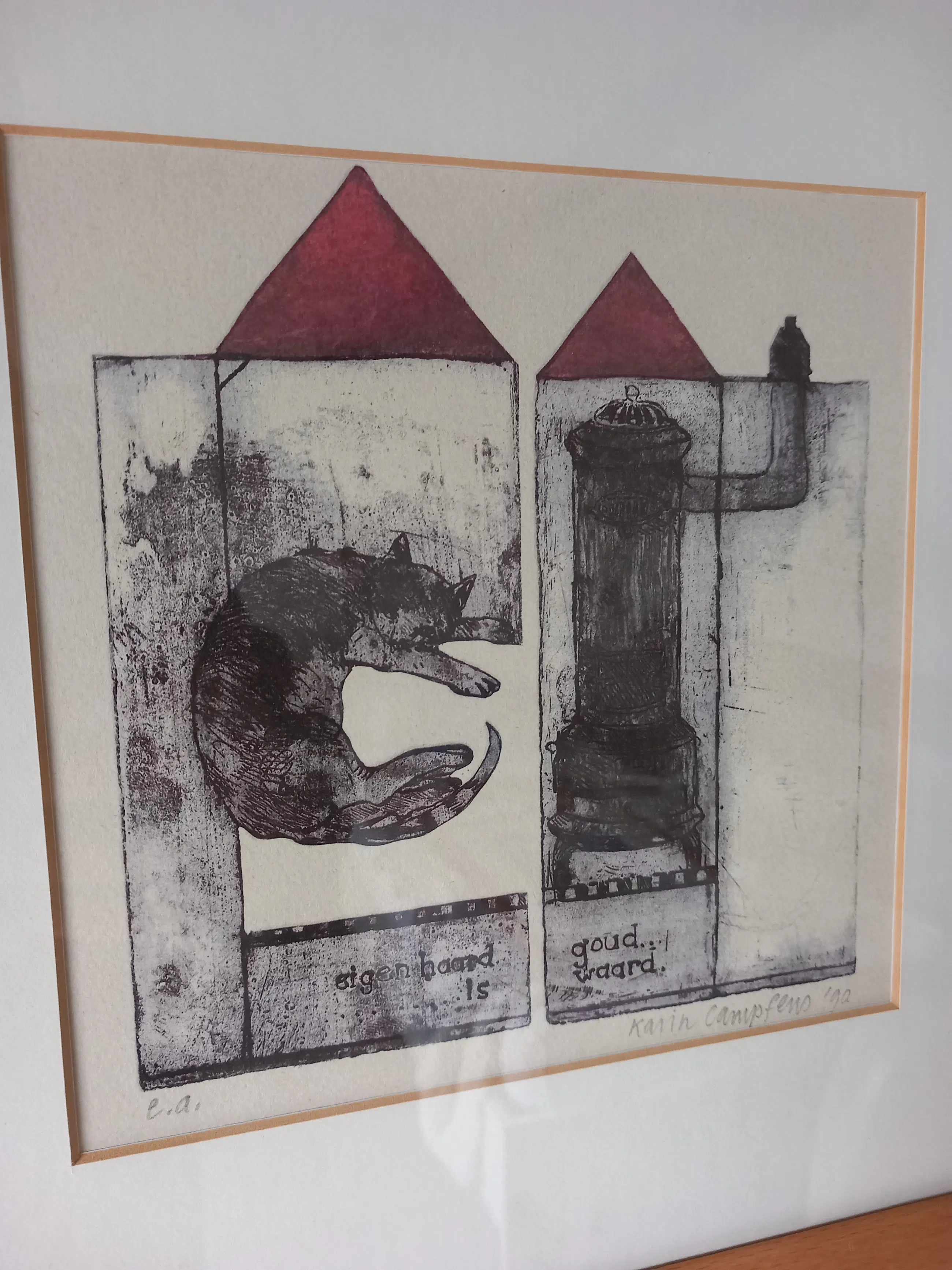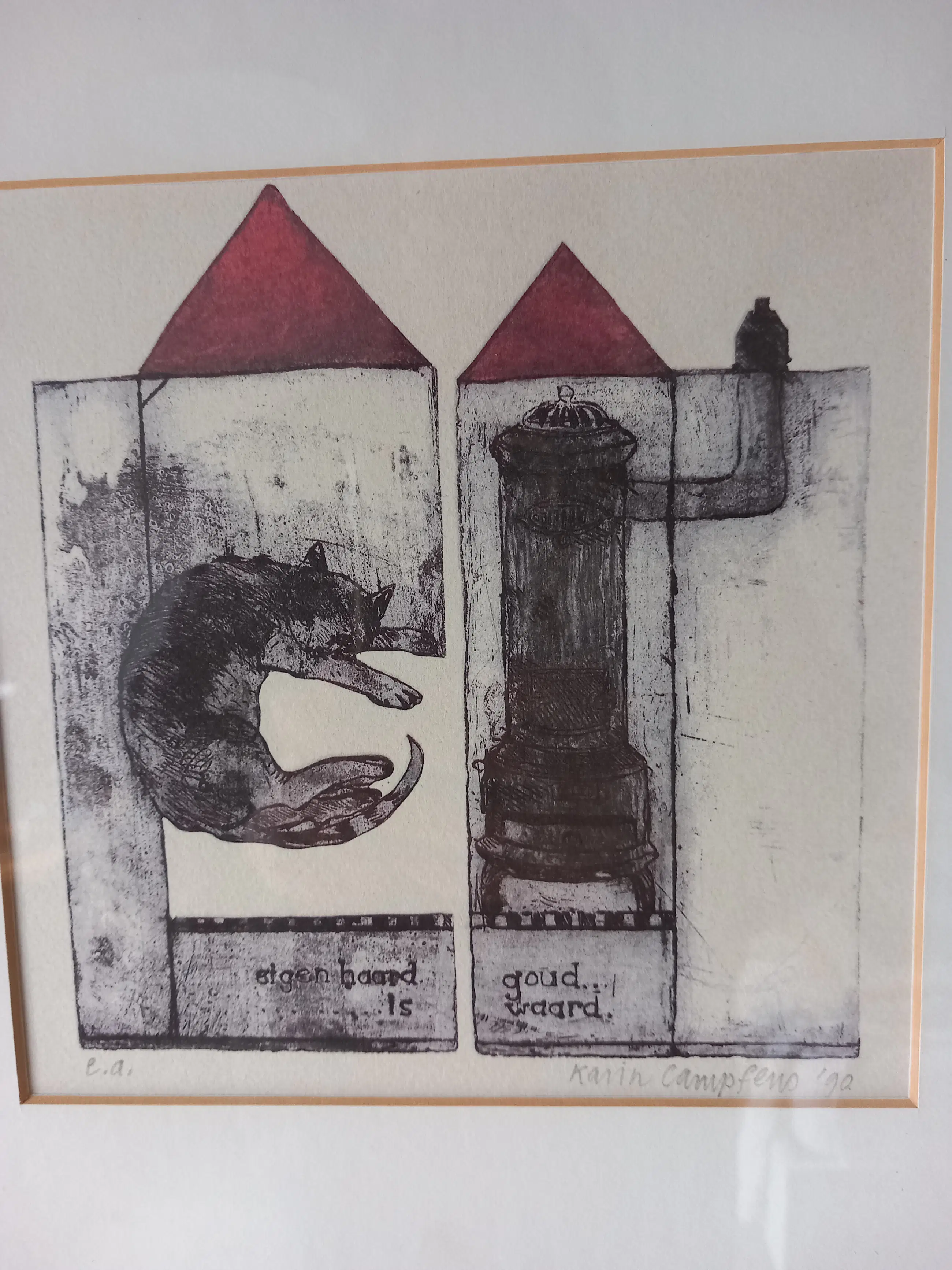 Fraaie kleurenets van Karin Campfens omstreeks 1990 met een abstracte verbeelding van een huiselijke scene, waarbij een kat zich heeft neergevlijd naast een ouderwetse potkachel. In de afbeelding verwerkt de spreuk Eigen haard is goud waard. Ets ingelijst met passe-partout in een nette lijst (kunststof imitatie van hout). Ets en lijst in gebruikte maar nette staat, met mogelijk kleine gebruikssporen maar geen grote gebreken.
