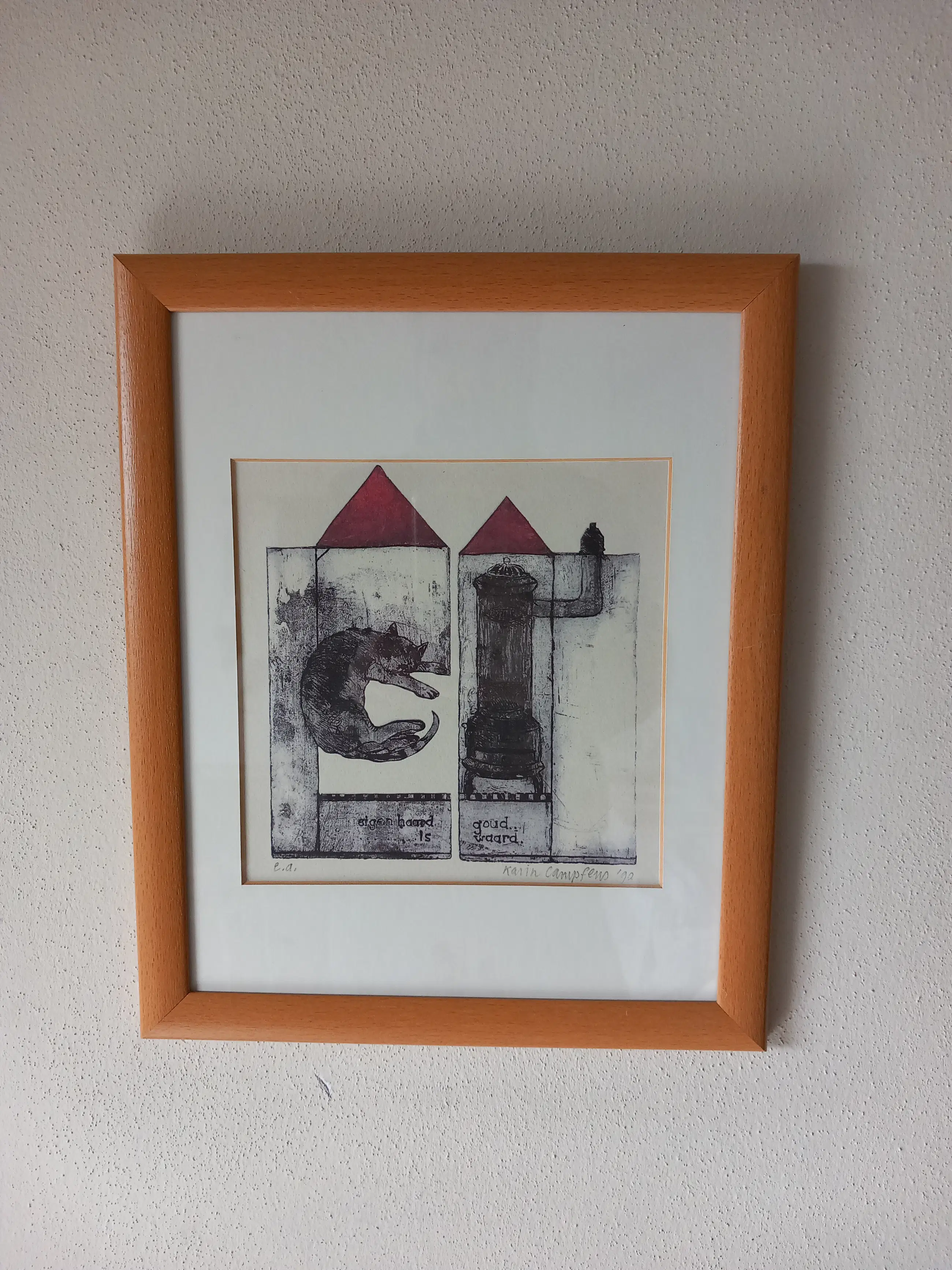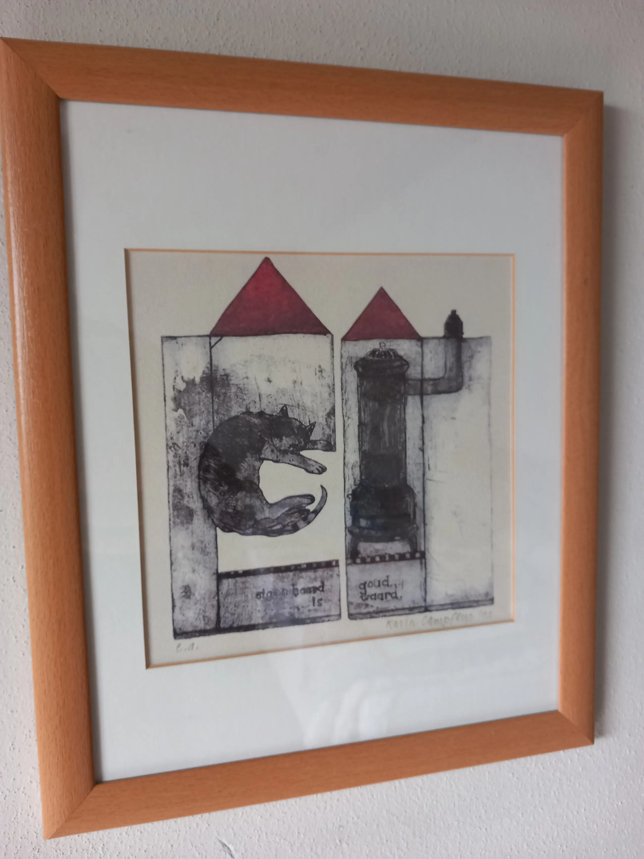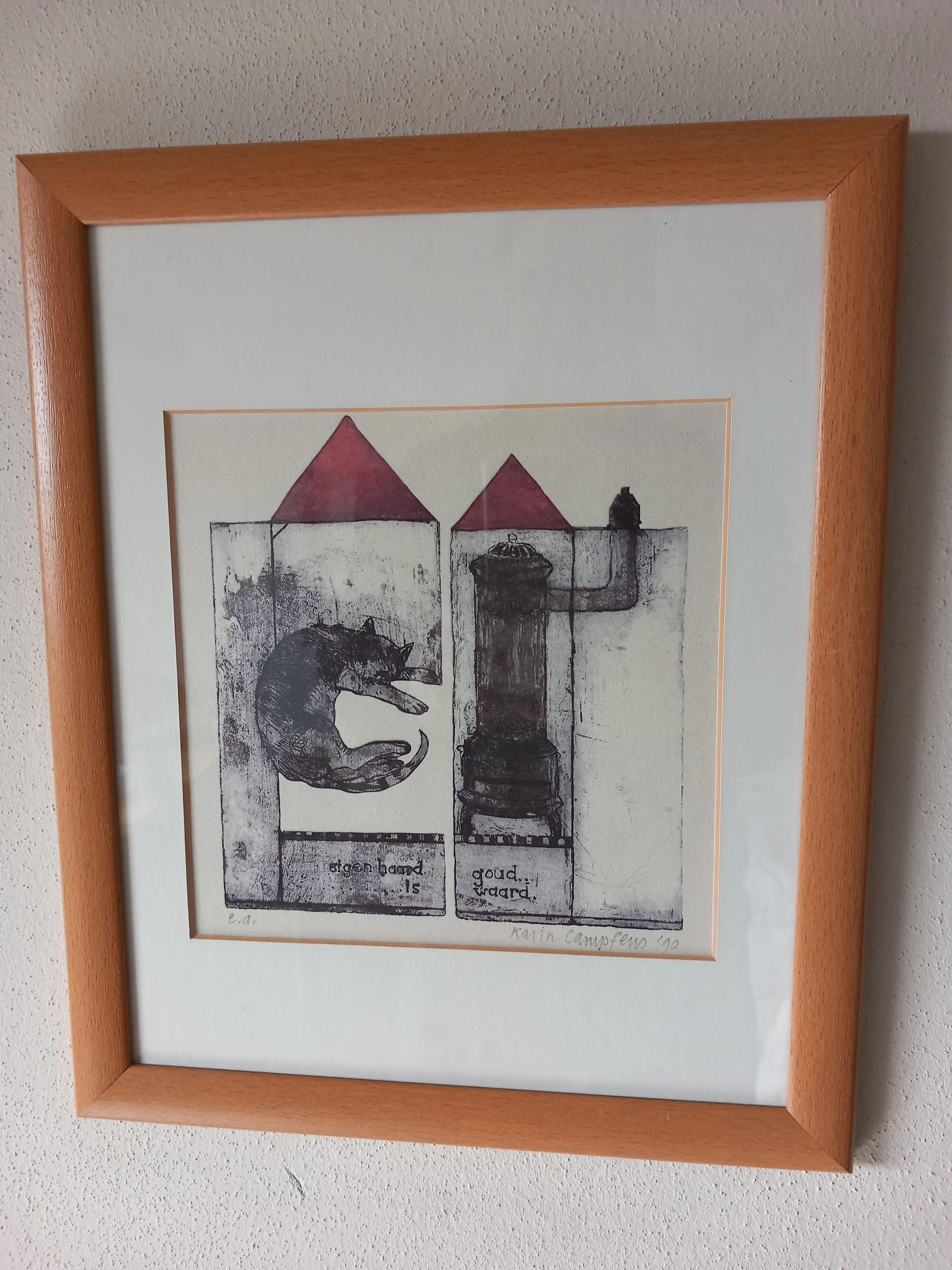 Fraaie kleurenets van Karin Campfens omstreeks 1990 met een abstracte verbeelding van een huiselijke scene, waarbij een kat zich heeft neergevlijd naast een ouderwetse potkachel. In de afbeelding verwerkt de spreuk Eigen haard is goud waard. Ets ingelijst met passe-partout in een nette lijst (kunststof imitatie van hout). Ets en lijst in gebruikte maar nette staat, met mogelijk kleine gebruikssporen maar geen grote gebreken.