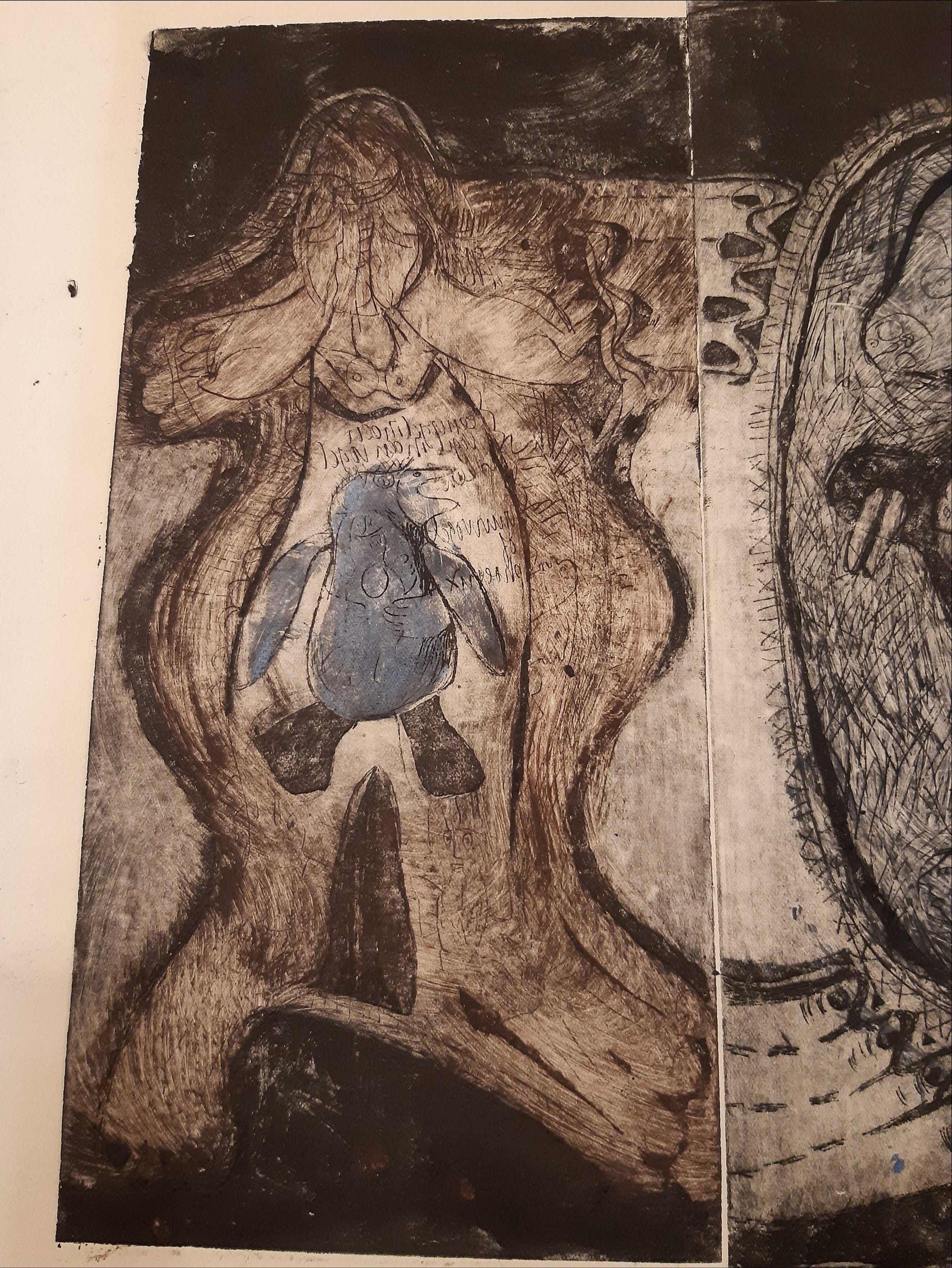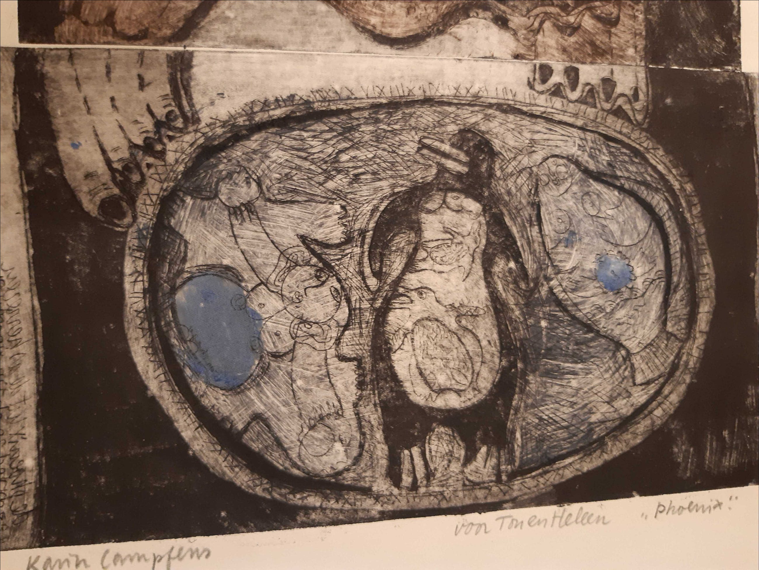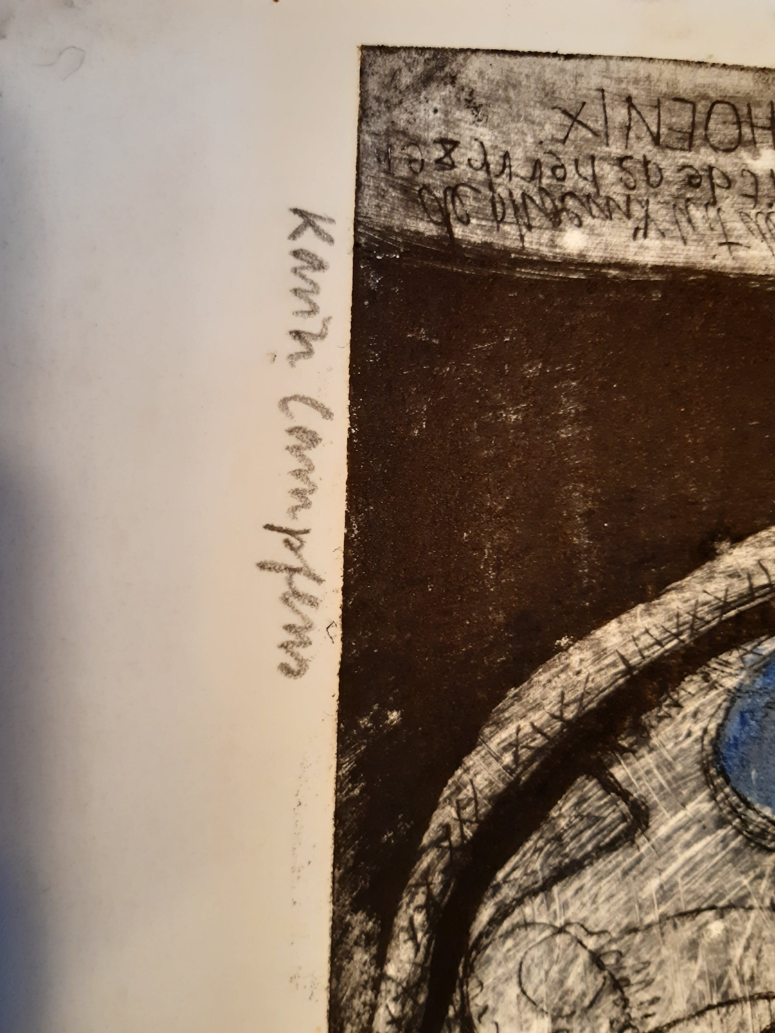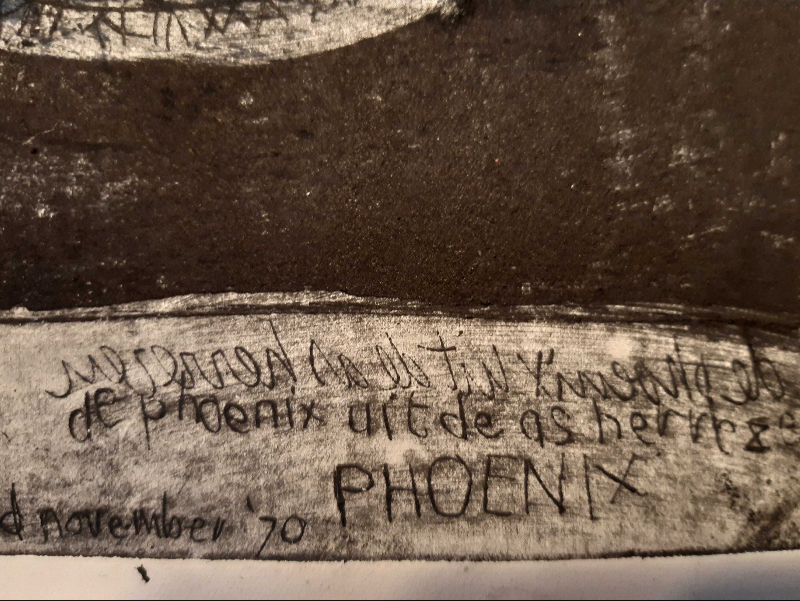 De ets is in goede staat. Op de hoeken van het blanke papier, bruine vlekken (zie foto) en rechtsonder papier stukje afgescheurd. Gesigneerd met potlood.Getiteld: 'Phoenix'Geschenk voor 'Ton en Heleen'.