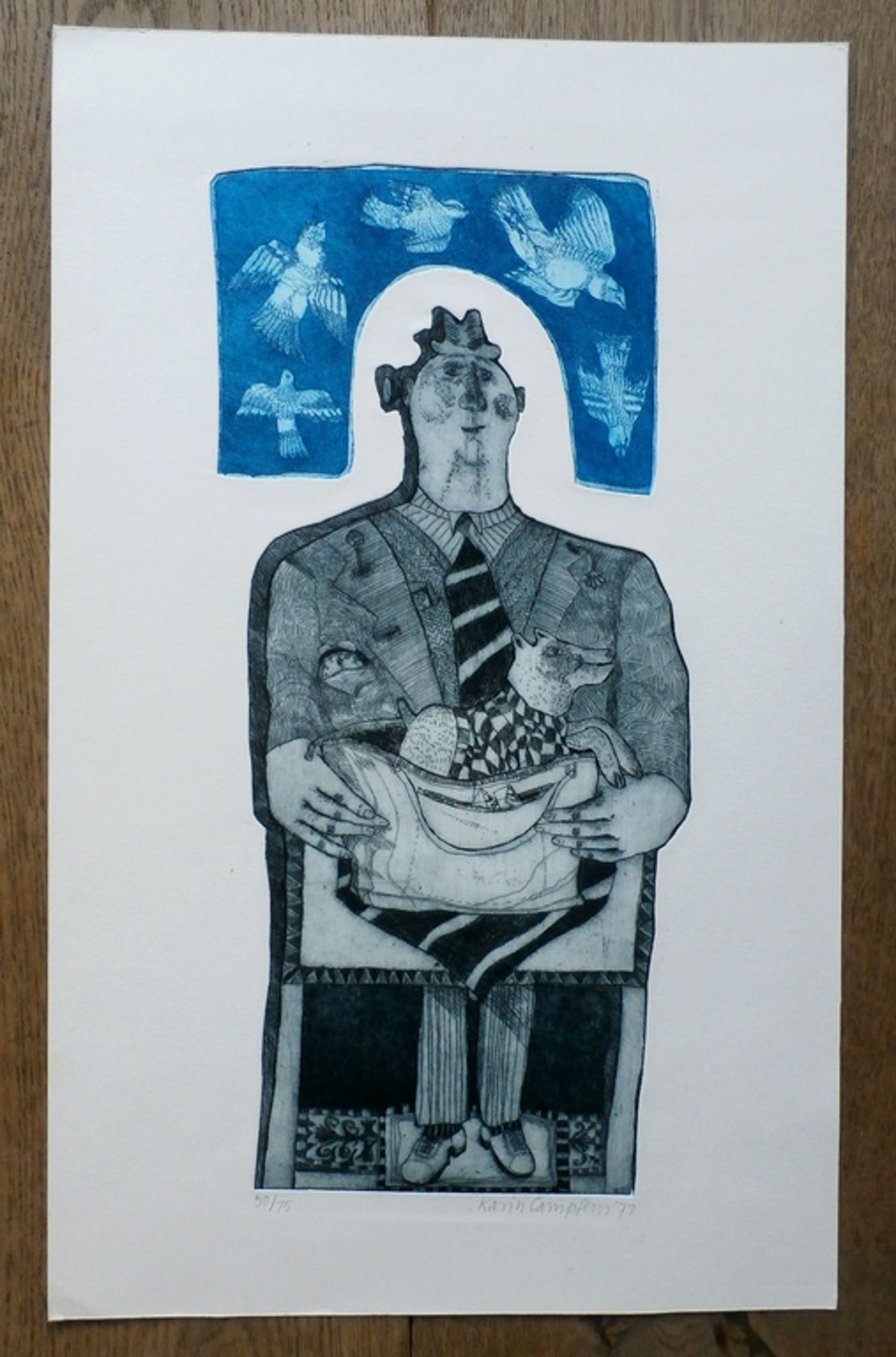 Ets van Karin Campfens uit 1977. Nummer: 50/75. Afmetingen blad: H42,5 x b27 cm. Afmetingen voorstelling: H34 x b15 cm. De authenciteit van het, aangeboden, werk wordt voor 100% gegarandeerd. Conditie: in goede staat.