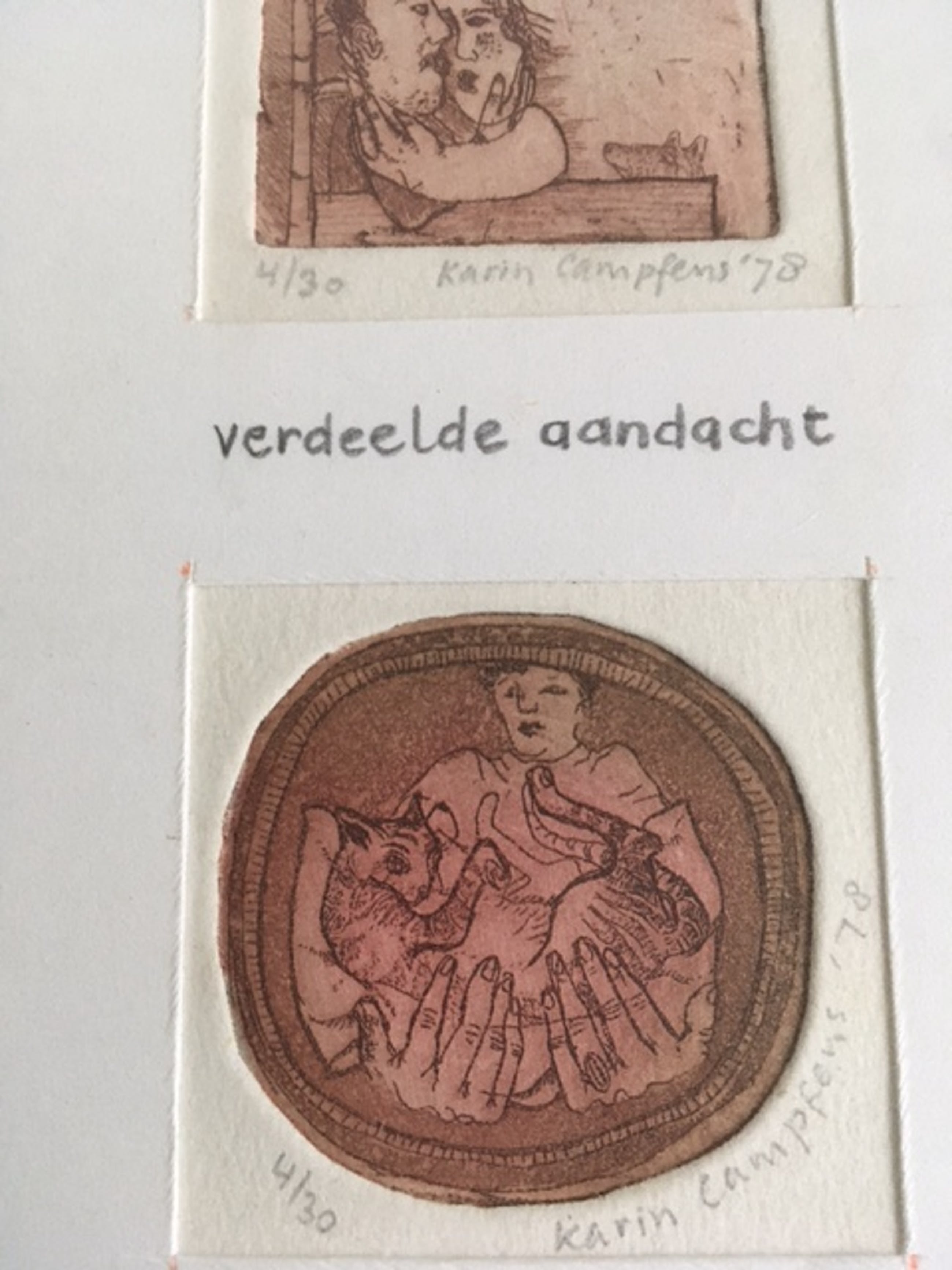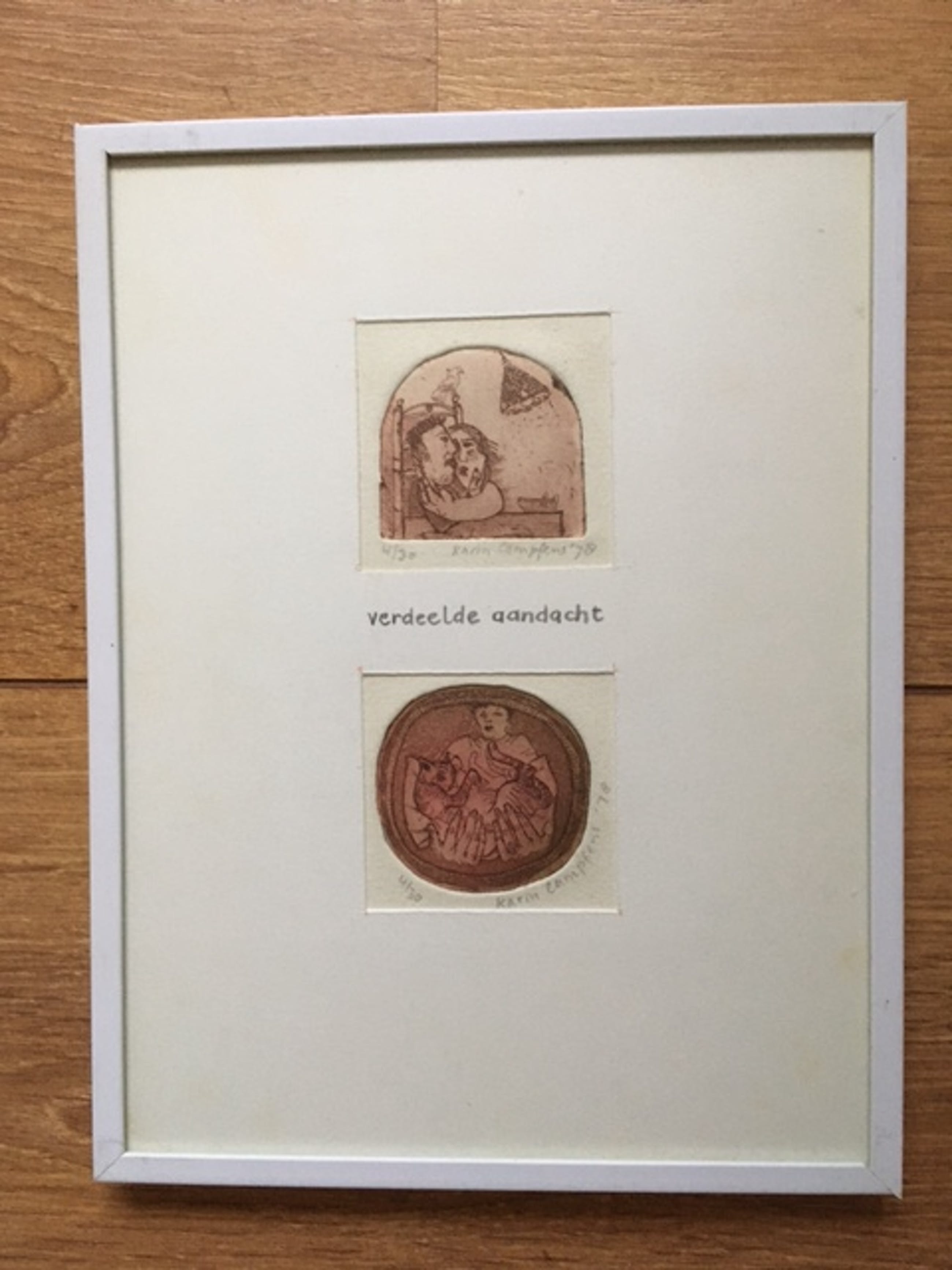 2 kleine etsjes van 8 x 7 in 1 lijst van 19 x 25 etsje 1: knuffelend stel etsje 2: vrouw met kat op schoot