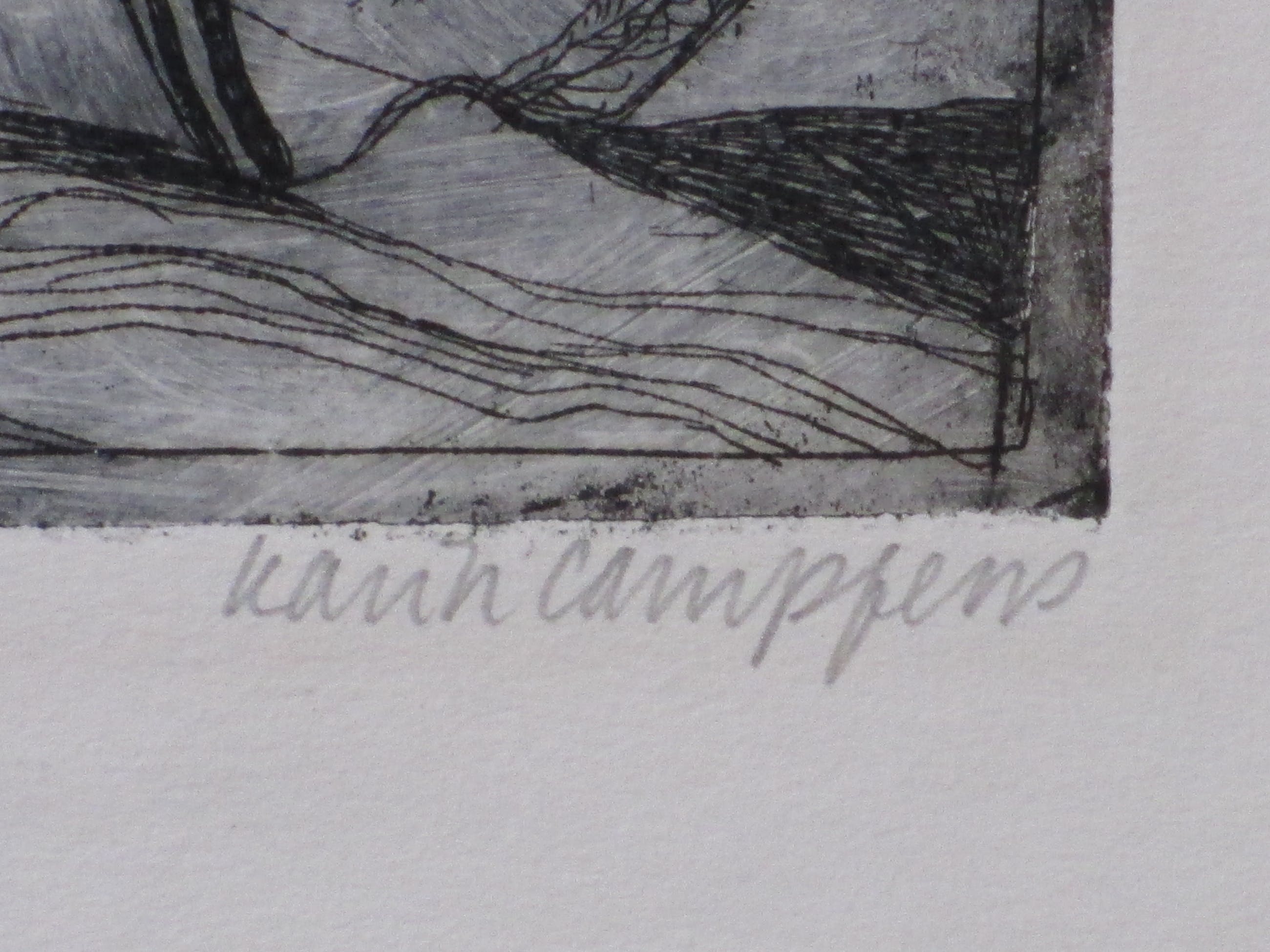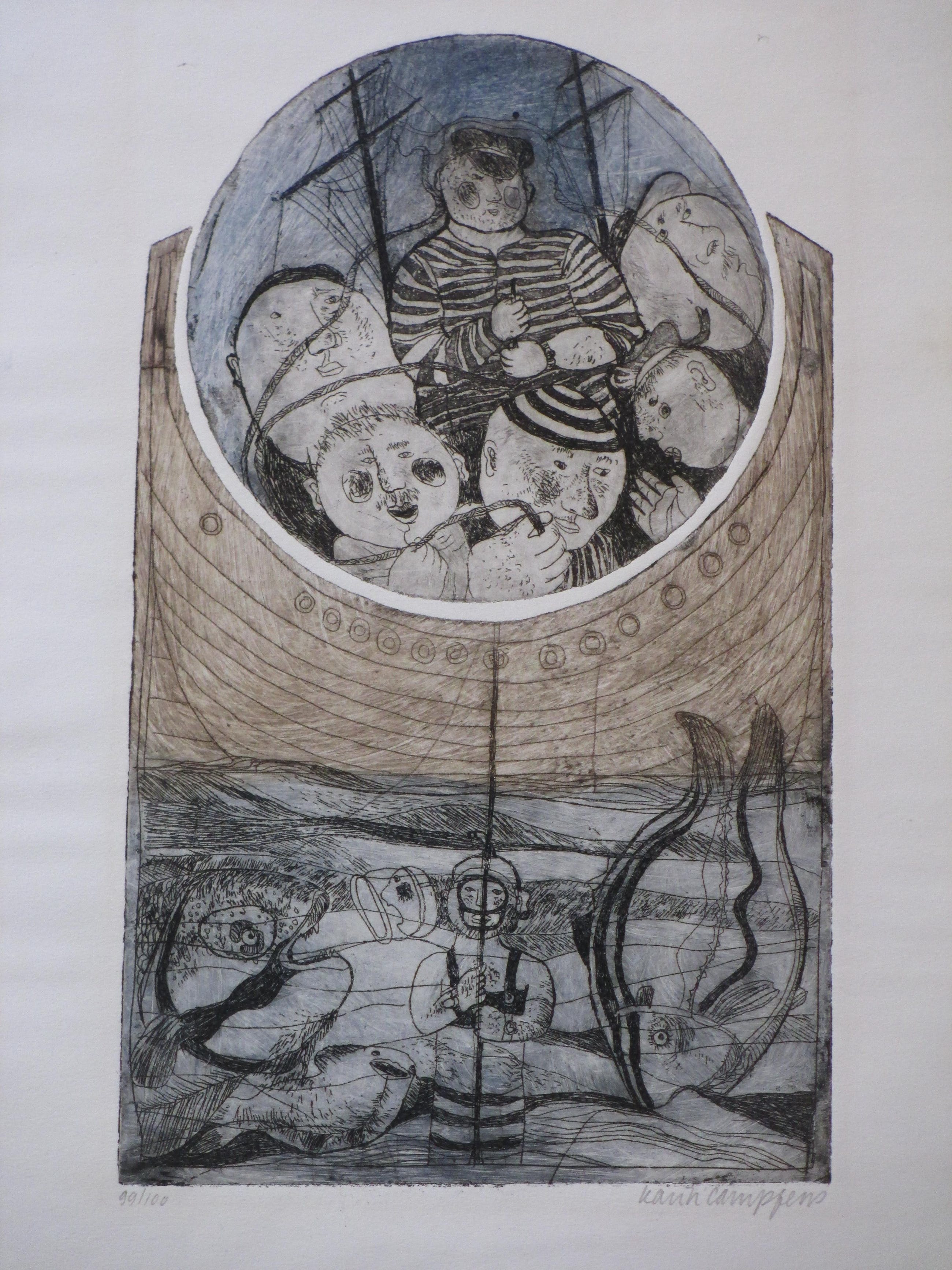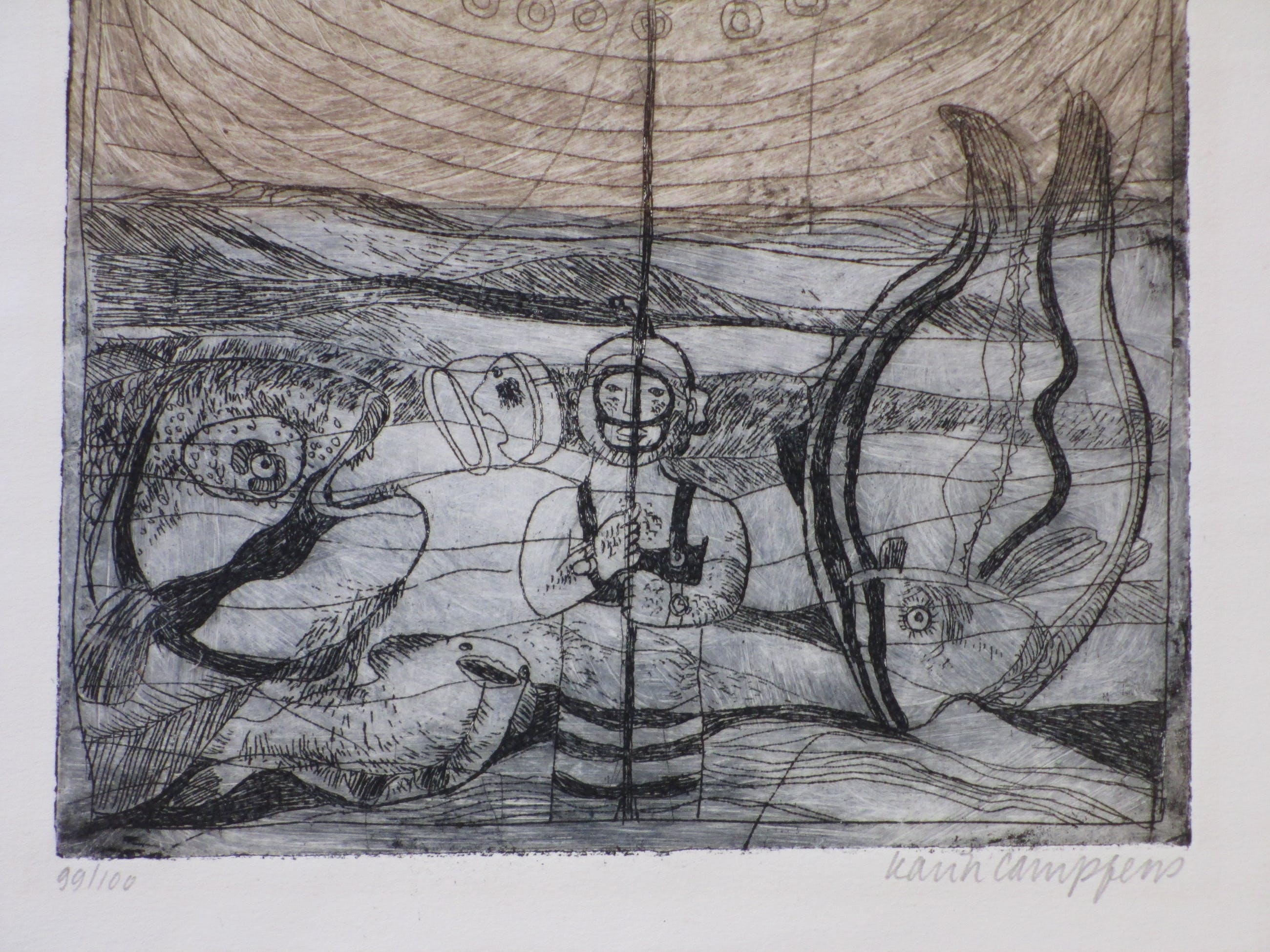Kleurets door Karin CampfensVoorstelling van het vissen(rs)(n)levenLosbladig, beeldmaat 33x20, bladmaat 42x30Gesigneerd in potlood r.o. ' Karin Campfens' Genummerd in potlood l.o. ' 99/100' Authenticiteit volledig gegarandeerd