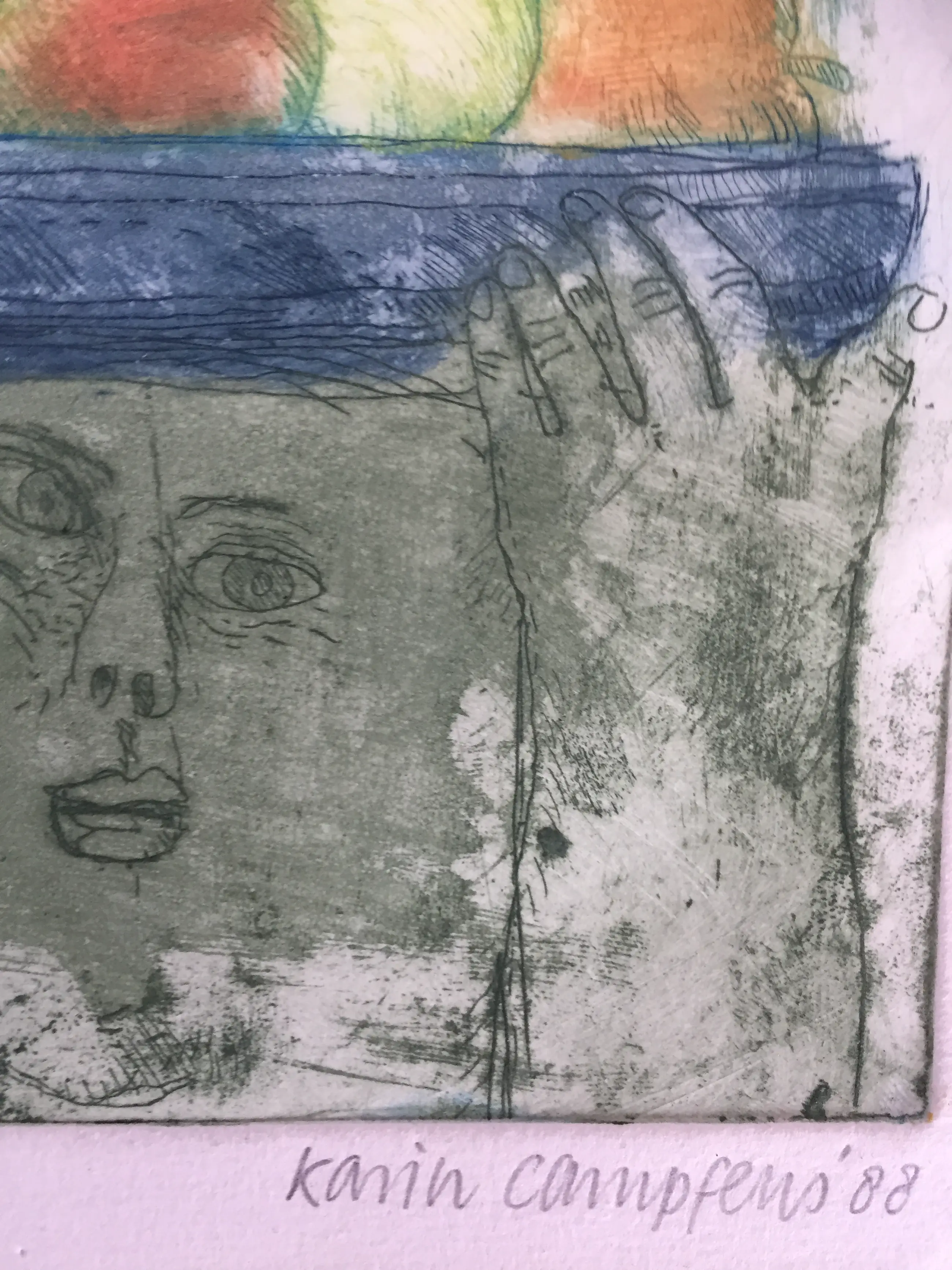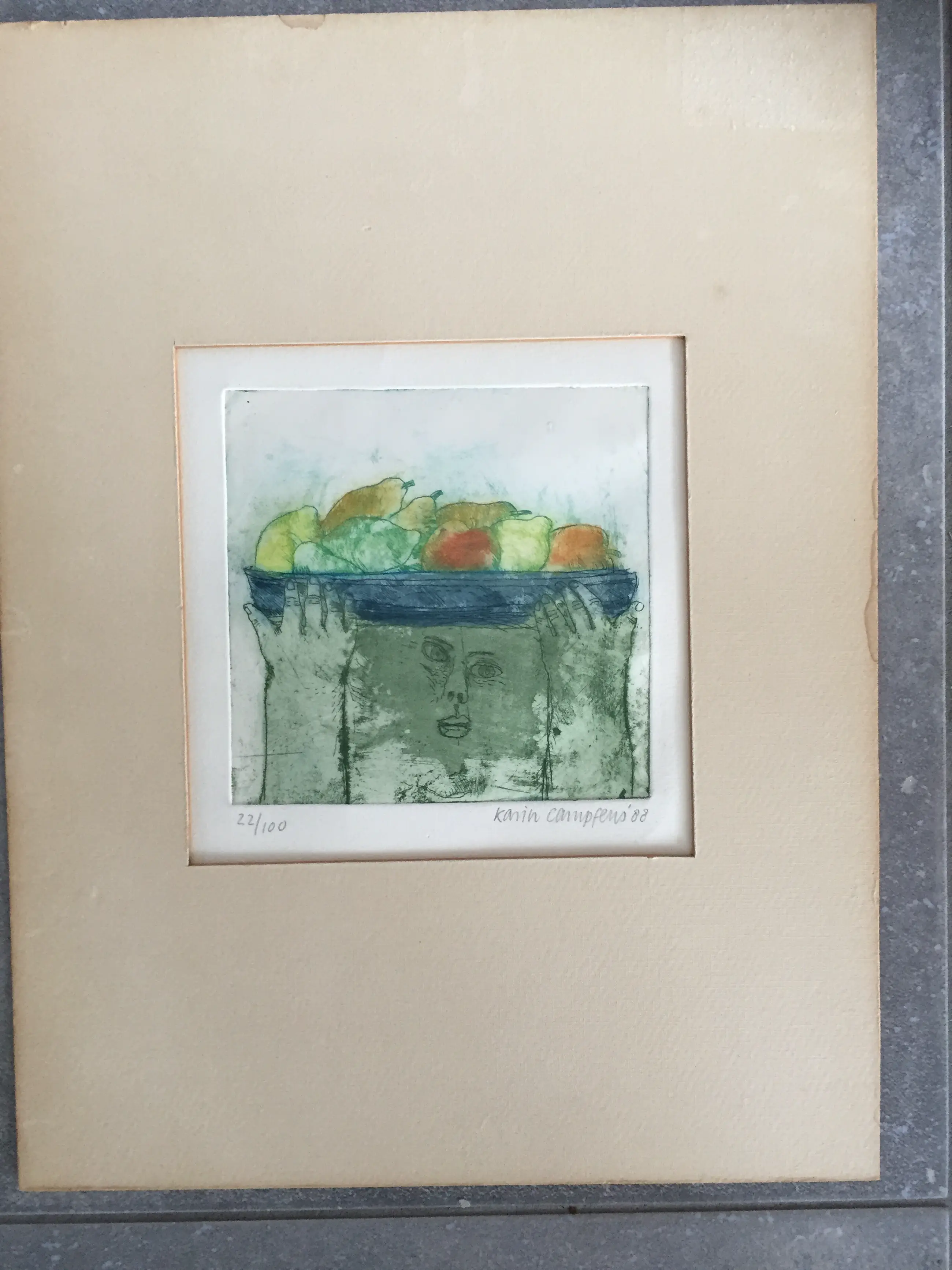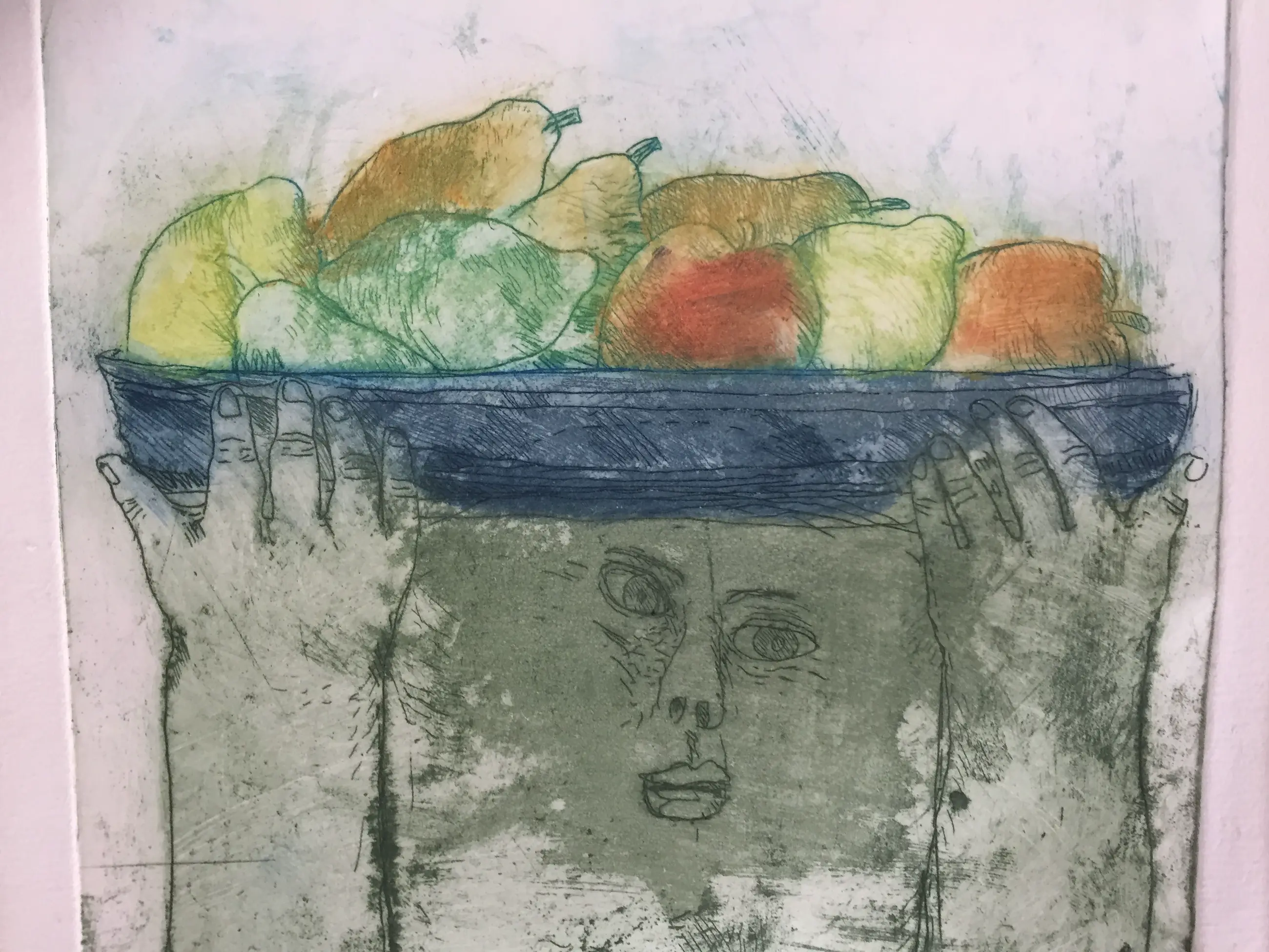 Meerkleuren druk zodat het fruit in de schaal boven het hoofd mooi uitkomt In passe-partout en aluminium lijst