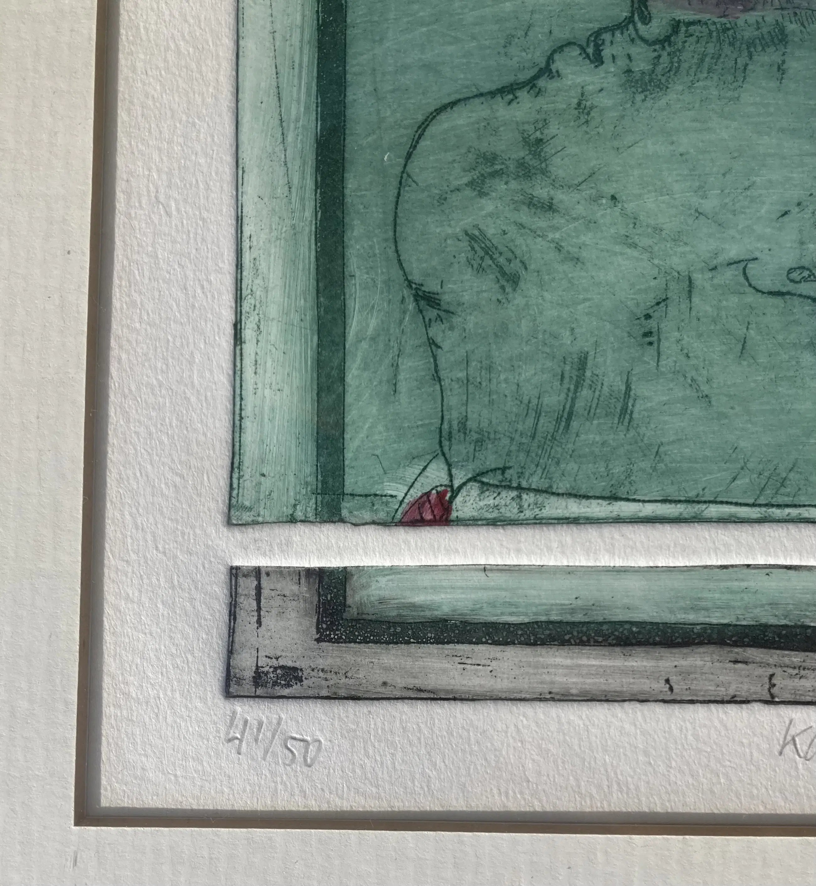 Fraaie ets van Karin Campfens, kleine roze cherubijn hangend onder kaarsenlamp op een watergroene raamvormige achtergrond met liggend manshoofd, met koepelvormig sterrenfirmament 1992, genummerd 41 van een oplage van 50