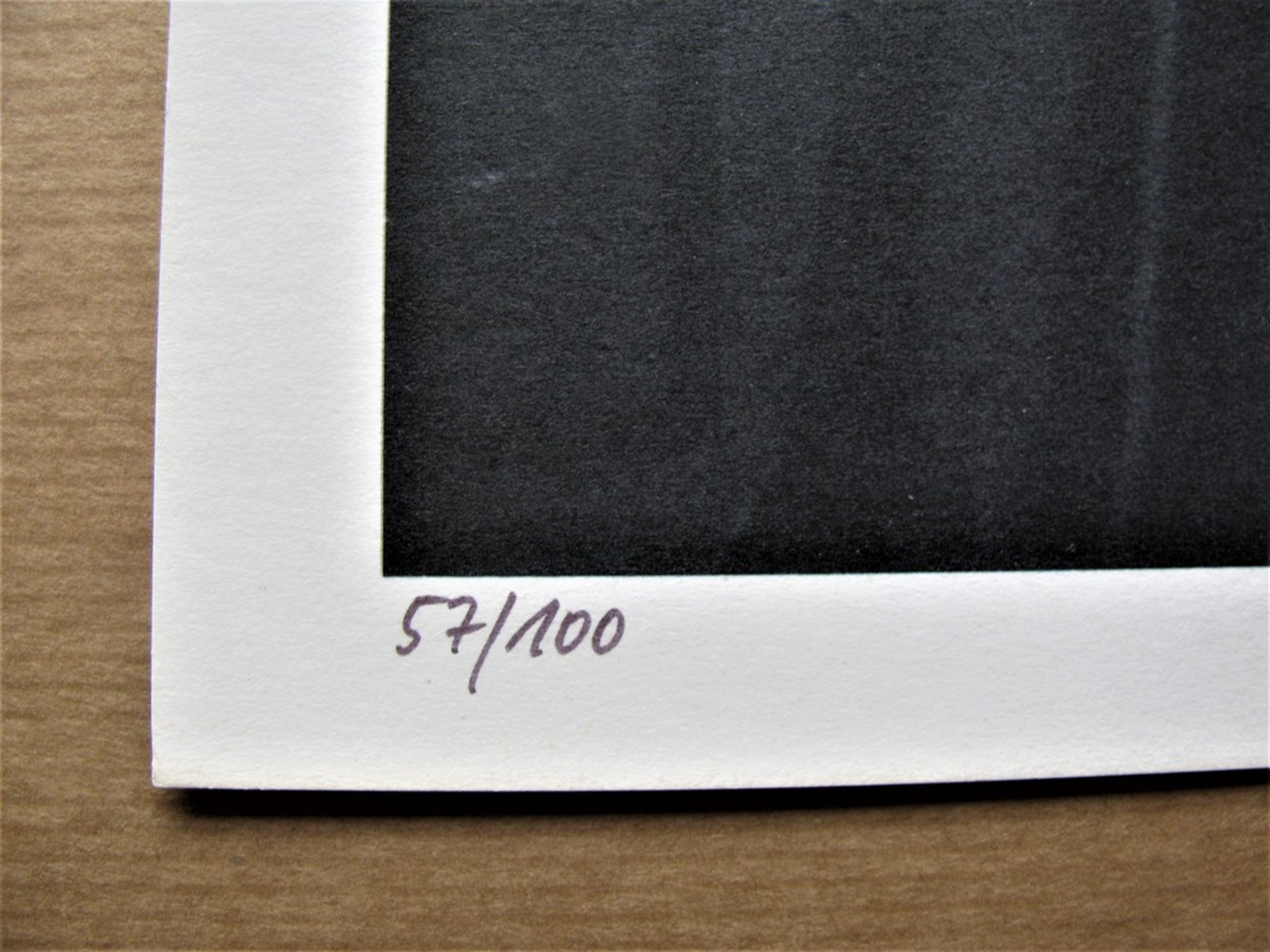 Signatuur met potlood op voorzijde rechtsonder, oplagenummer met potlood op voorzijde linksonder: 58/100.