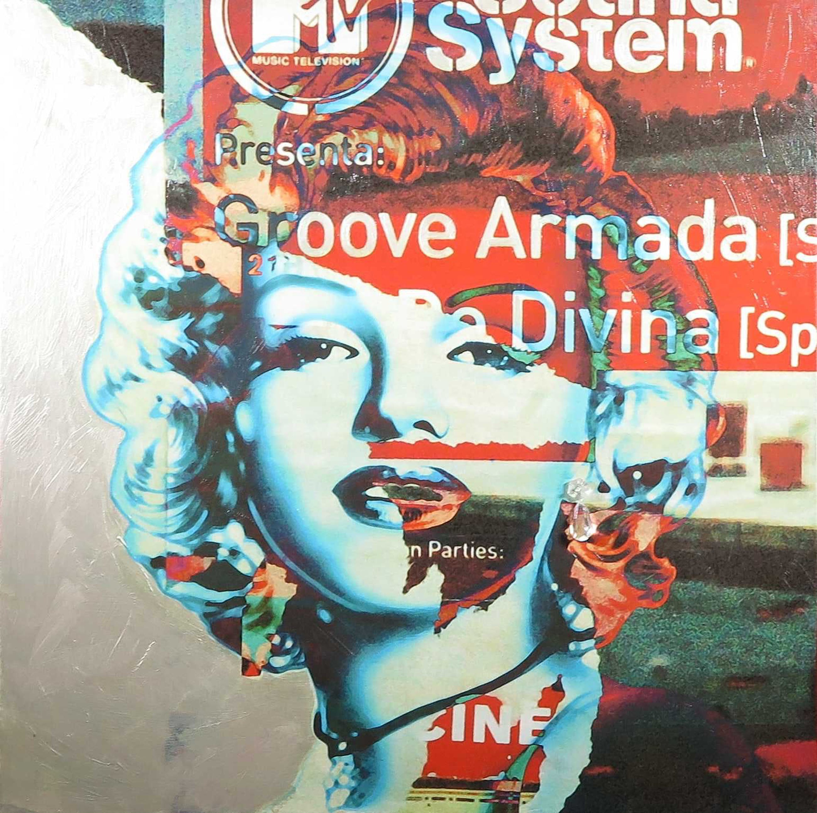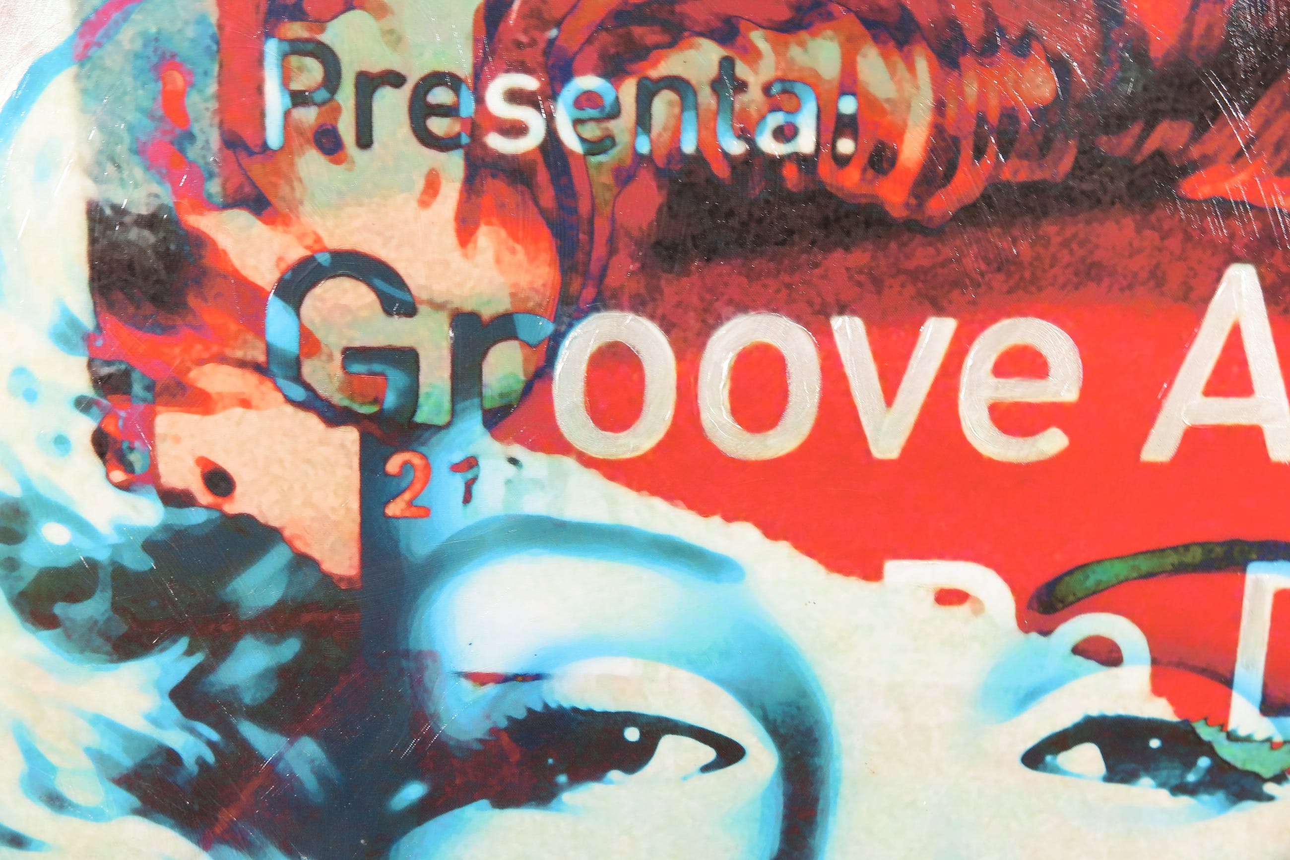 Het betreft een print op canvas, bewerkt met verf (de rand) en applicaties.