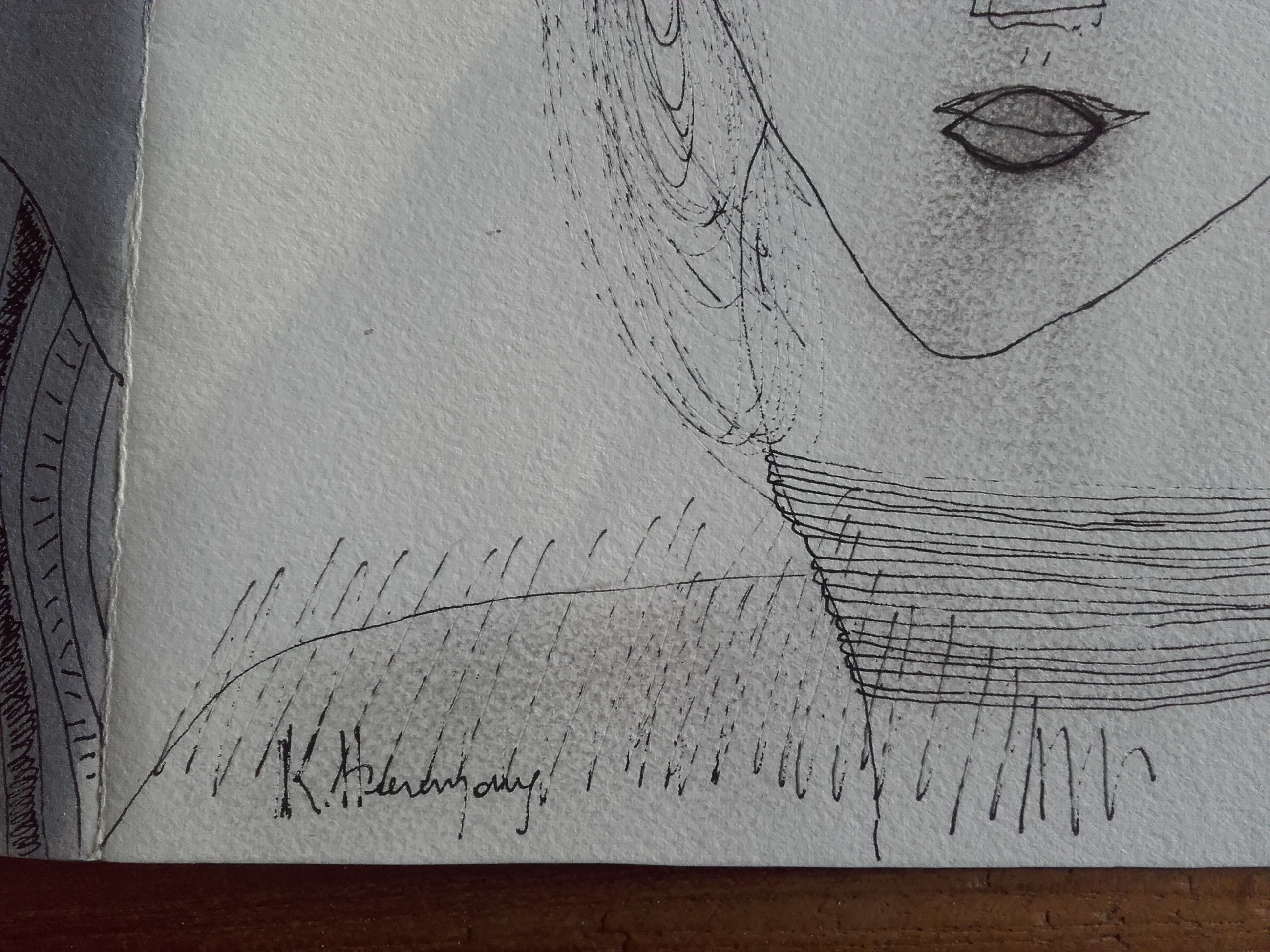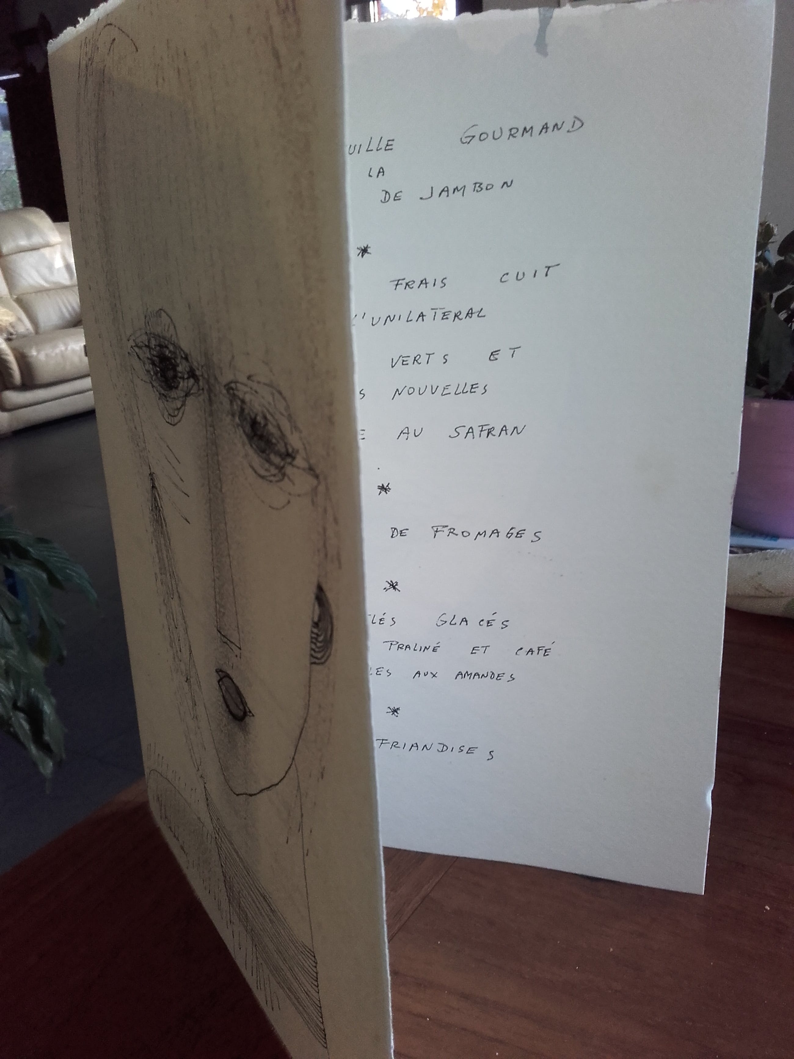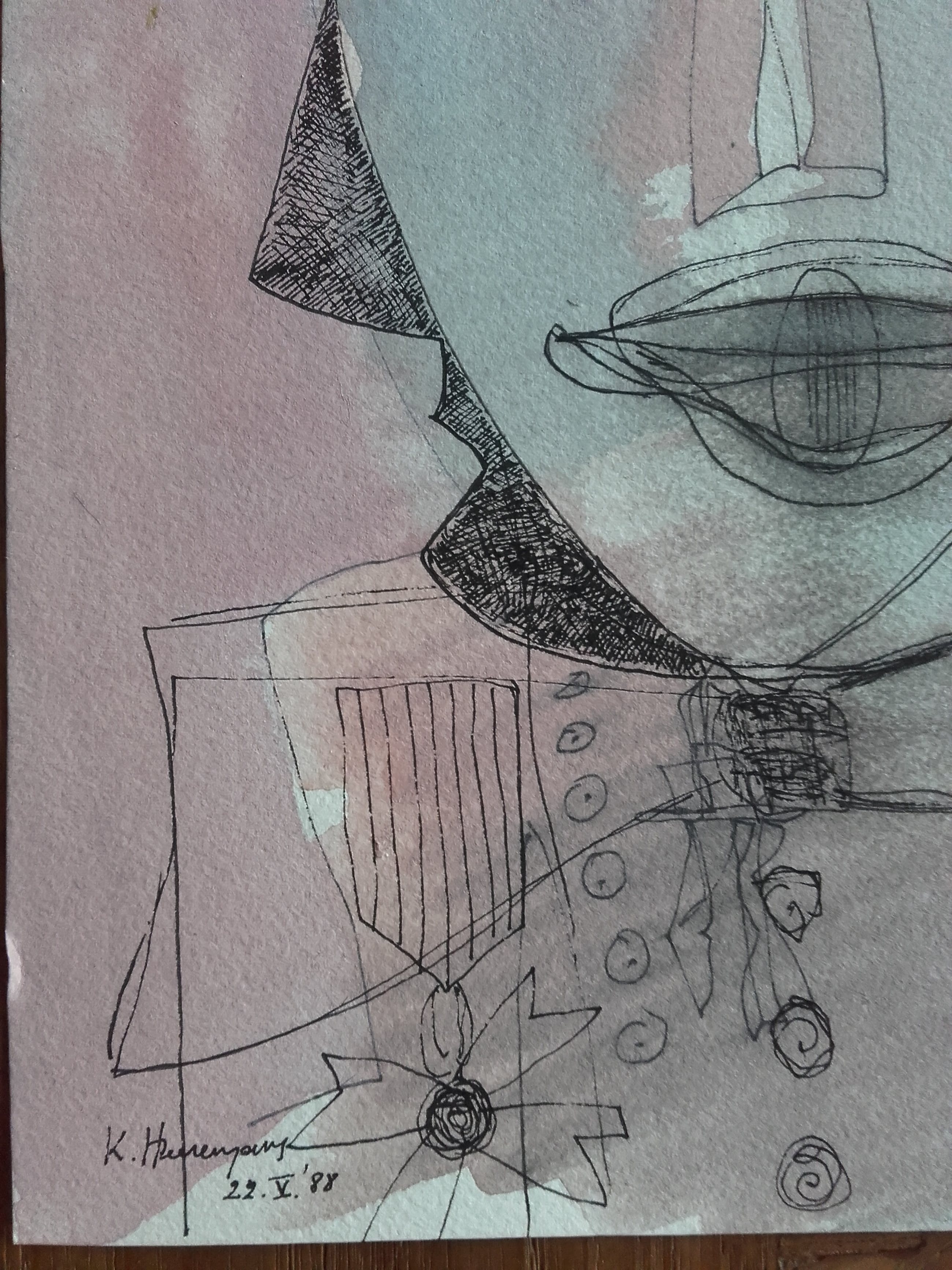 Het betreft een werk gemaakt naar aanleiding van het communiefeest van zijn zoon Tom. Op de buitenzijde werd de pentekening gemaakt en daarbij slechts de helft door aquarel ingekleurd. De binnenzijde geeft het menu weer van deze gelegenheid - Origineel !! Karl Heeremans startte kunstgeschiedenis en musicologie aan de KULeuven (vanaf 1957) en vervolgens vervolledigd hij deze opleiding aan de Düsseldorfse academie(1959) , met o.a. Ewald Mataré als professor. Nadien studeerde hij Geneeskunde; is huisarts geworden (1967) om "artiestenleven" te financieren. Hij verhuisde naar Parijs op het atelier van Anthonie Clavé en had vriendschappen met Guiramand, Aïzpiri, Tamayo en ontmoette Picasso en Chagall (1960). De Vlaamse expressionist Albert Saverijs aanvaarde hem vanaf 1961 in zijn atelier tot aan zijn dood in 1964. In 1964 ontving hij de "Prijs van de stad Namen" en van 1965 tot 1967 nog enkele onderscheidingen zoals de Italiaanse Olivetti-prijs en de prijzen van Knokke. De Grote Internationale Prijs van Deauville ontving hij in 1968 . Karl Heeremans behaalde nadien nog onderscheidingen te Cannes (1970) en te Ronse (1970); De prijs Anto Carte in 1976). Diverse werken bevinden zich in verscheiden musea en in de verzamelingen van de Belgische Staat.