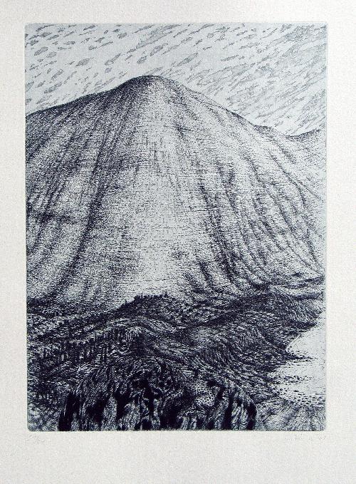 Radierung (S/W), Ohne Titel (Berglanschaft), 1980 Papiergröße: 66 x 51,5 cm Bildformat: 37 x 27,5 cm, (auf handgeschöpftem Büttenpapier/chamois) Nummeriert,datiert und von Hand signiert. Makelloser Zustand. Versand in Deutschland Euro 10.-