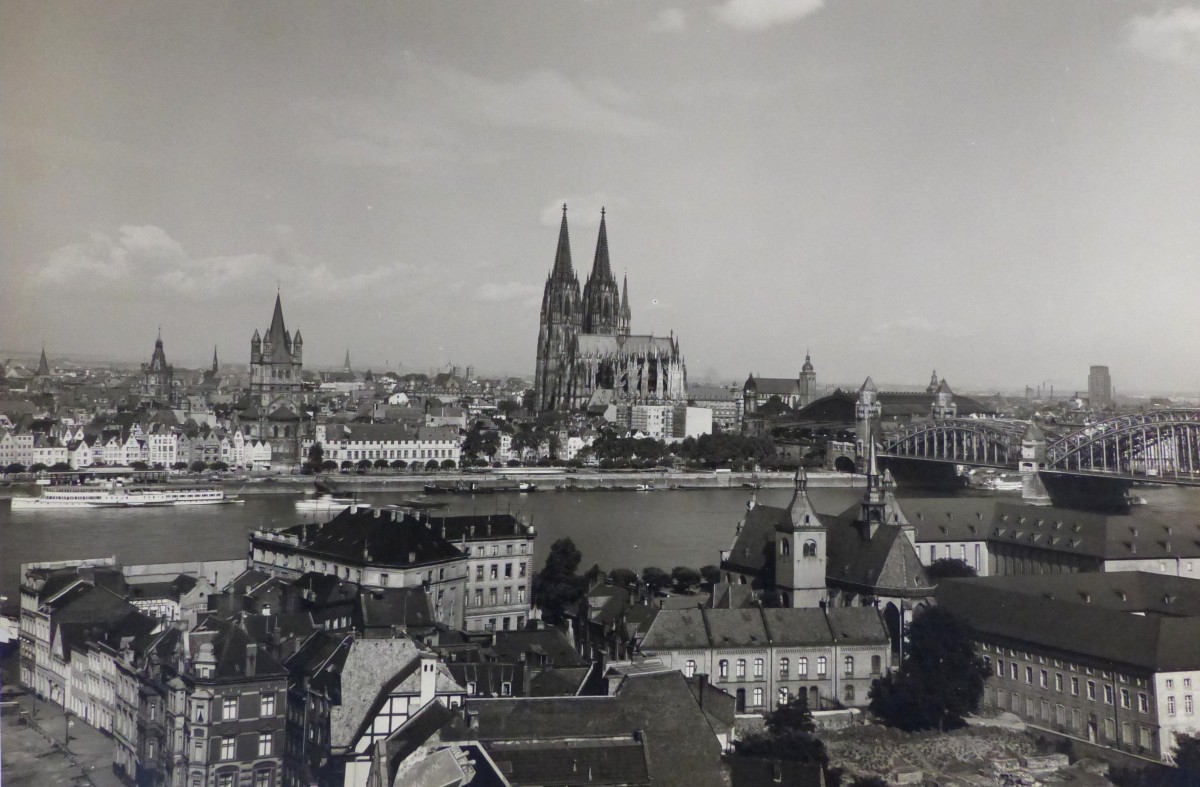 Schwarz-weiß Fotografie von Karl-Hugo Schmölz, rückseitig Atelierstempel und betitelt: "Rheinpanorama von Köln, 1932". Maße 22 x 15 cm