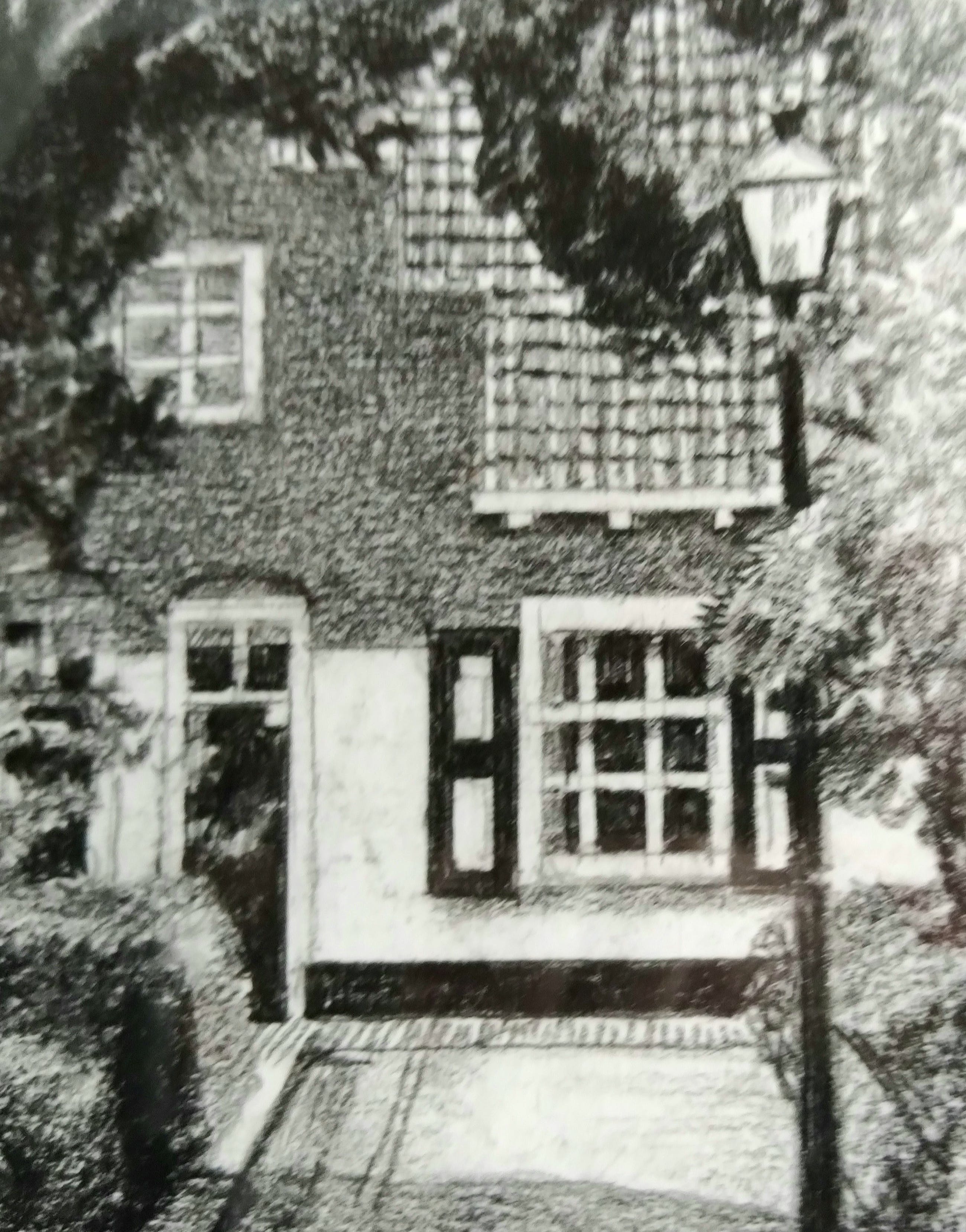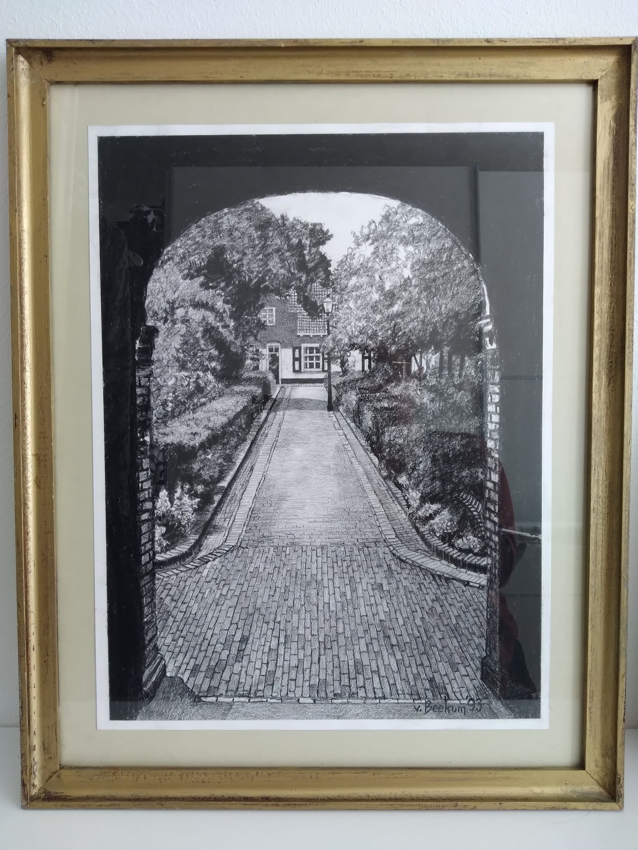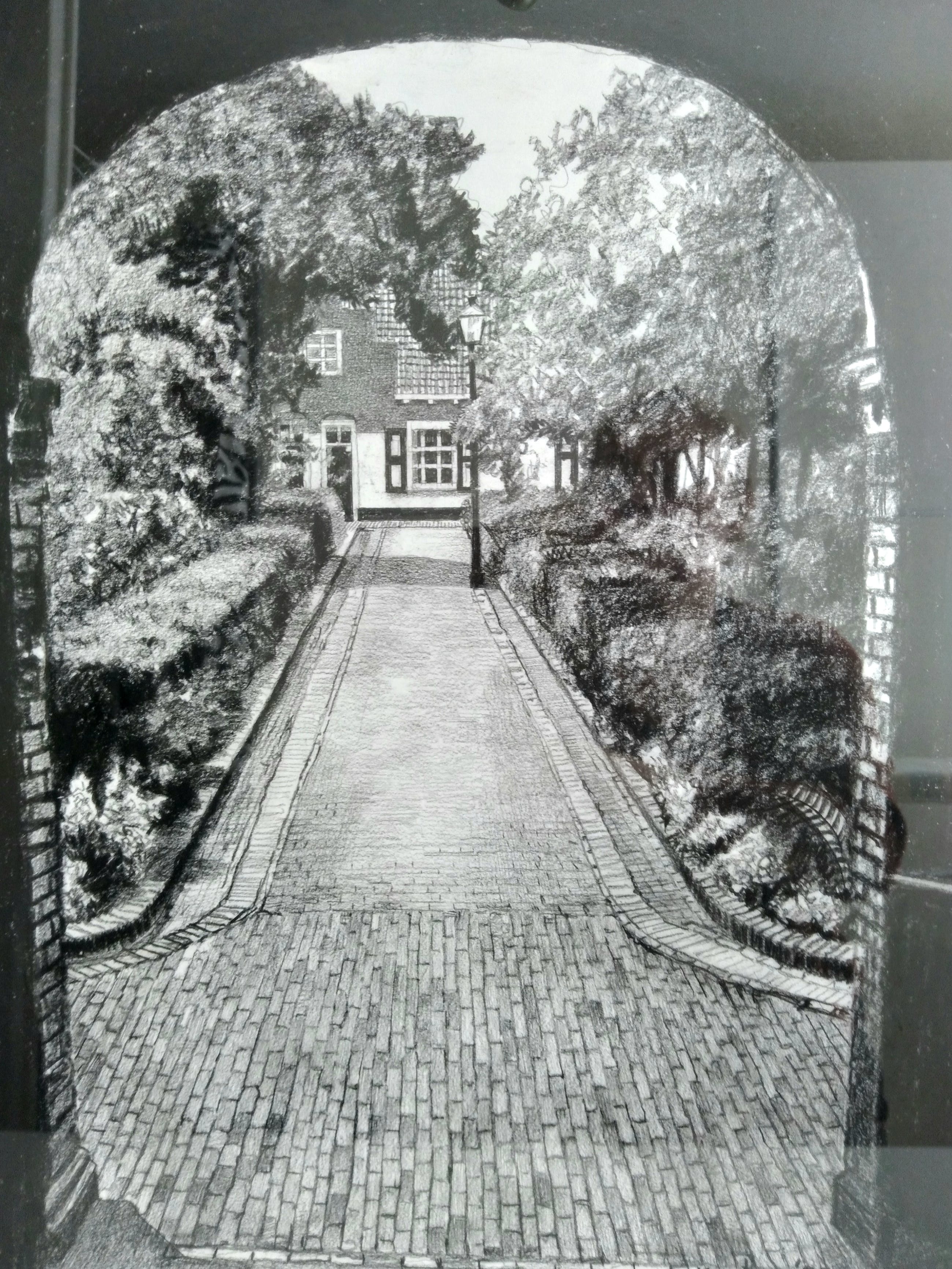 Sfeervol doorkijkje, door een poort, via een klinkerpad naar een fraai oud huis.