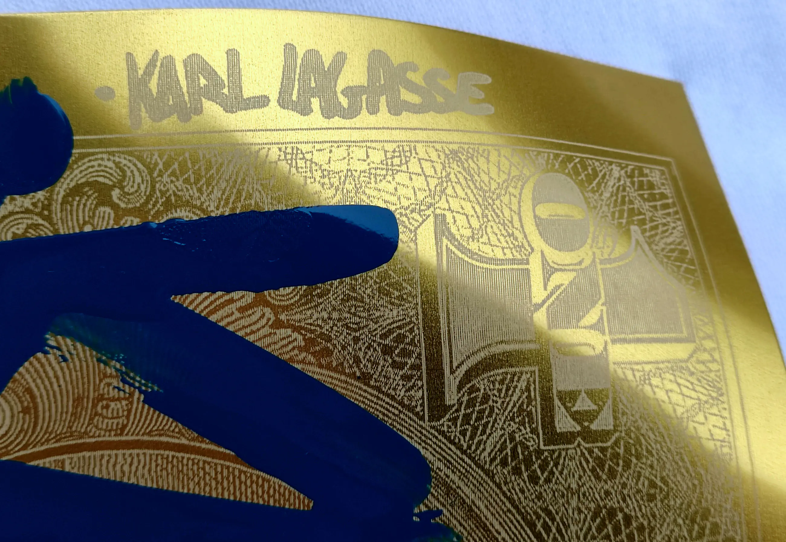 Het kunstwerk is een extra groot dollarbiljet op gegraveerd, 2 mm dik aluminium, versierd met de handtekening van de kunstenaar "KARL LAGASSE" in acrylverf. De oplage is gelimiteerd tot 74 exemplaren (dit is nummer 38). Het dollarbiljet is gesigneerd en wordt geleverd met een genummerd echtheidscertificaat, ondertekend door de kunstenaar.