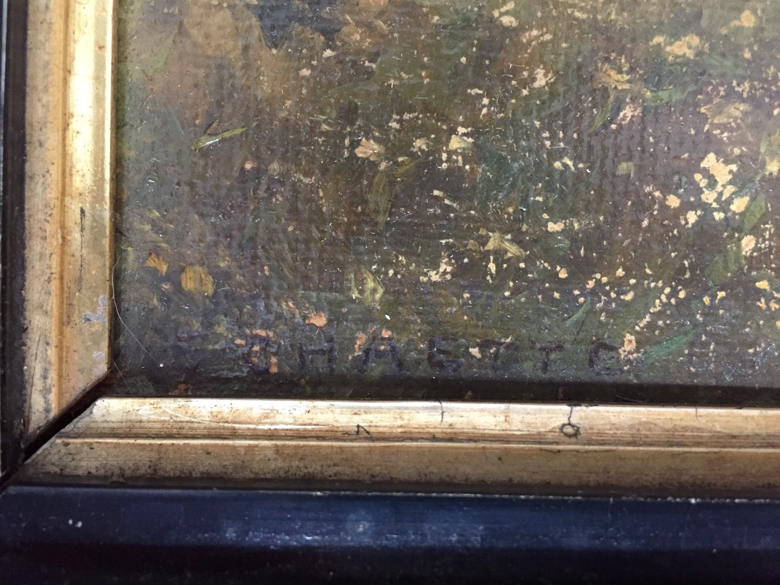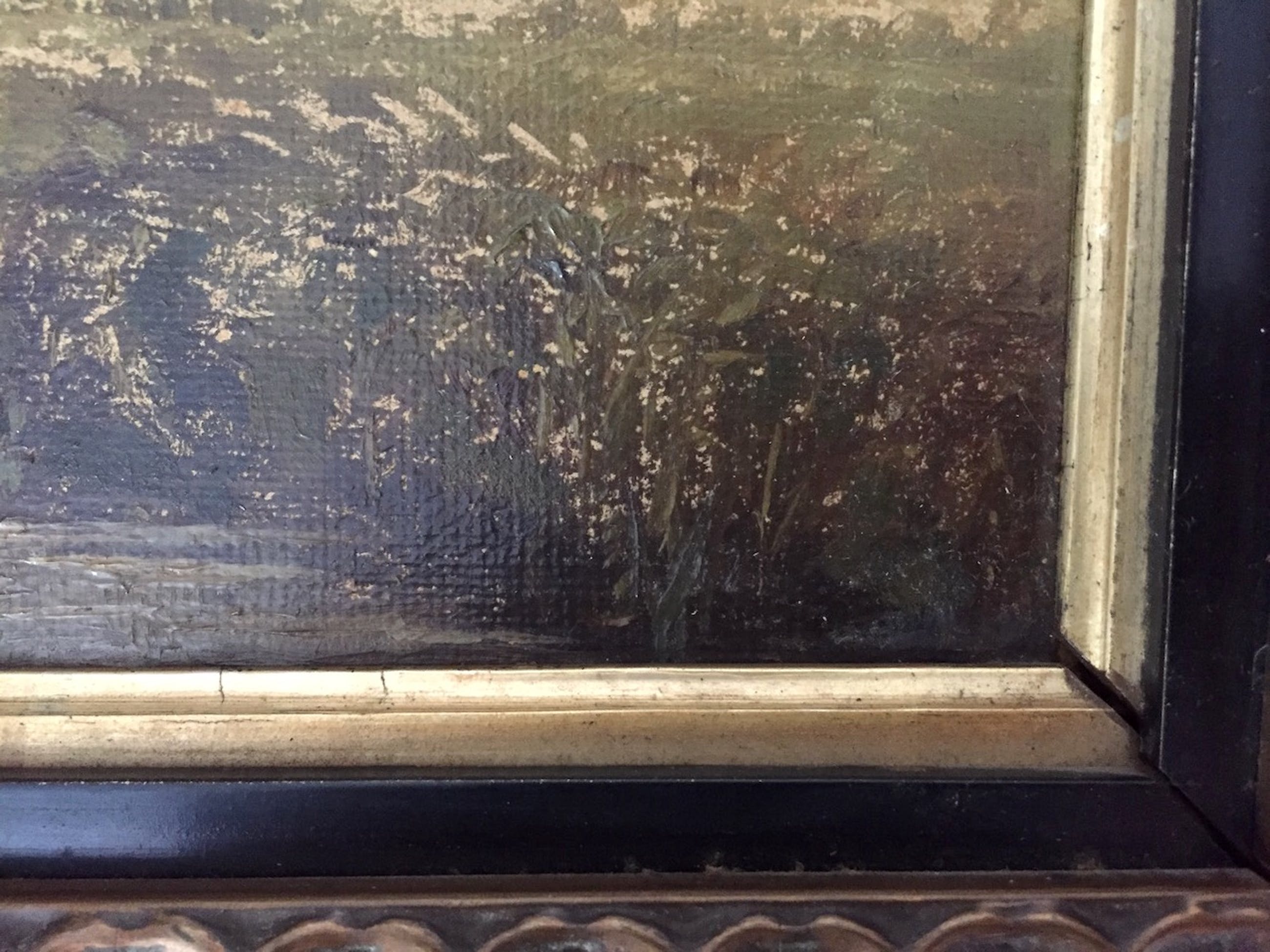 Diverse beschadigingen op doek. Gedateerde lijst. Zie foto's