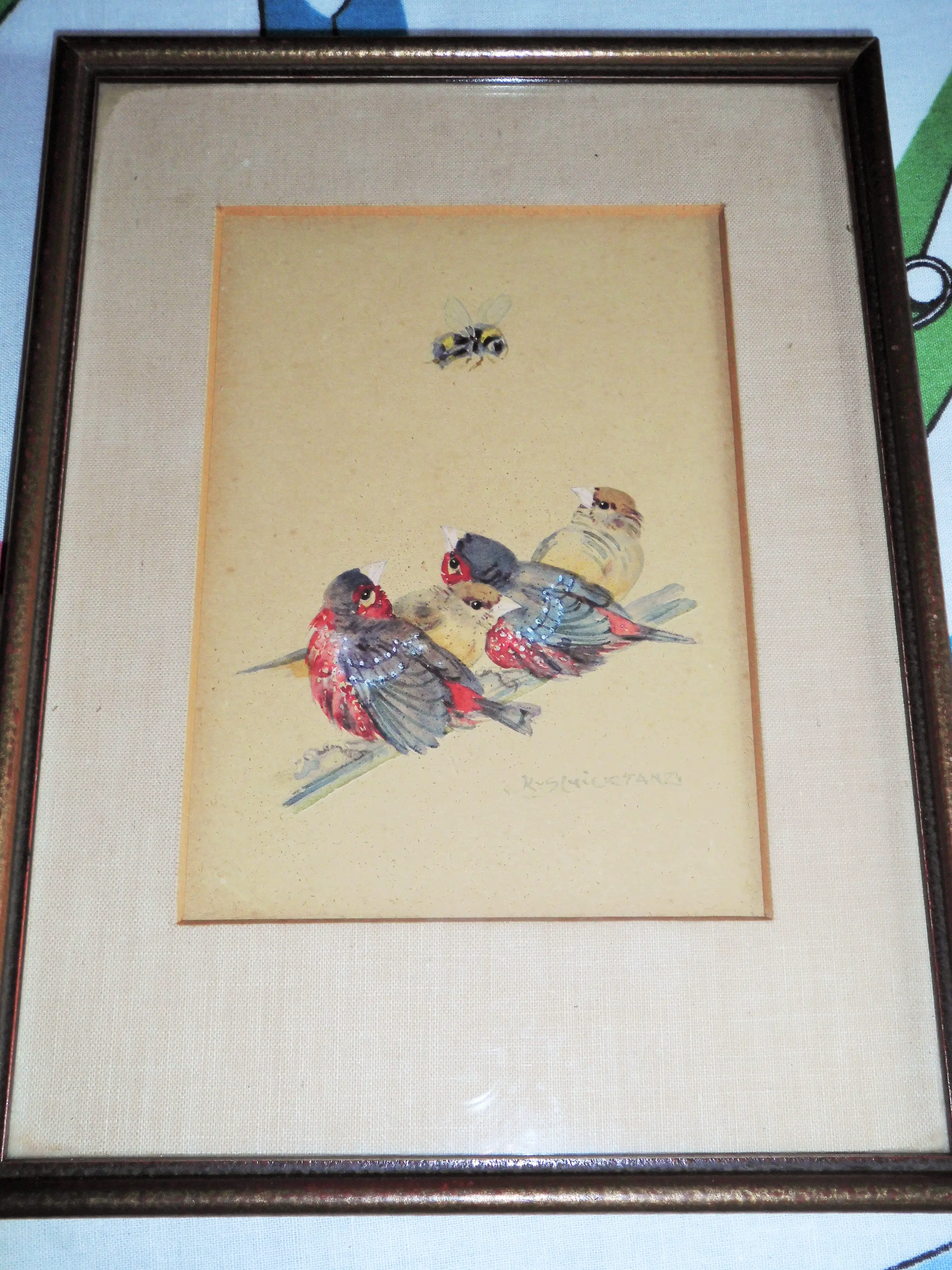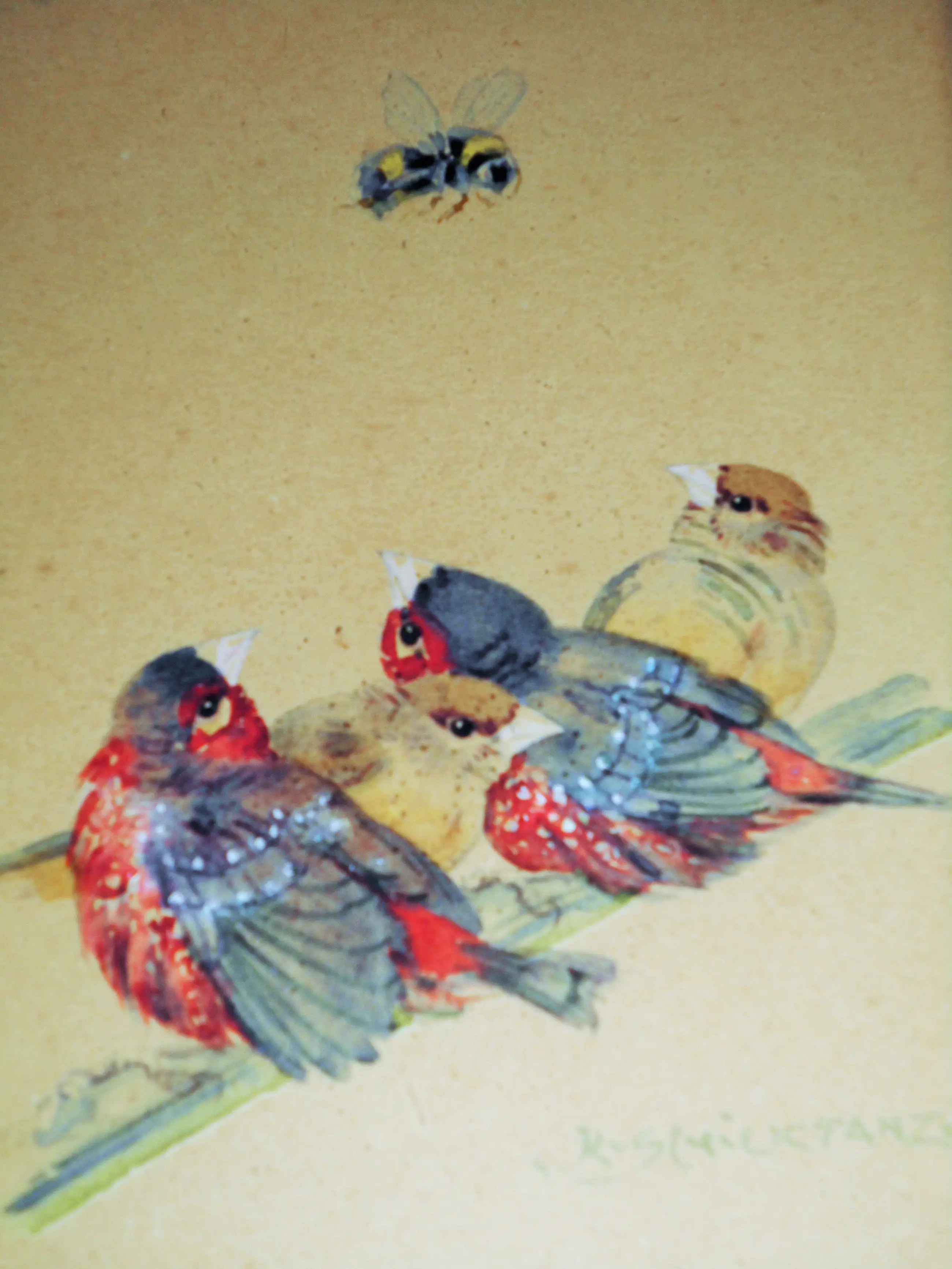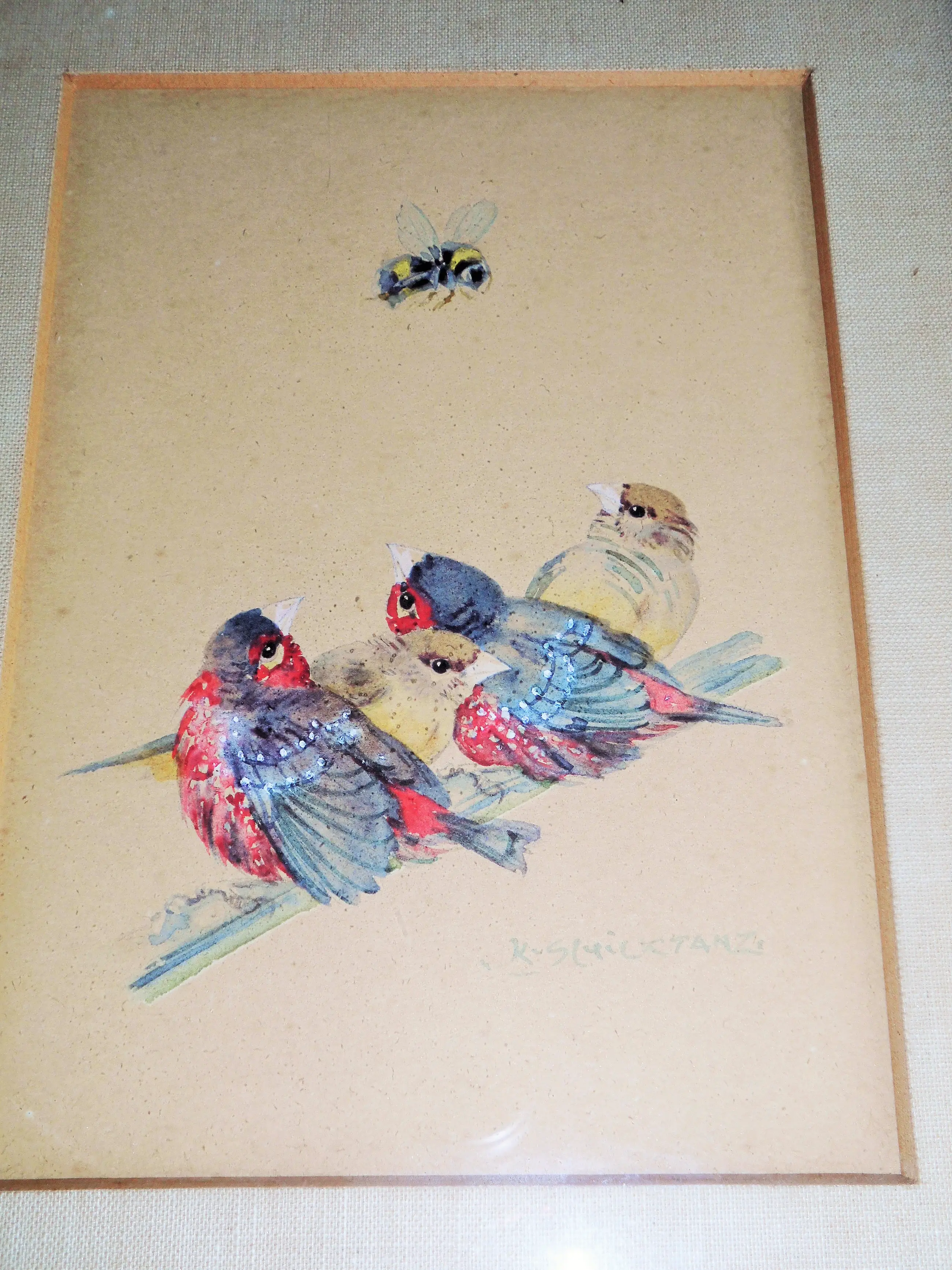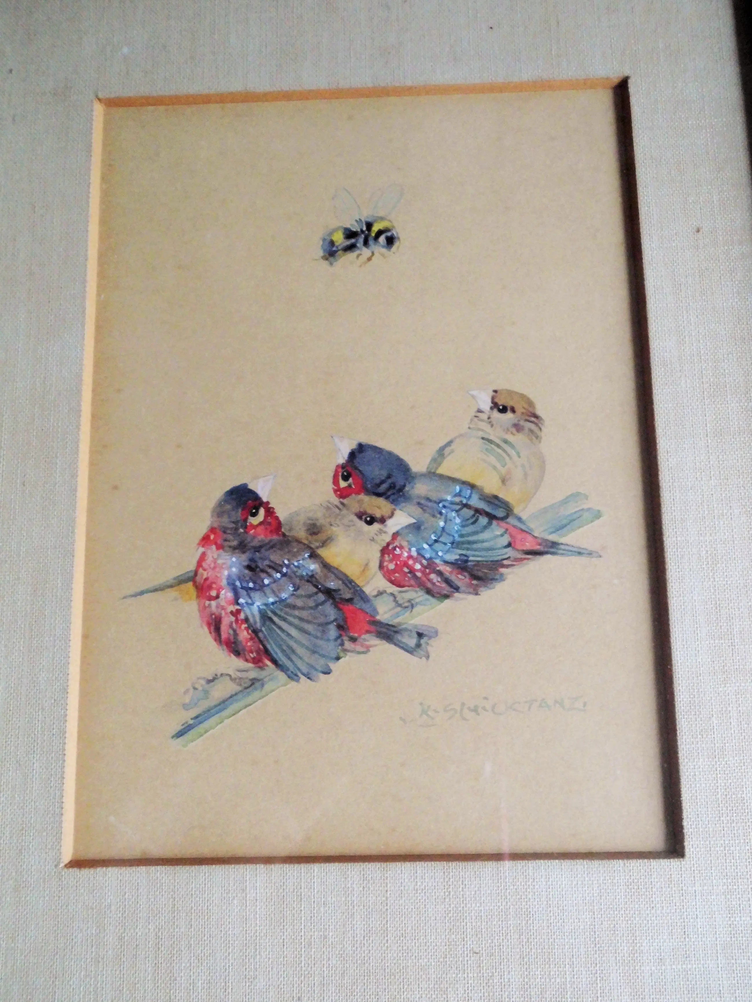 Zeer leuke mooie Aquarel "Vogeltjes op stok met Bij" van