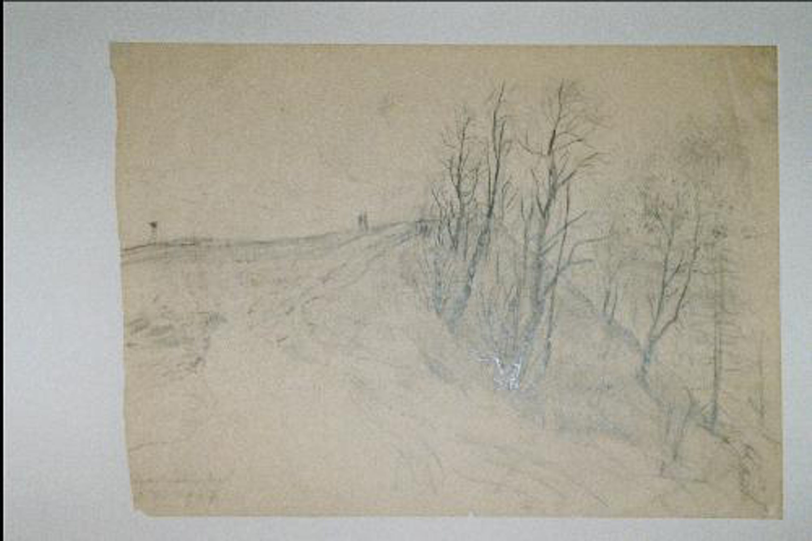 Bleistiftzeichnung auf dünnem Transparentpapier, 30 x 21 cm, links unten von K. Schwetz eigenhändig bezeichnet und datiert "Scheibenbichel 2.4.47" (bei Innsbruck). Nicht signiert, linker Rand unregelmäßig gerissen, kleiner Einriß am unteren Rand, leicht gewellt bzw. gebräunt. hinter Passepartout, mehrmals mit K. Schwetz bezeichnet.