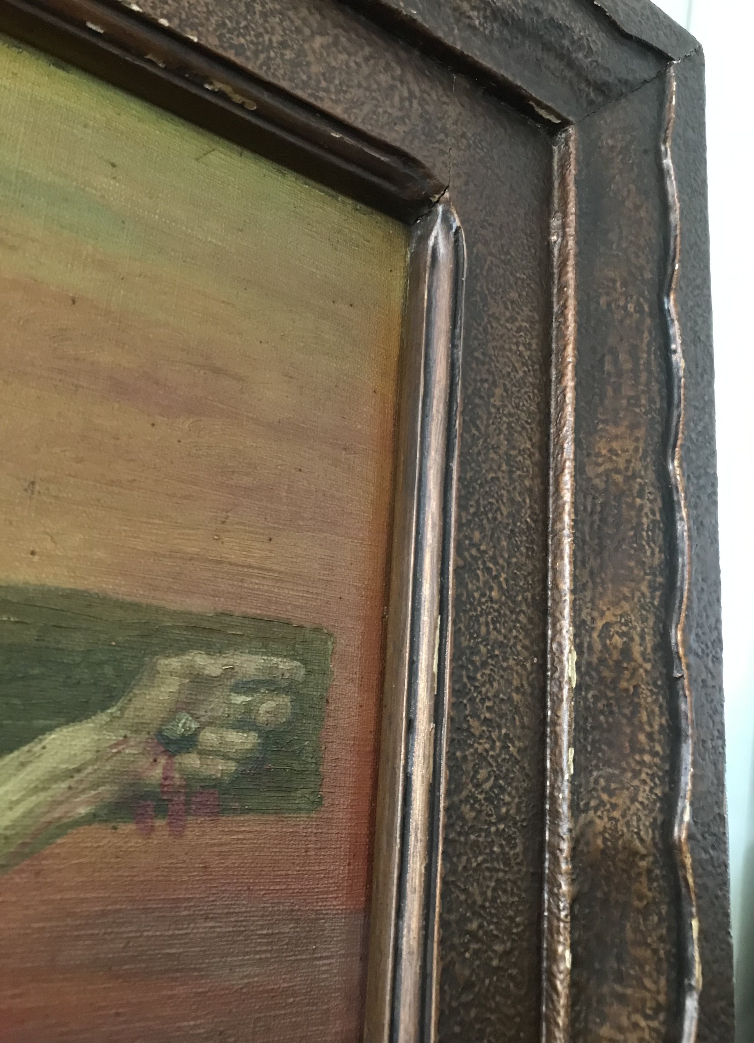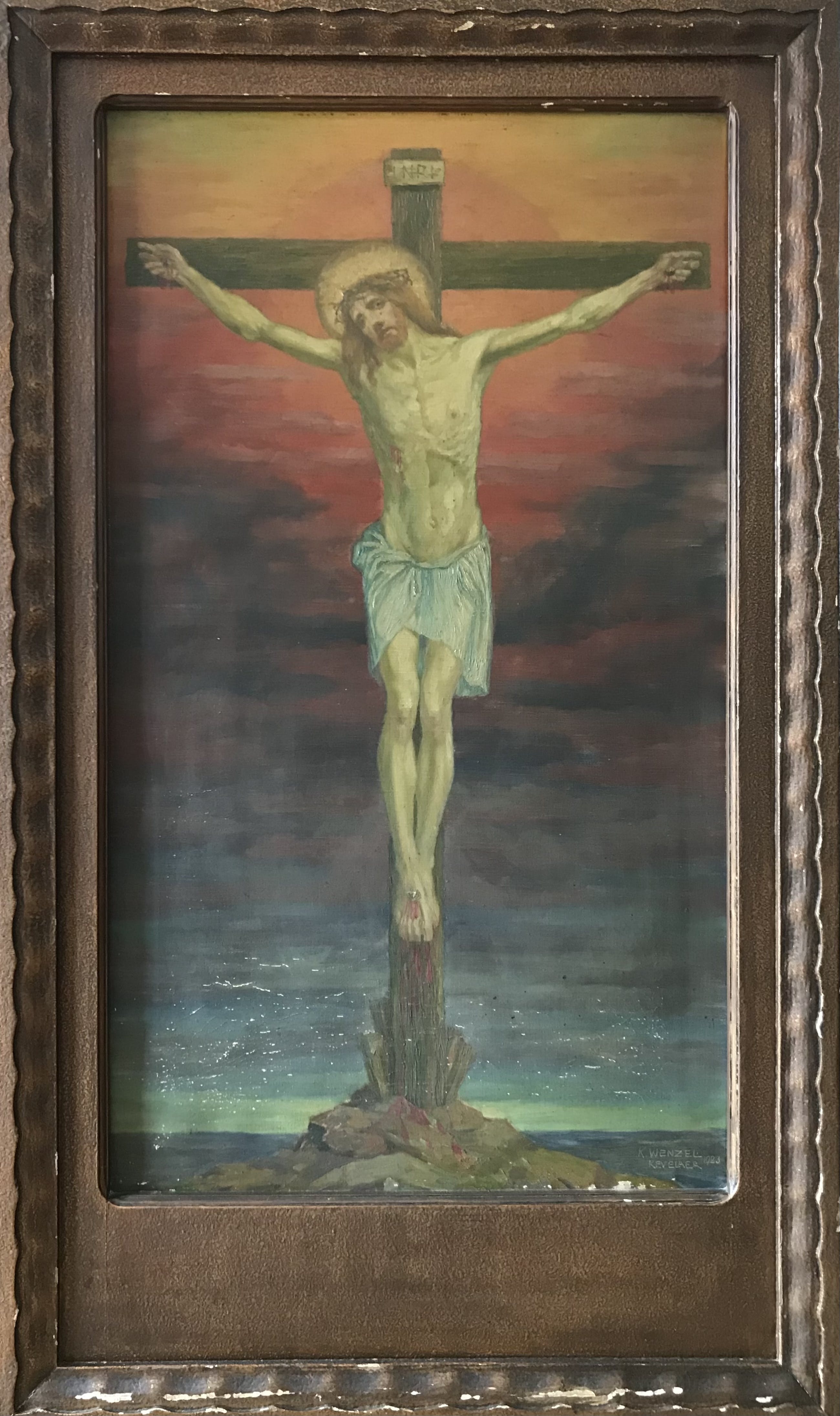 Gekruisigde Christus, ingelijst in paneel in lijst. Hoogstwaarschijnlijk afkomstig uit het interieur van een kerk in Duitsland. Wenzel heeft gedurende een periode rond 1920 nogal wat religieuze taferelen geschilderd voor verschillende kerken, waar hij bij de restauratie was betrokken.