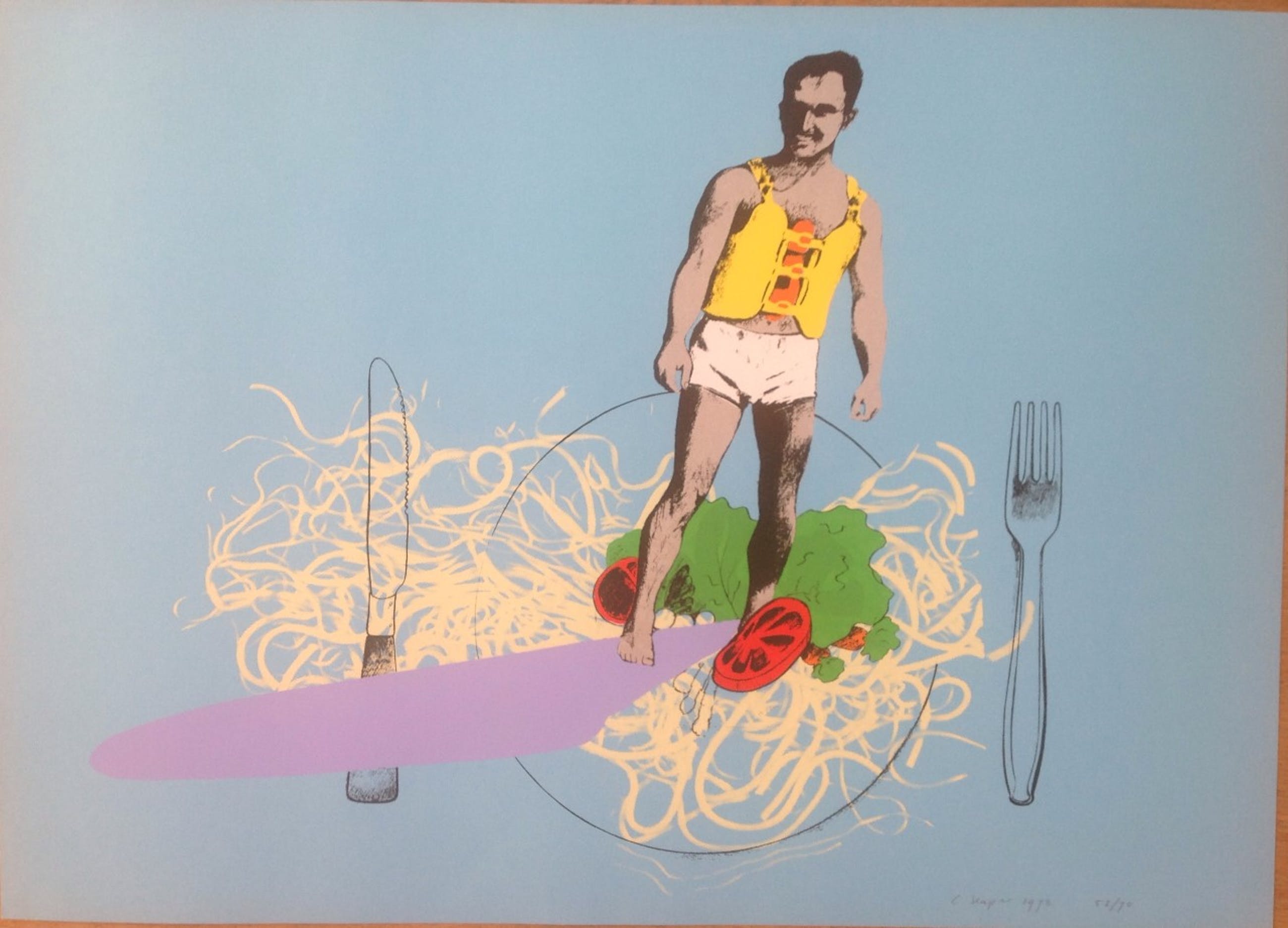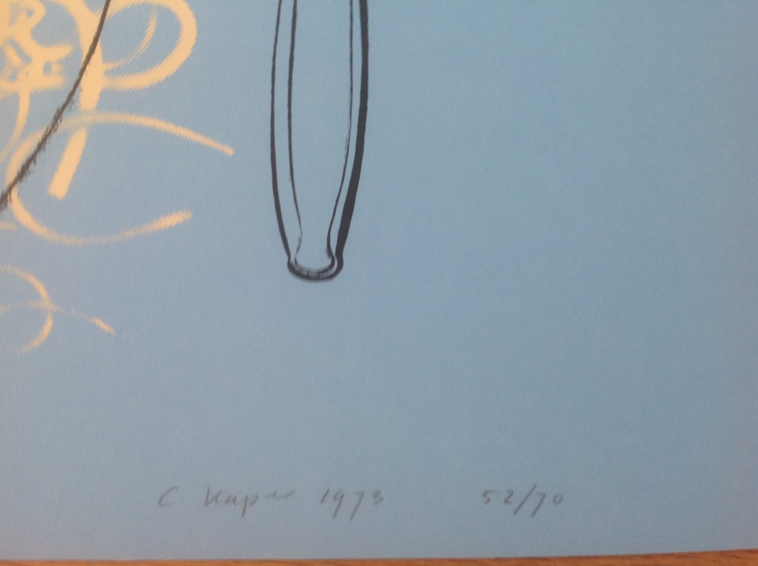 Zeefdruk. Gesigneerd. Het werk is gedrukt op dik blauw papier van 50 x 70 cm.Oplage 52/70 Het werk wordt verzonden in kartonnen koker. Karla Kaper (1941, Zaandam) Beeldend kunstenaar, schilder, etser en lithograaf. Karla (Carla) Kaper werkte vooral in Alkmaar en Dordrecht, later in Rotterdam. Zij was leerlinge van de Academie voor Beeldende Kunsten in Rotterdam en ontving voor haar monumentale werk (zogenoemde 'nieuwe generatie') onder meer de Drempelprijs 1963 en de Havenloodsprijs 1964.