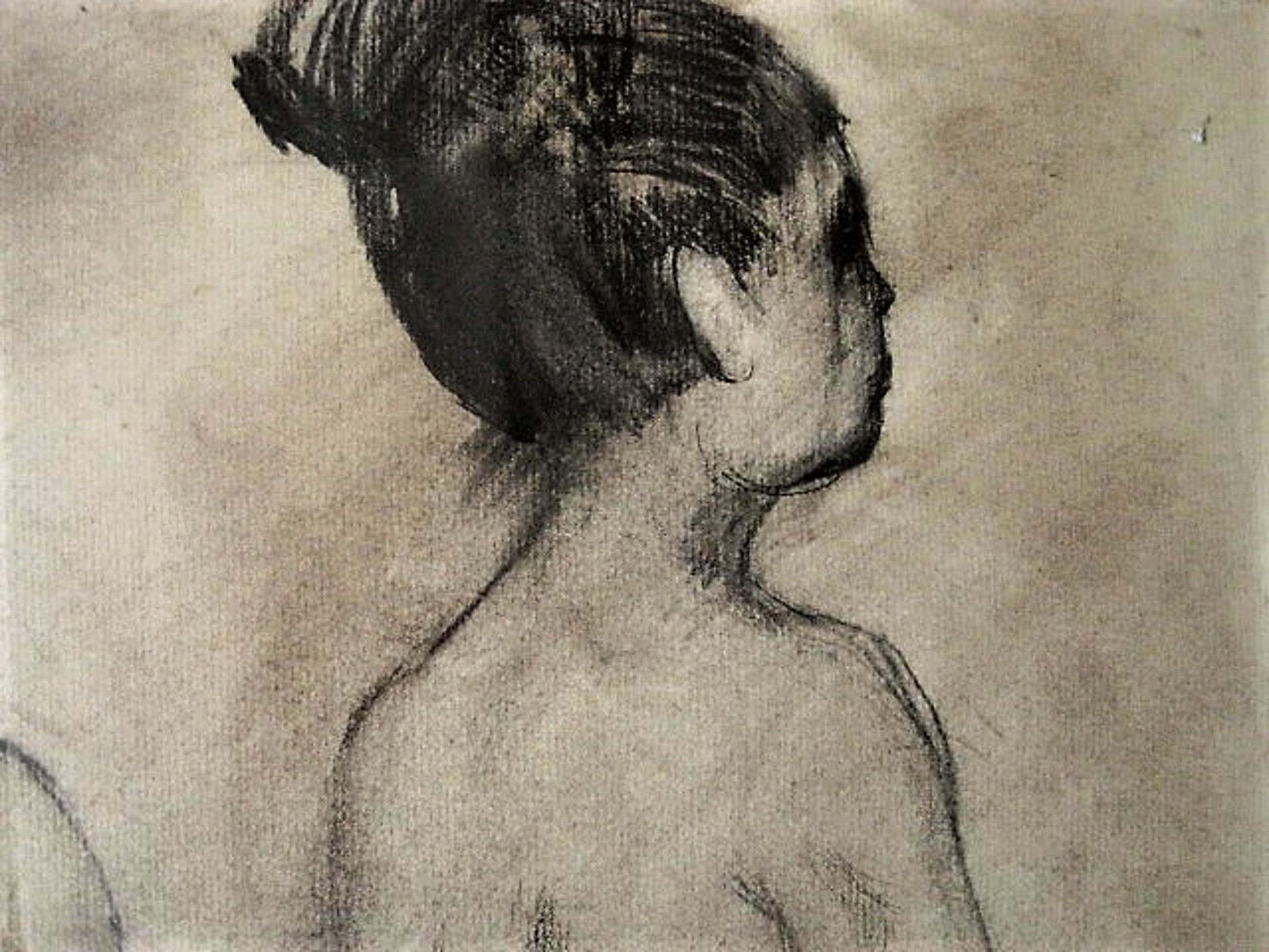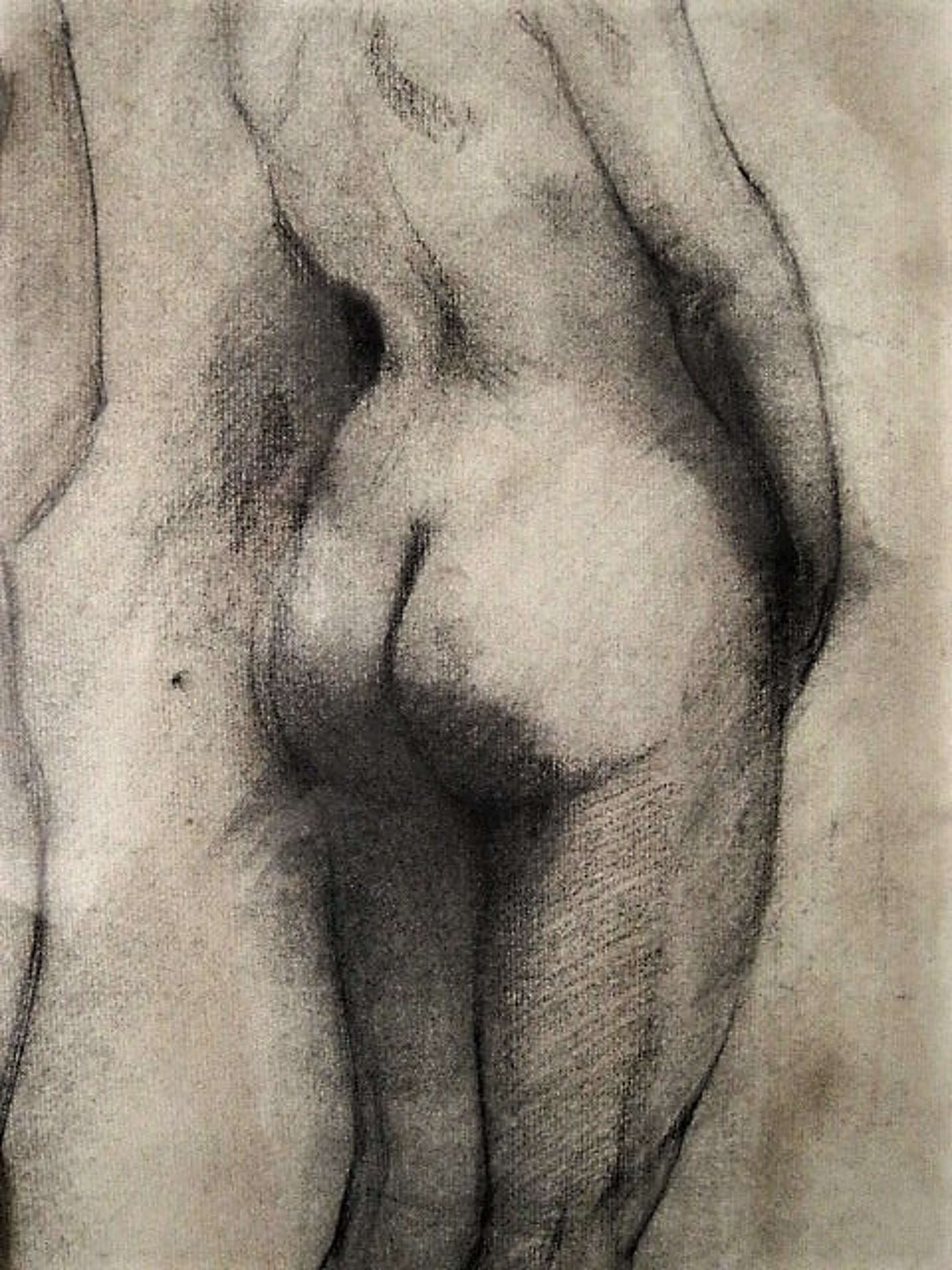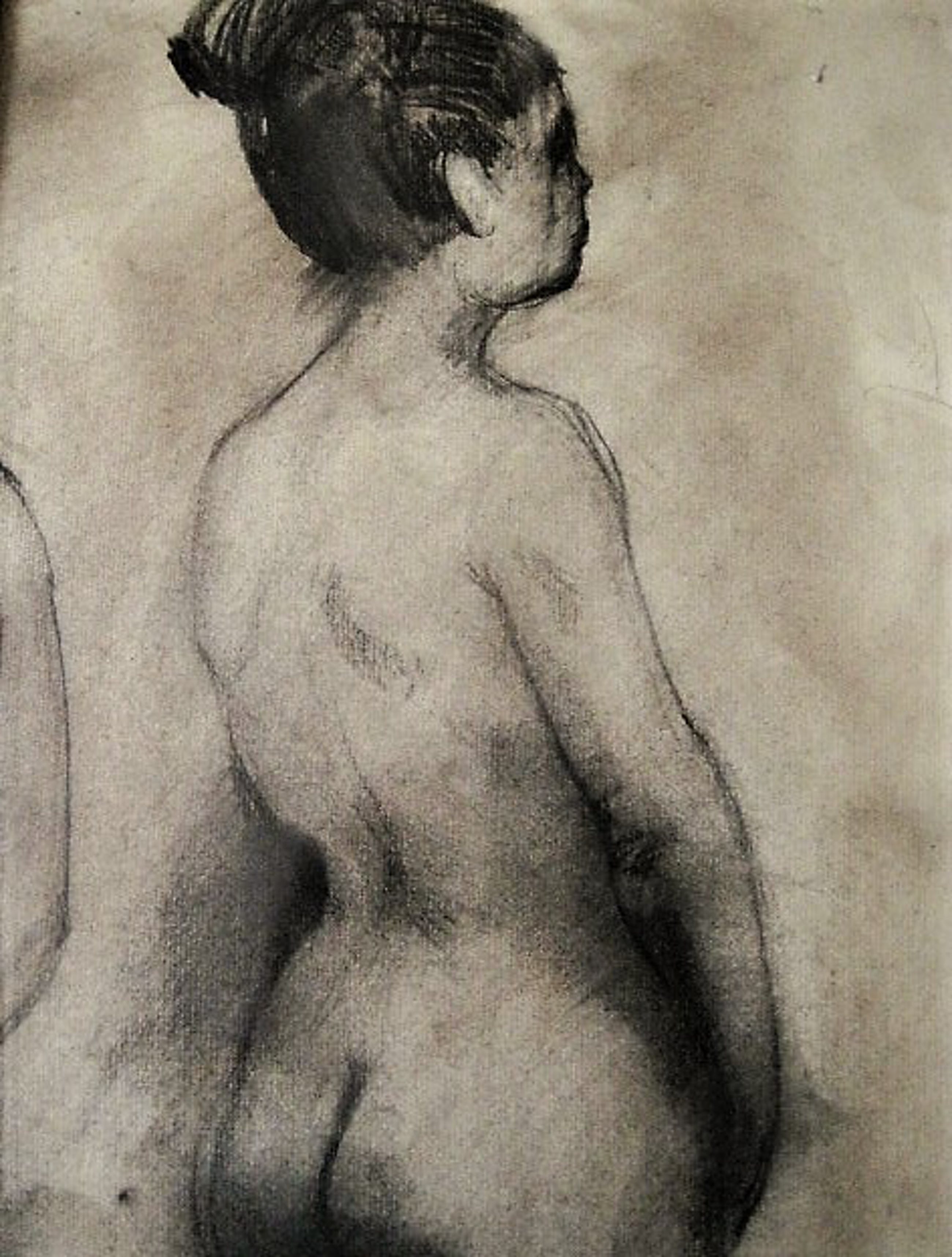 Fraaie omstreeks 1935/1940 gemaakte houtskooltekening met voorstelling van een staand vrouwelijk naakt. Typische academietekening, die de schilder waarschijnlijk op de Minerva-academie te Groningen heeft gemaakt. Linksonder voorzien van monogram "KN". De tekening verkeert in goede conditie. De sobere houten lijst is wel beschadigd.