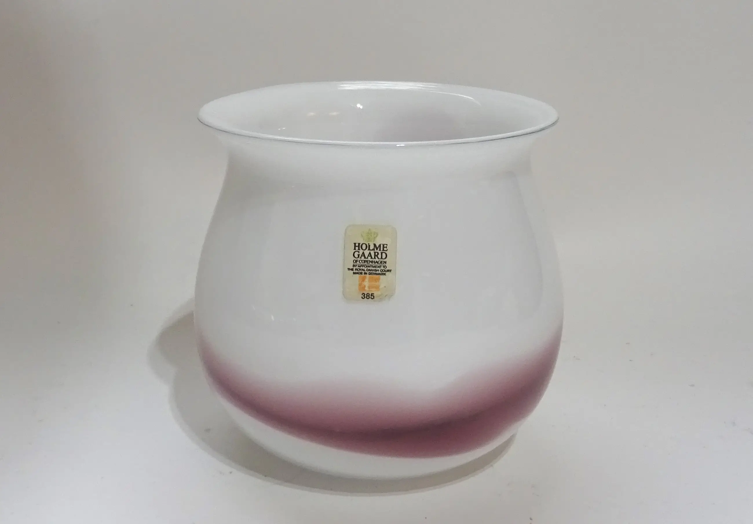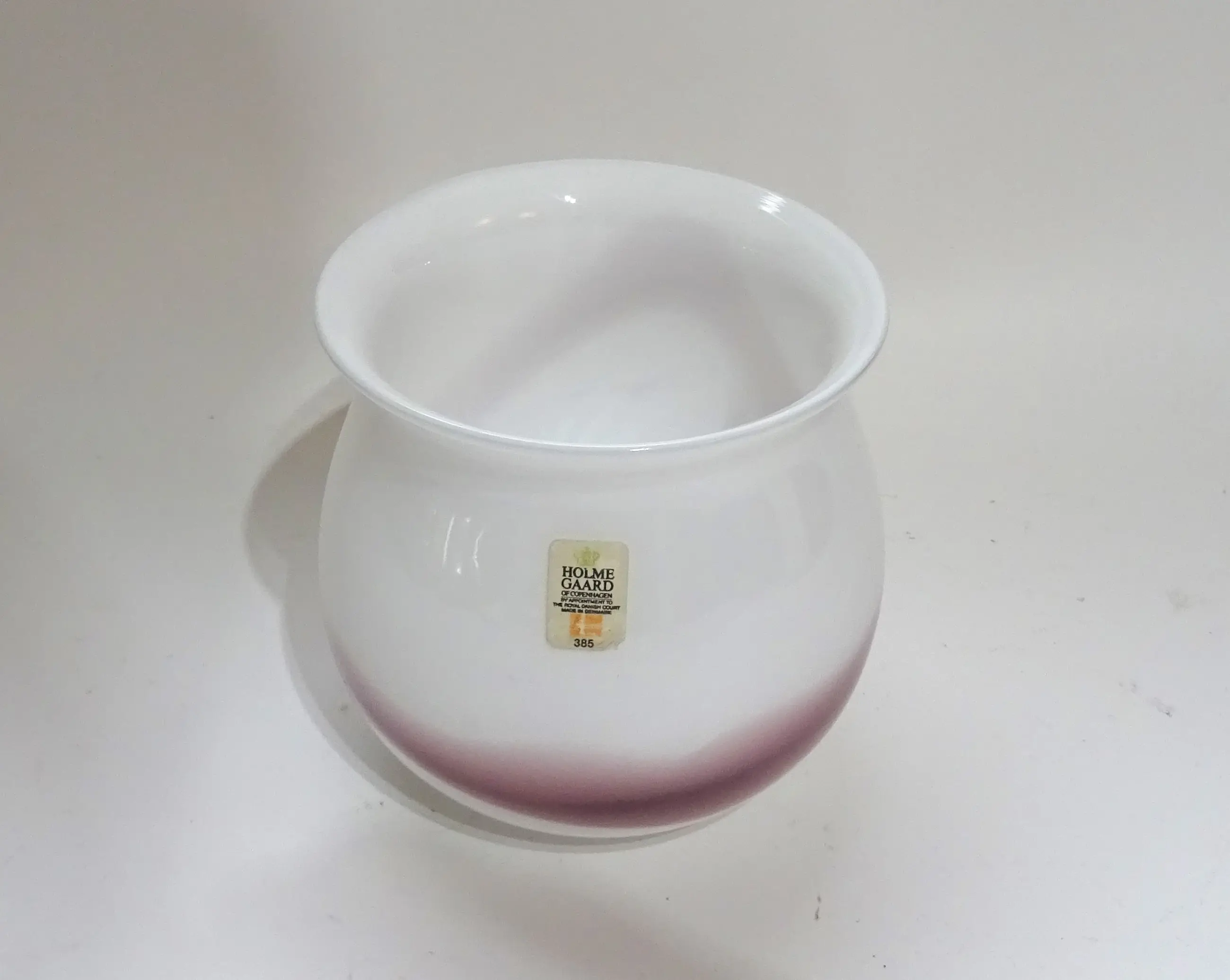 Een wit opaline vaasje met roze paars keurslinger in de stijl van Meydam.