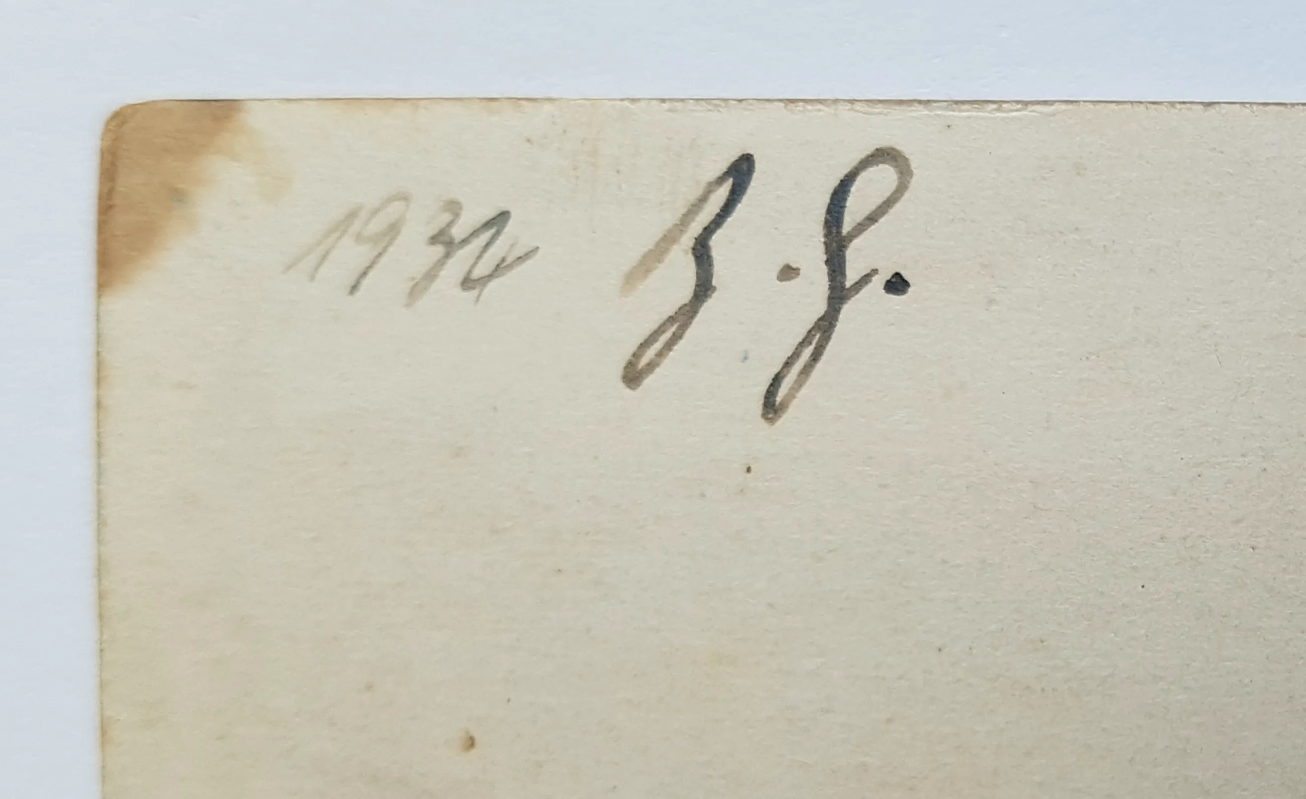 leeftijdsgebonden, goede staat: rechter bovenhoek: klein bruin vlekje, alle hoeken minimaal gestoten, Klein inktvlekje op de bovenrand, waarschijnlijk van de signering alle bladranden wat onfris, achterzijde wat smoezelig, handgeschreven linksboven: in potlood 1932, in inkt ZG | |||||||