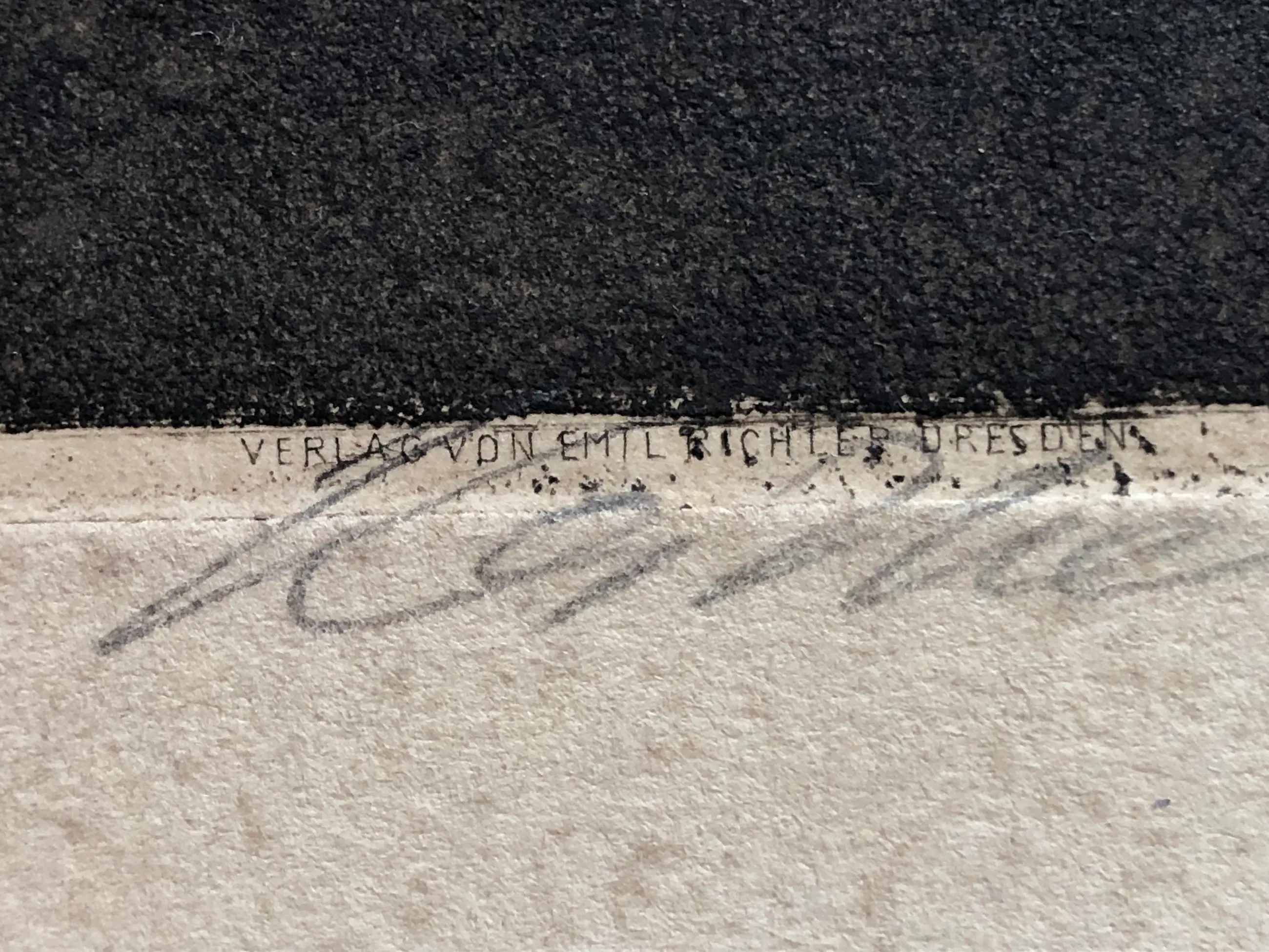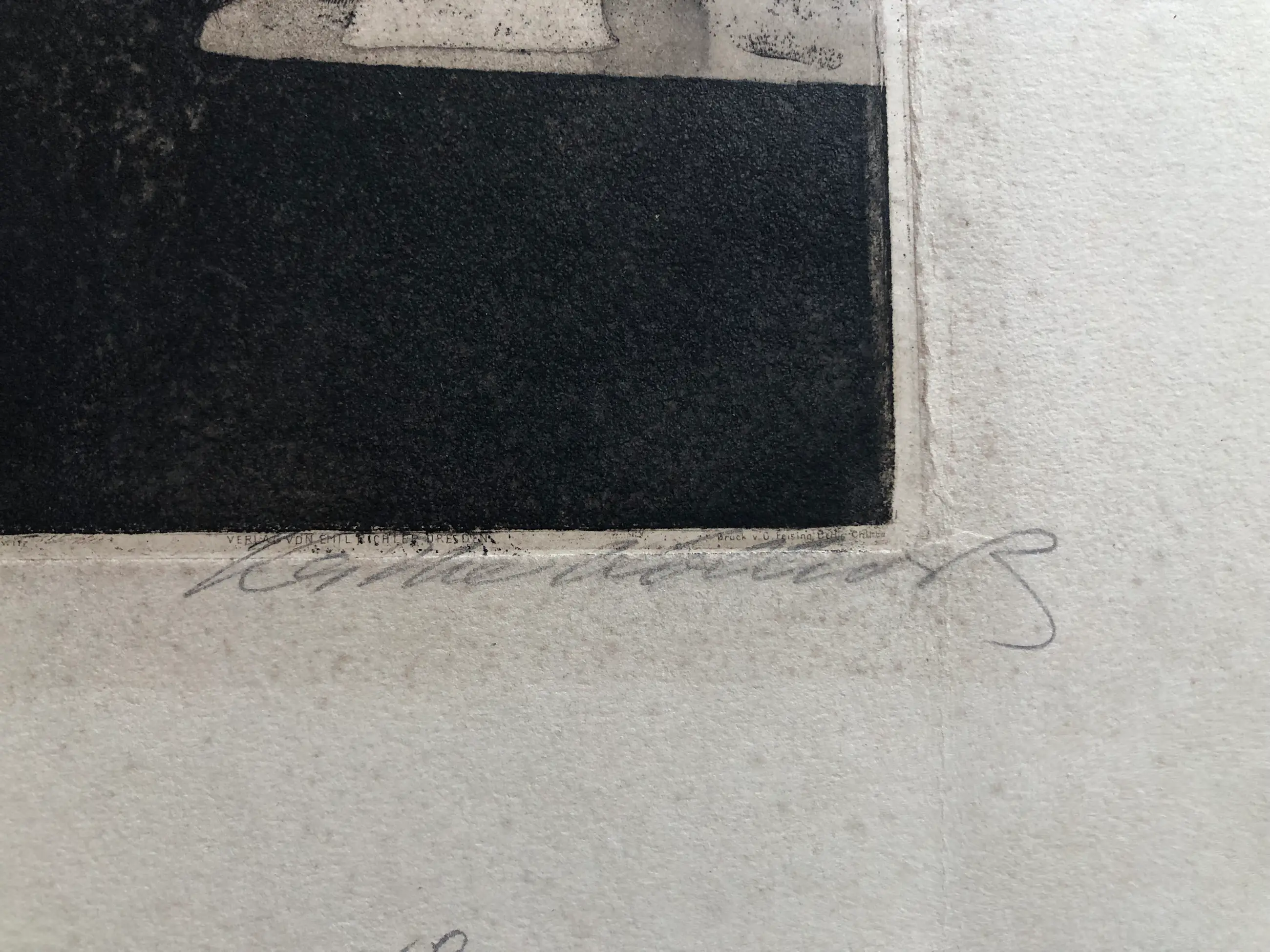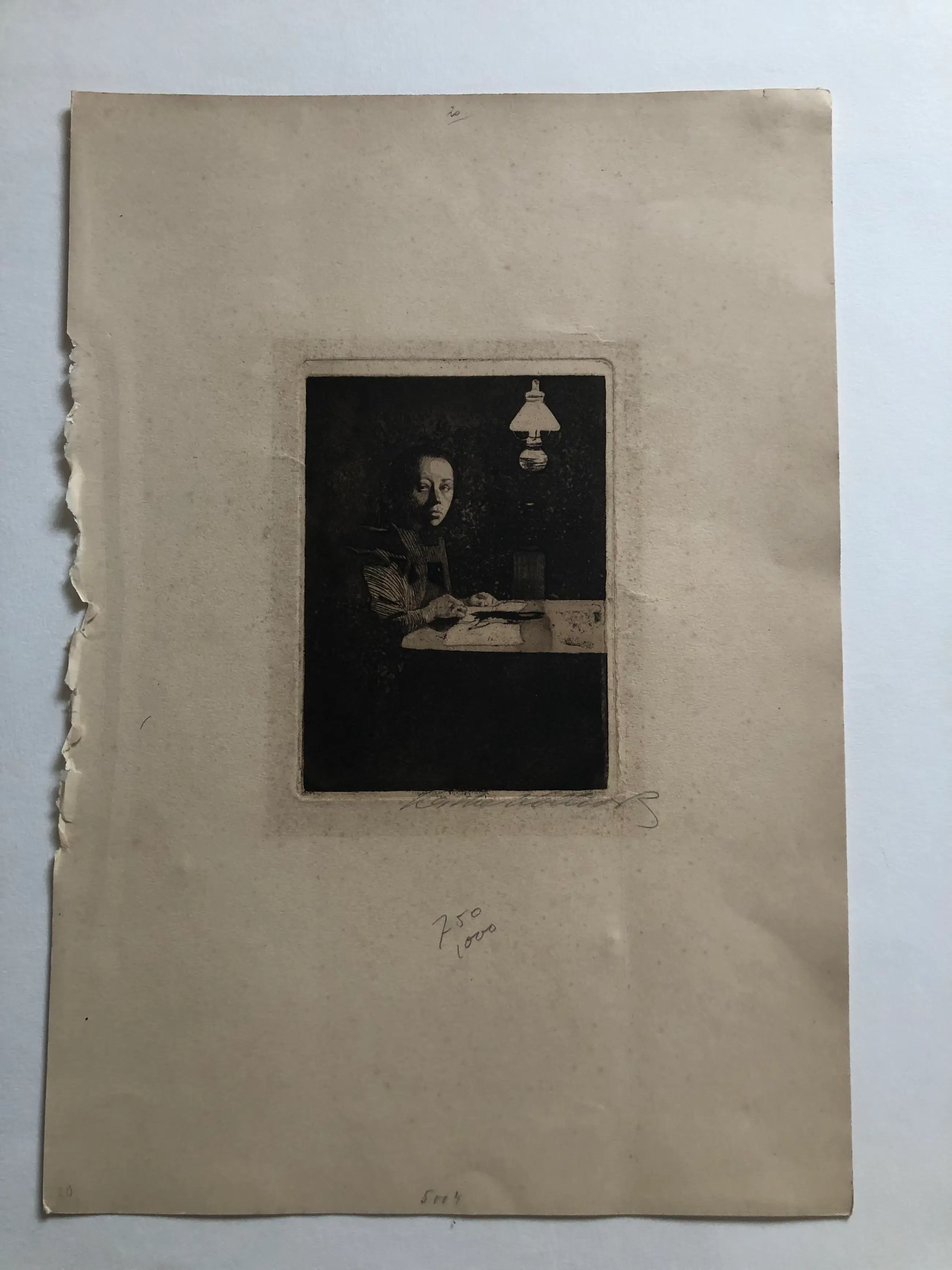 Een vroege ets van voor 1900 van Käthe Kollwitz. Deze is gedrukt 1921. Naam drukker en uitgever onder de afbeelding in kleine letters ( „Verlag von Emil Richter, Dresden“; „Druck v. O. Felsing, Berlin“). Uitgevoerd als fijn gedetailleerde ets op hoogwaardig papier. Deze editie draagt een zeldzame gelegenheids-signatuur in potlood, authentiek en gecontroleerd door het Käthe Kollwitz Museum, waarmee de herkomst en authenticiteit volledig zijn gewaarborgd.