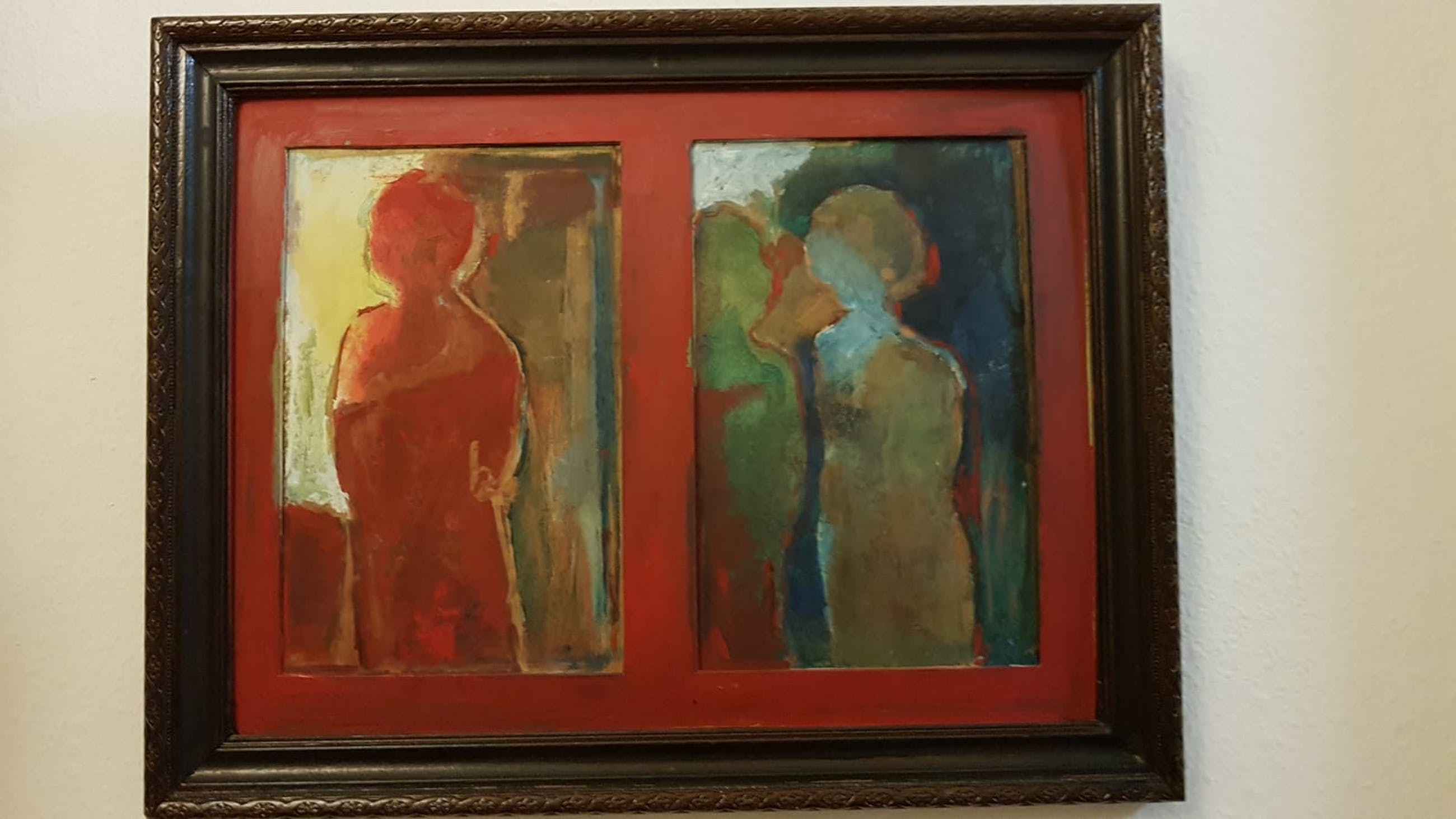 Heel apart kunstwerkje, mooie kleurstelling, houten passe partout (enigszins beschadigd)