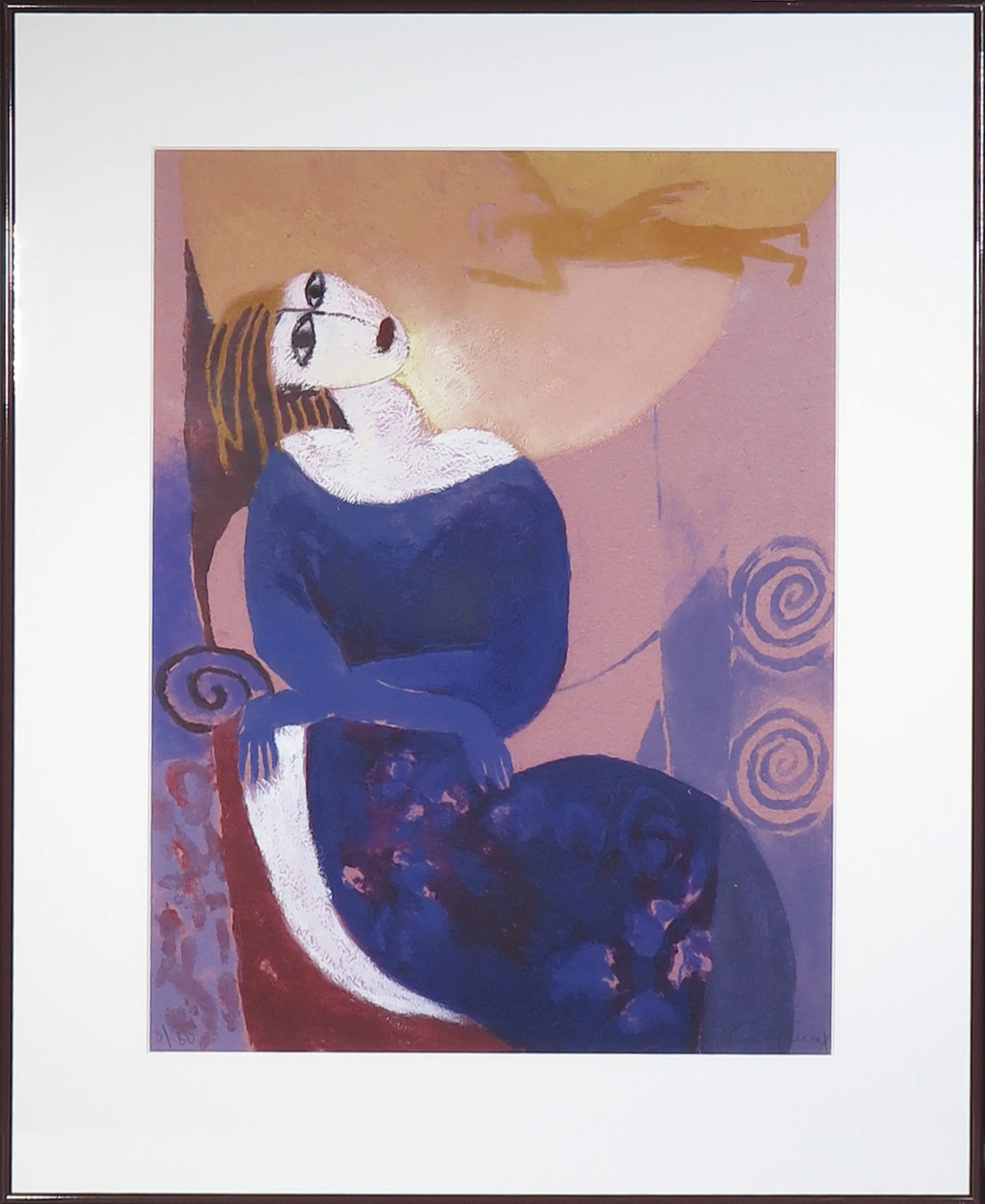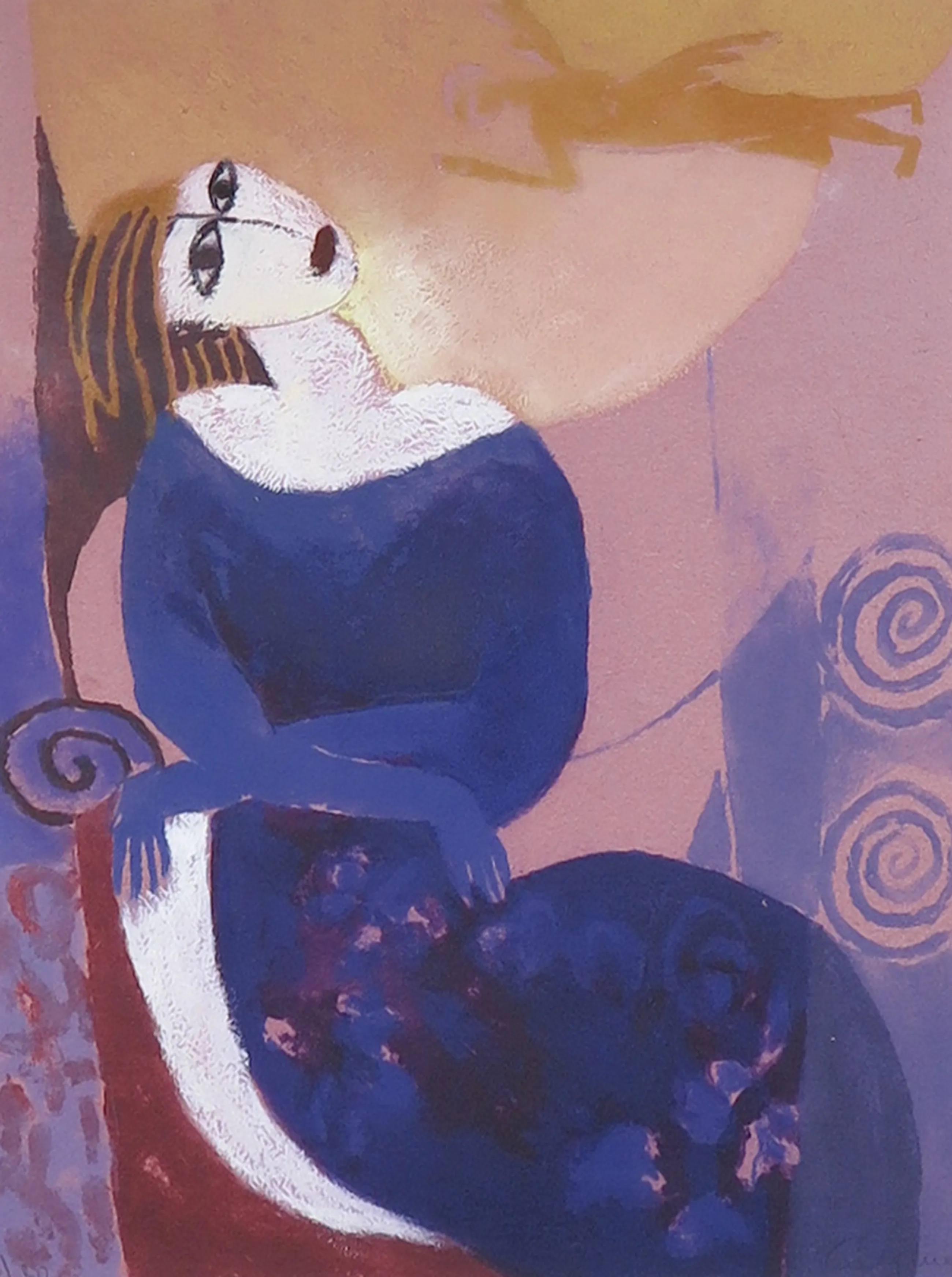 | Er zitten enkele beestjes achter de glasplaat. In de donkerpaarse partij (in de rok van het figuur) zit een kleine beschadiging van het papier. | |