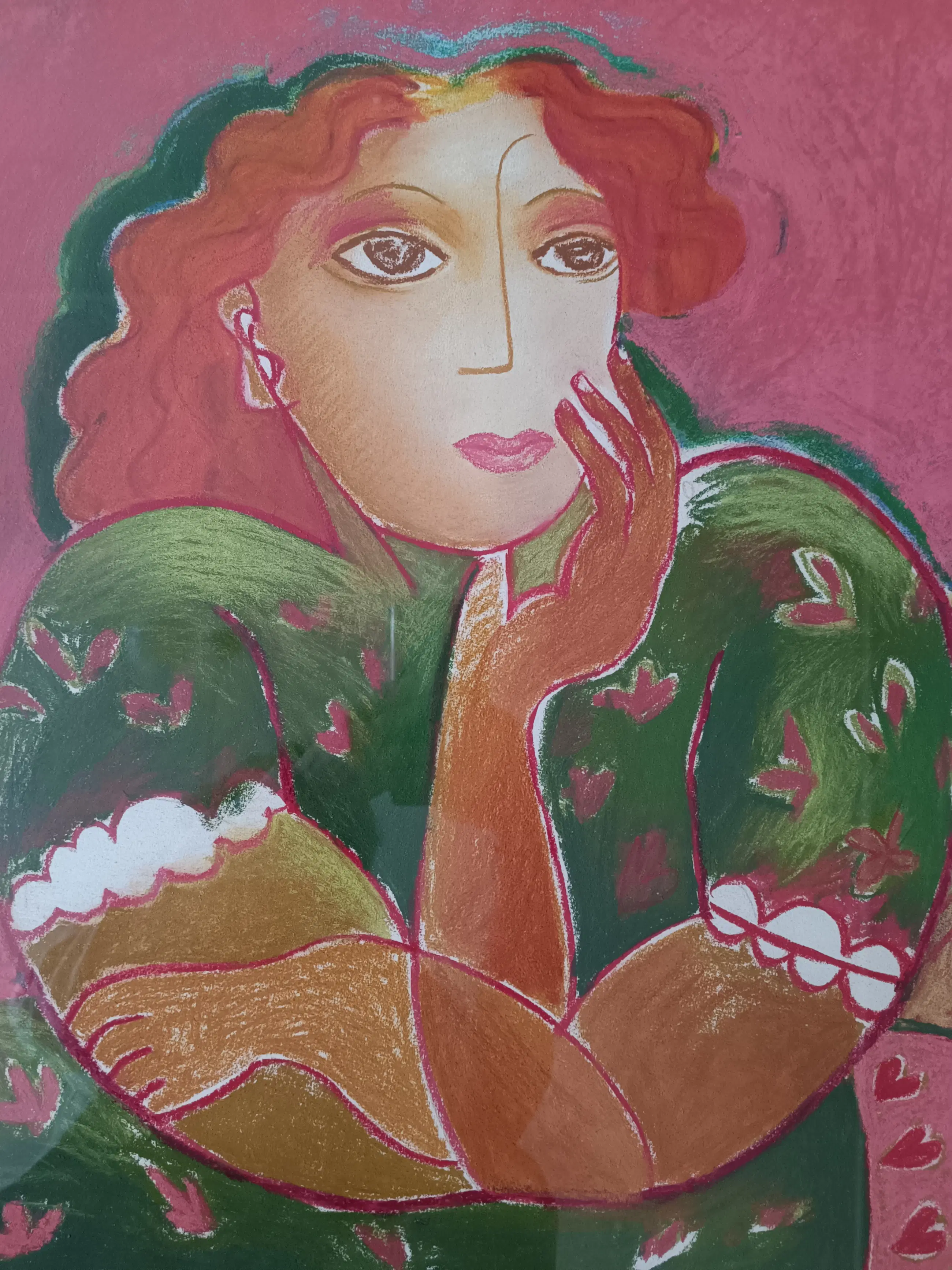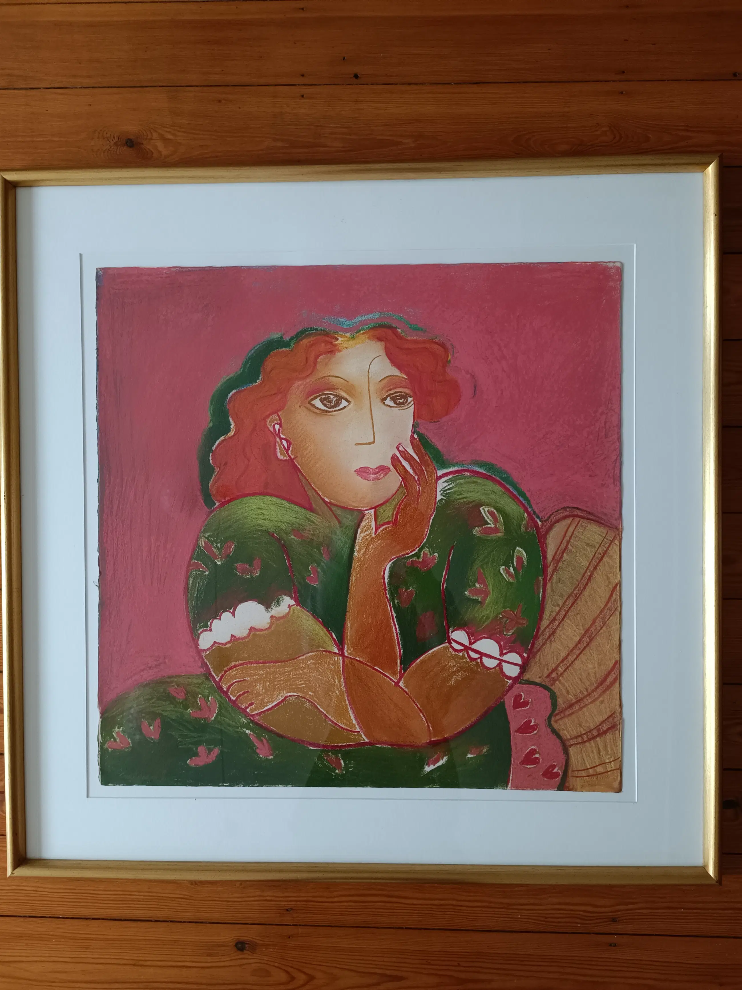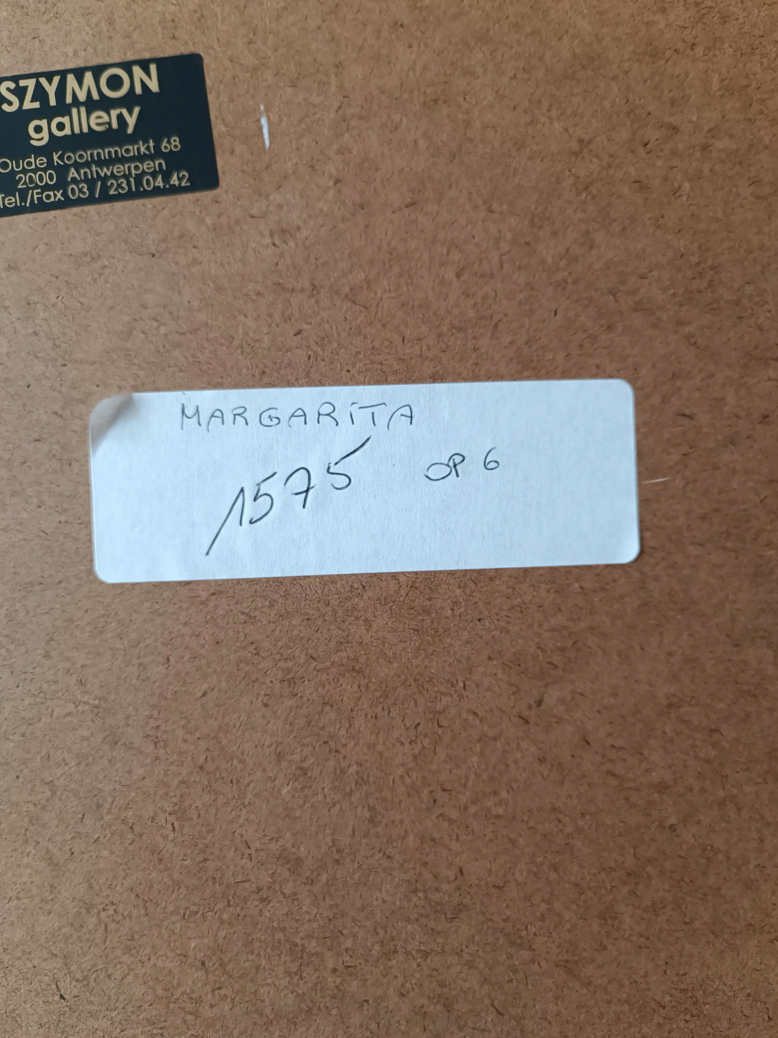 Groot origineel werk van Katrien Caymax. De titel wordt niet op het werk zelf vermeld maar wellicht is het Margarita, gezien dit op de achterkant genoteerd staat. Kleuren groen, framboos, oranjebruin. Zeer mooie vergulde lijst.