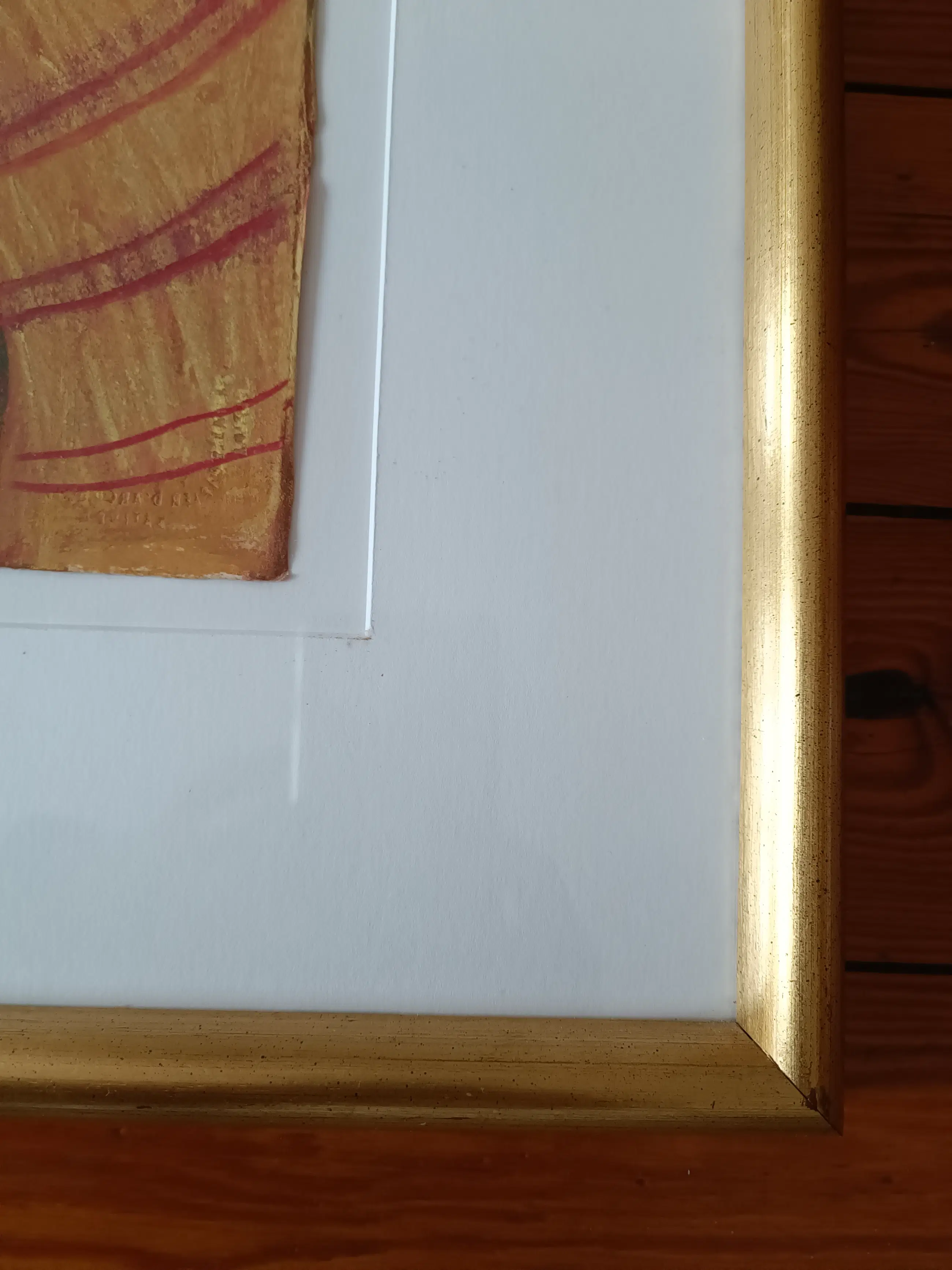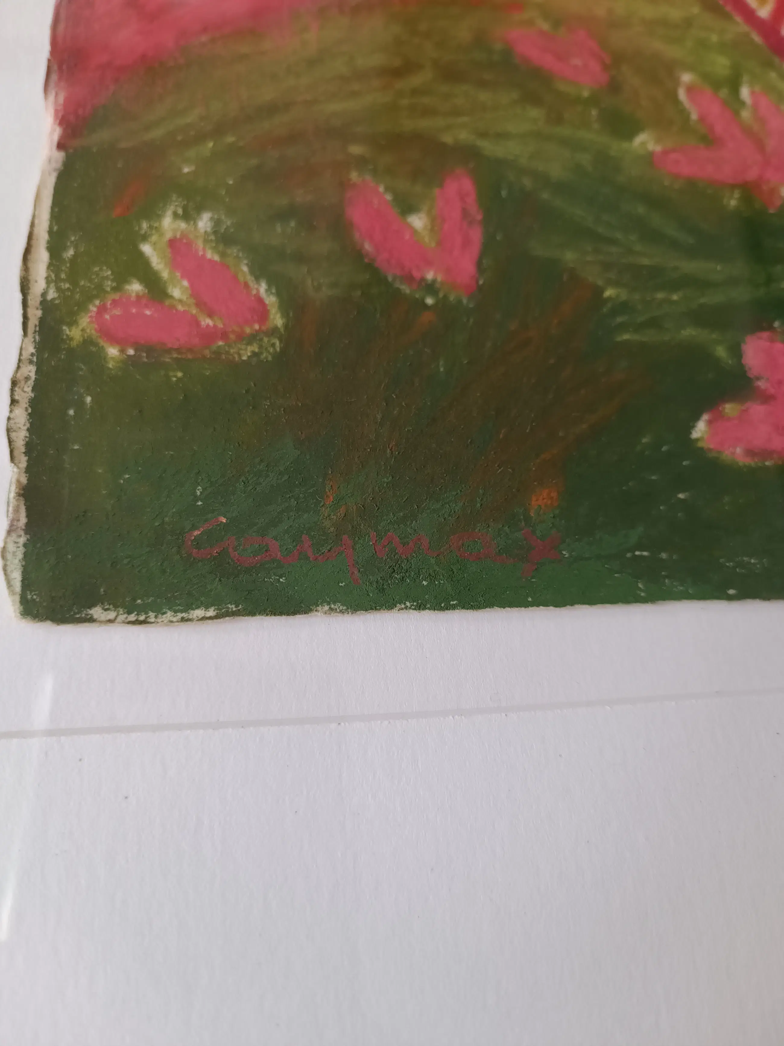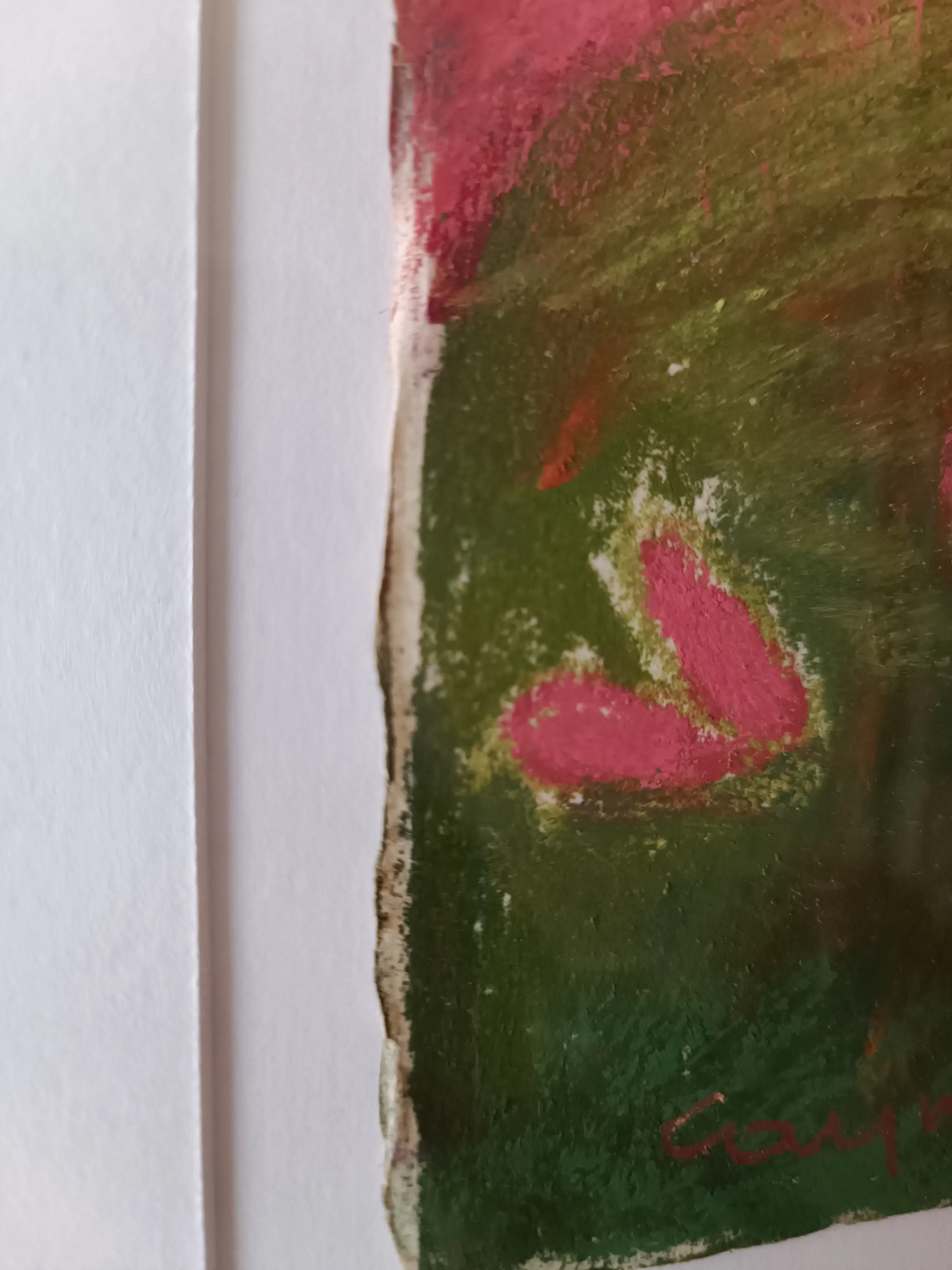 Groot origineel werk van Katrien Caymax. De titel wordt niet op het werk zelf vermeld maar wellicht is het Margarita, gezien dit op de achterkant genoteerd staat. Kleuren groen, framboos, oranjebruin. Zeer mooie vergulde lijst.
