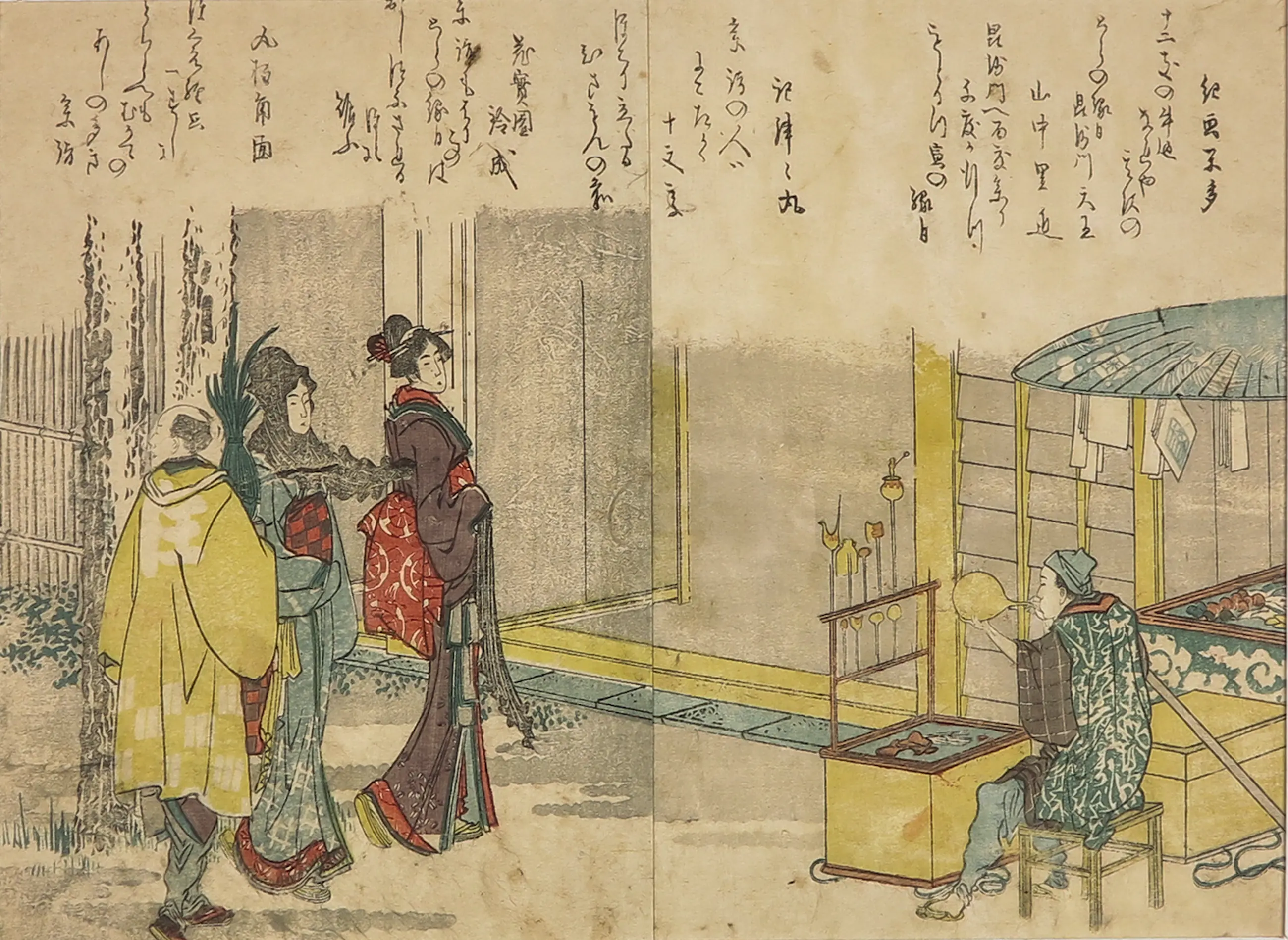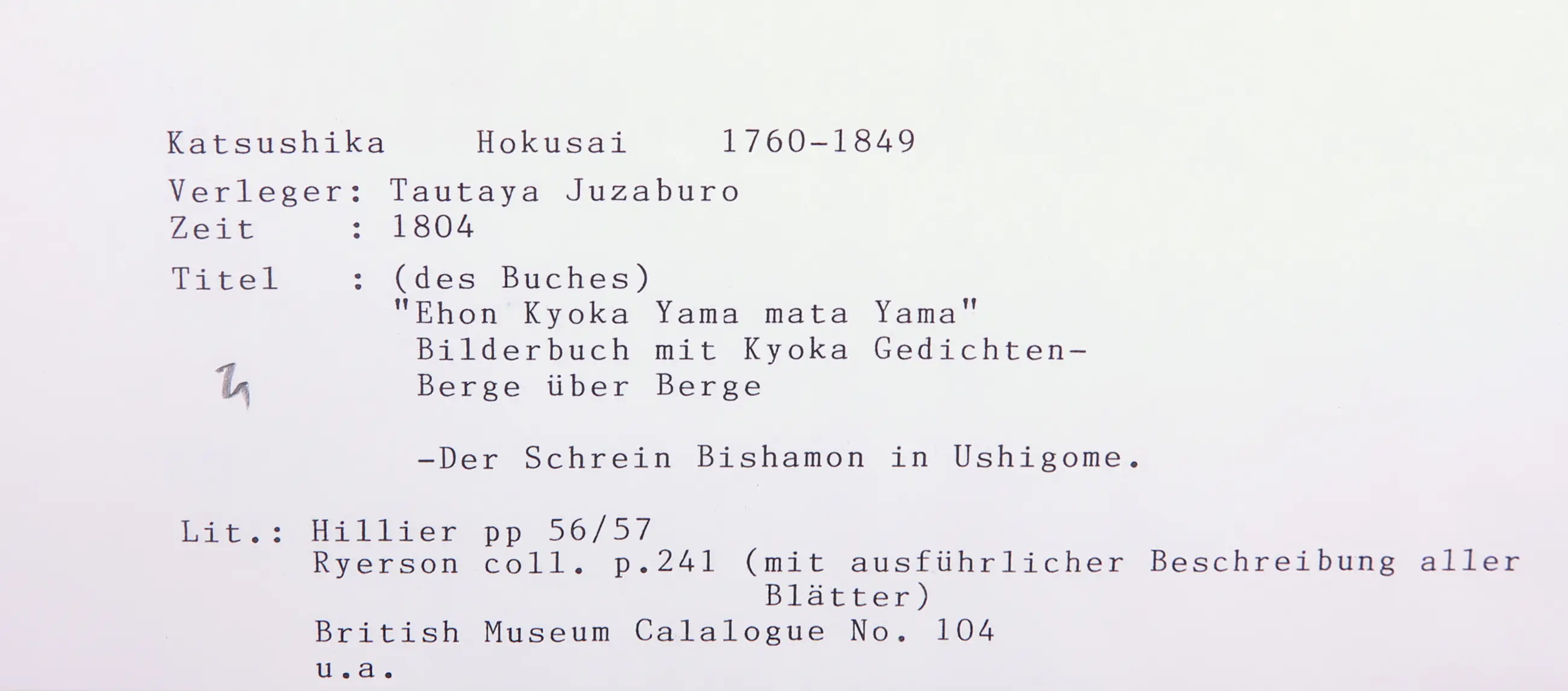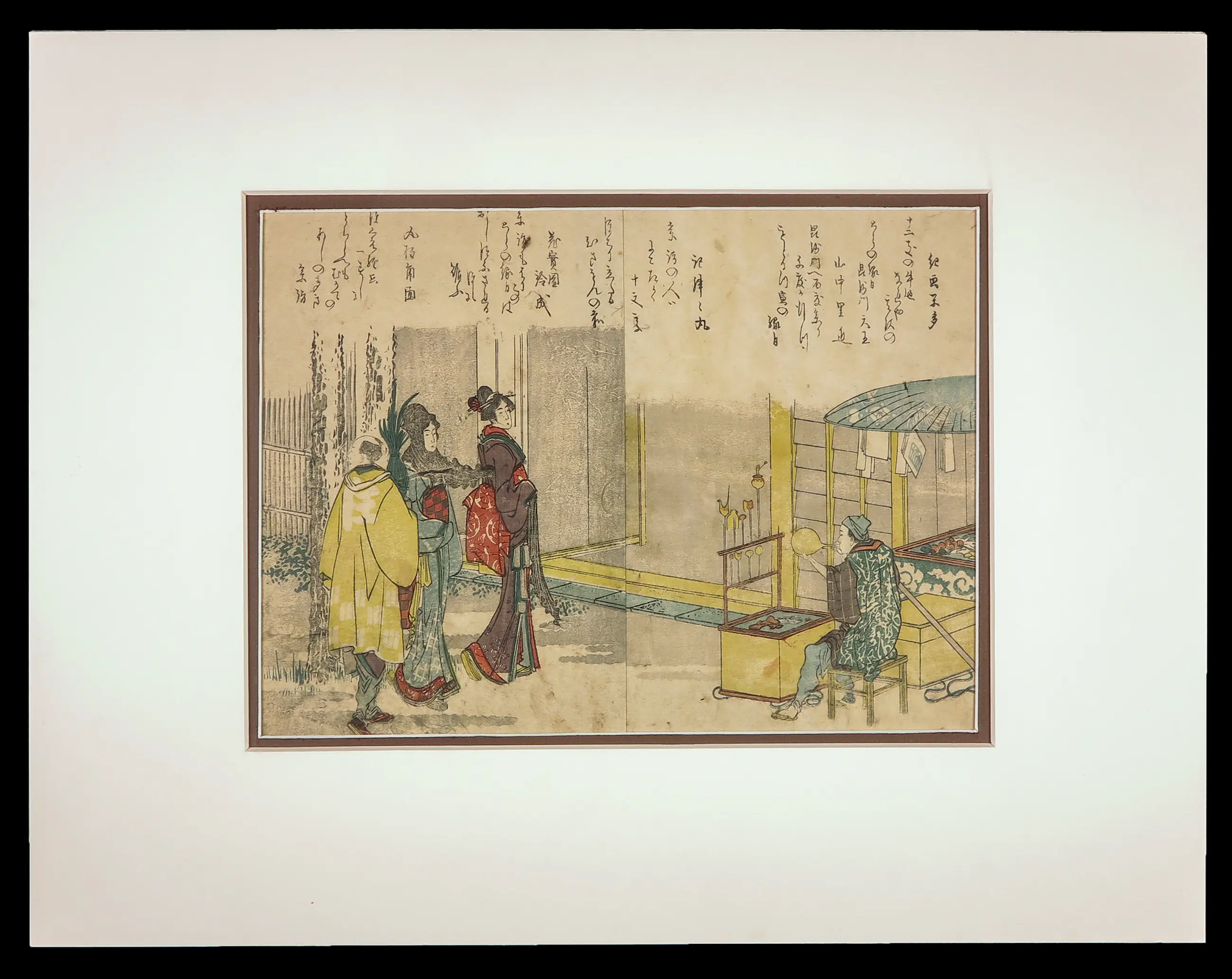 Japanse prent in zeer net passe-partout. Deze prent is afkomstig uit een boek getiteld "Ehon kyoka yama mata yama"; vertaald: "Fotoboek van Kyoka: Bergen en Bergen"