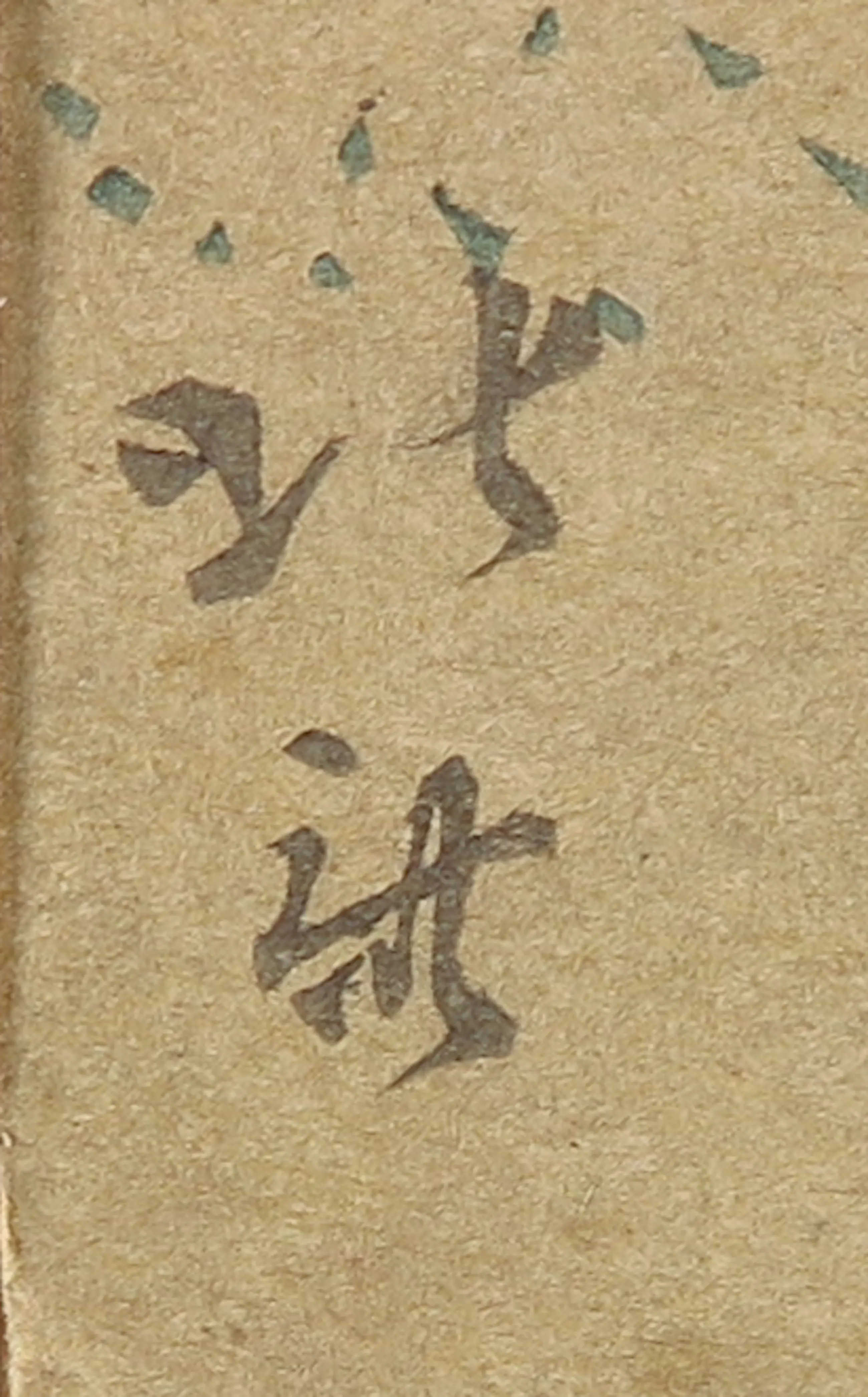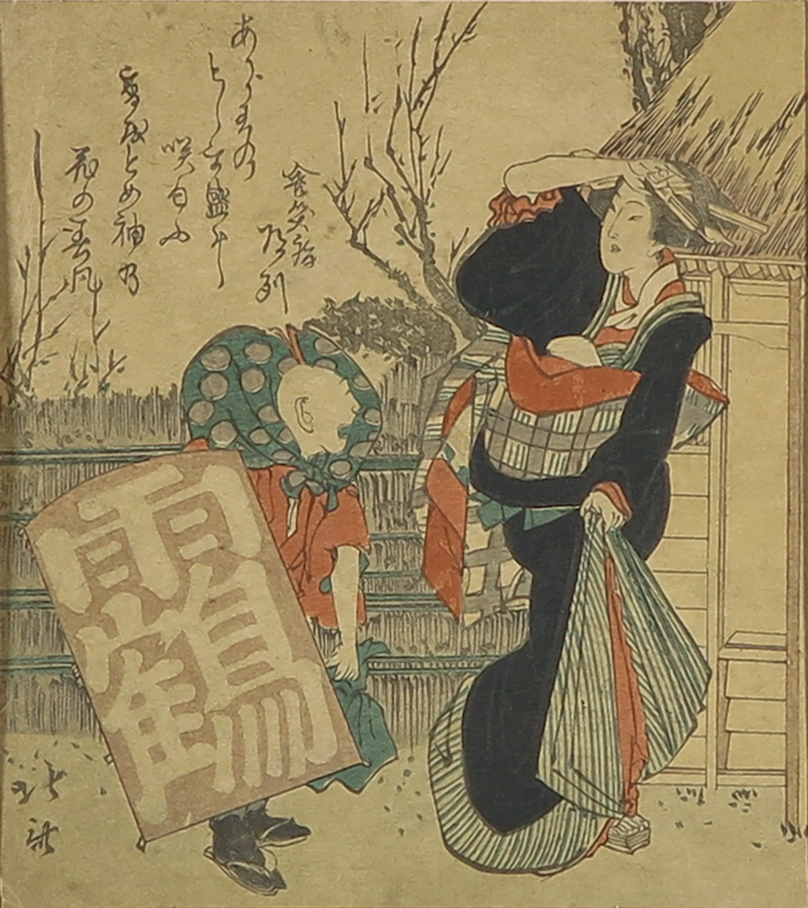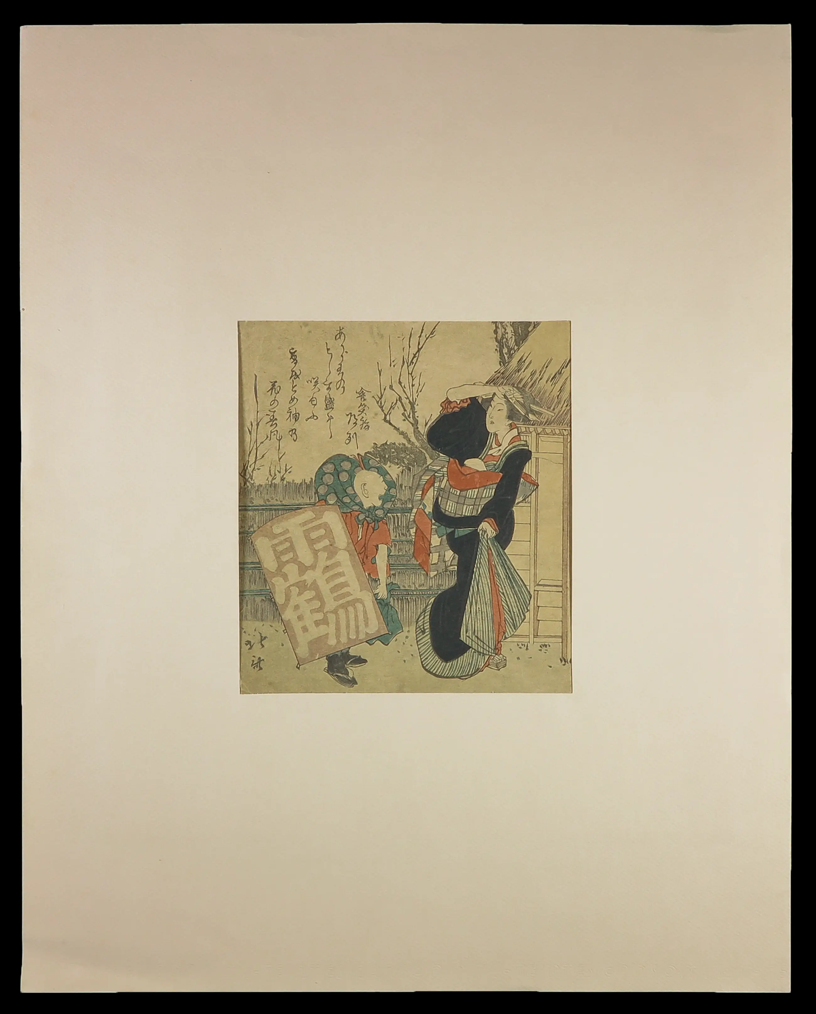 Japanse surimono (voor speciale gelegenheden) prent in net passe-partout. Gesigneerd.