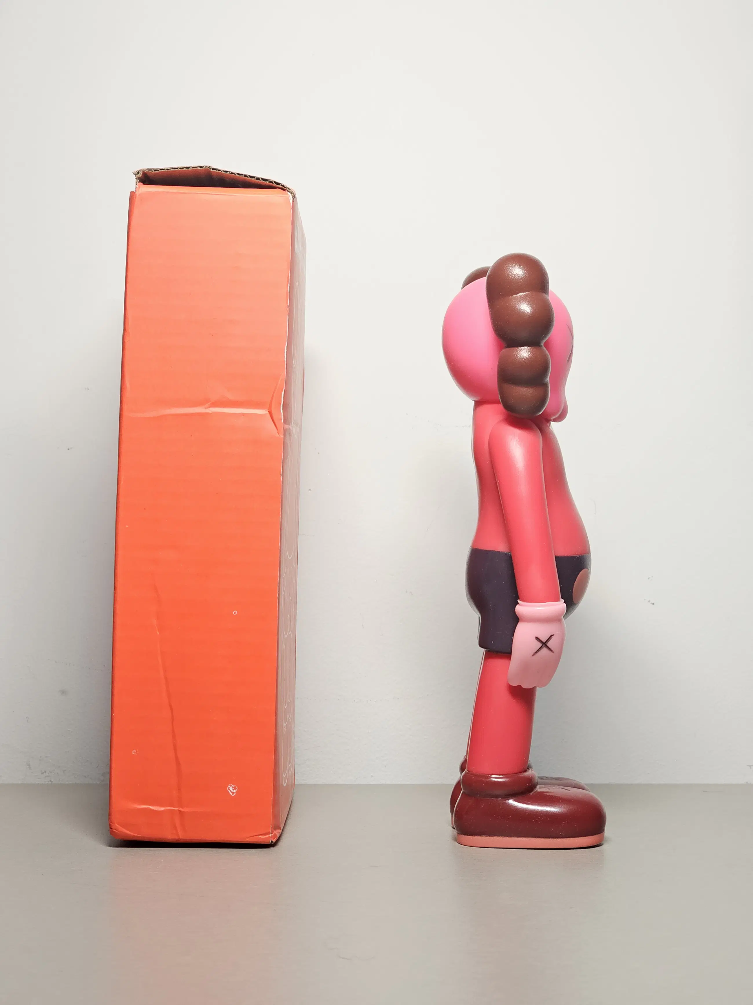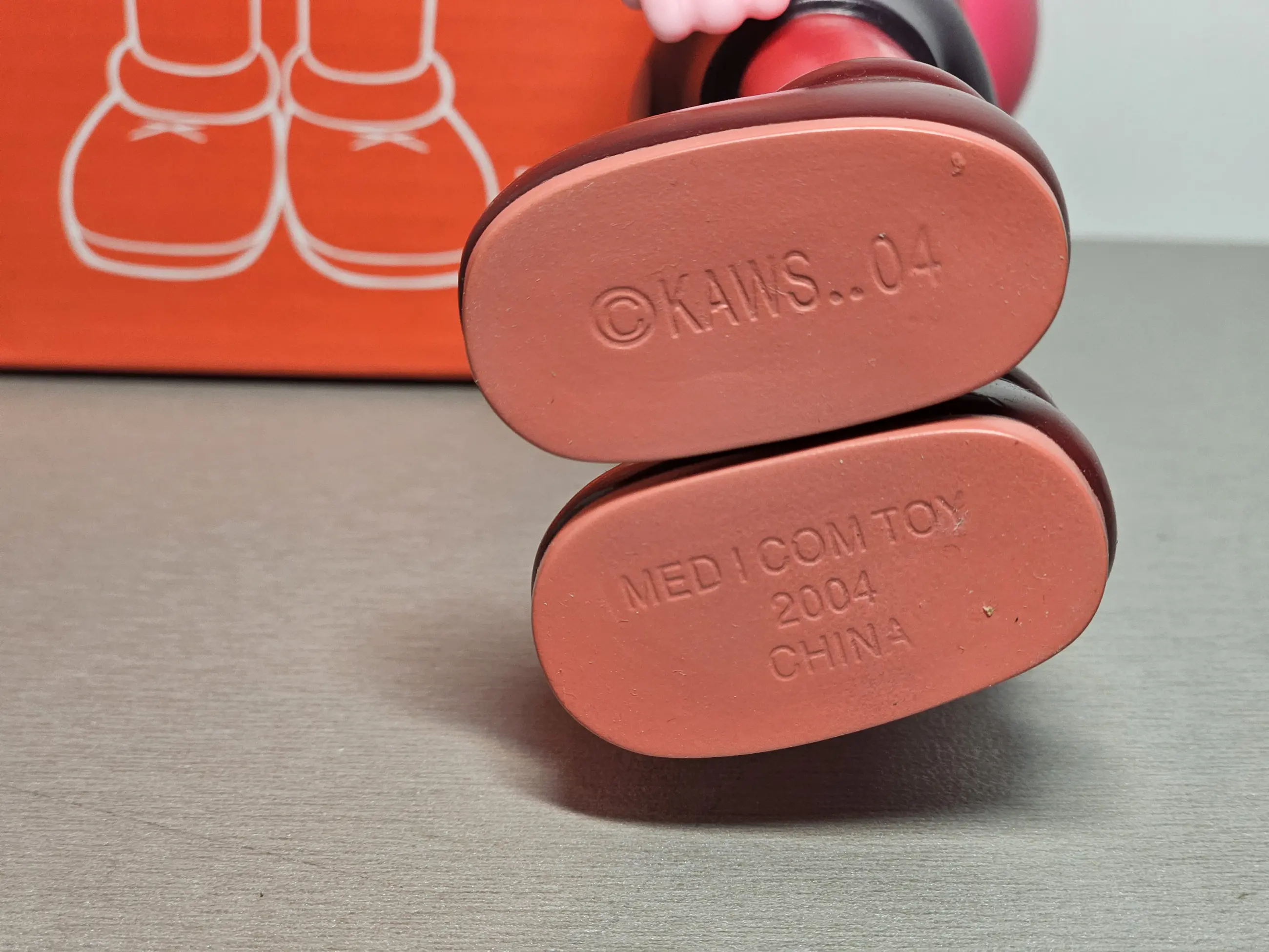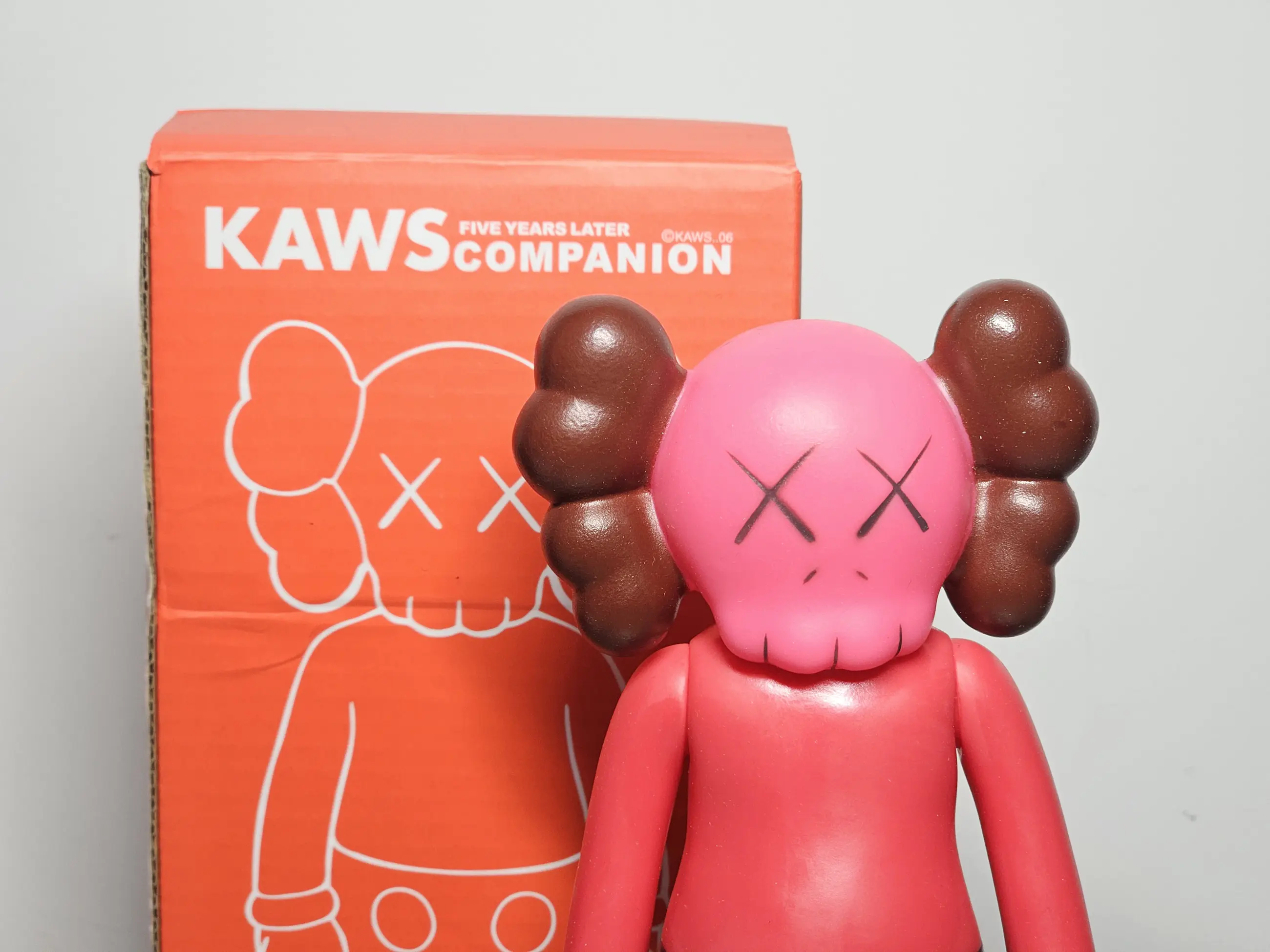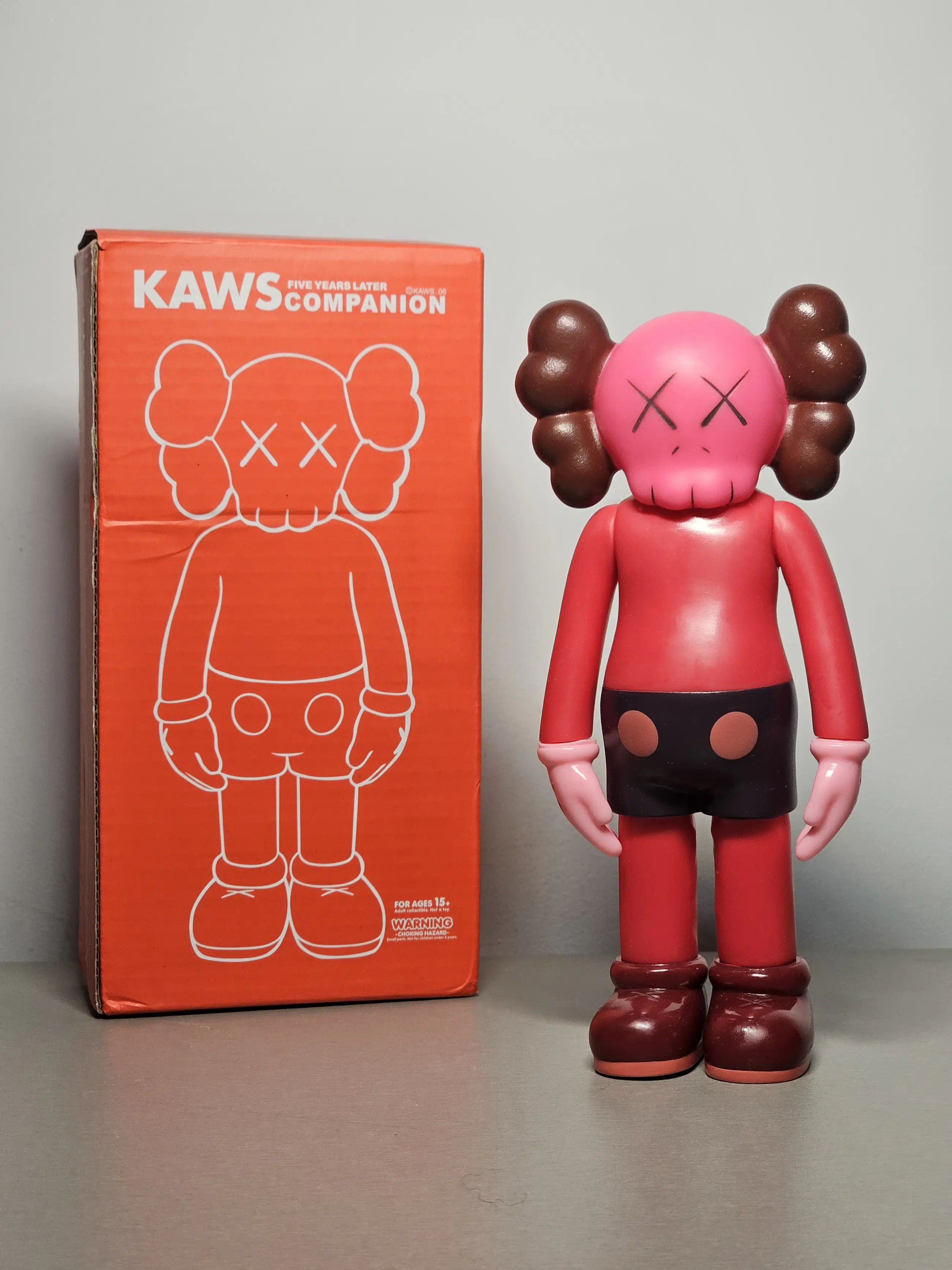 Een opvallende verschijning van de iconische KAWS Companion, uitgevoerd in een unieke rood-met-roze kleurstelling. Dit figuur is gebaseerd op het bekende "Five Years Later" ontwerp en is een gewild item voor liefhebbers van street art en designer toys.