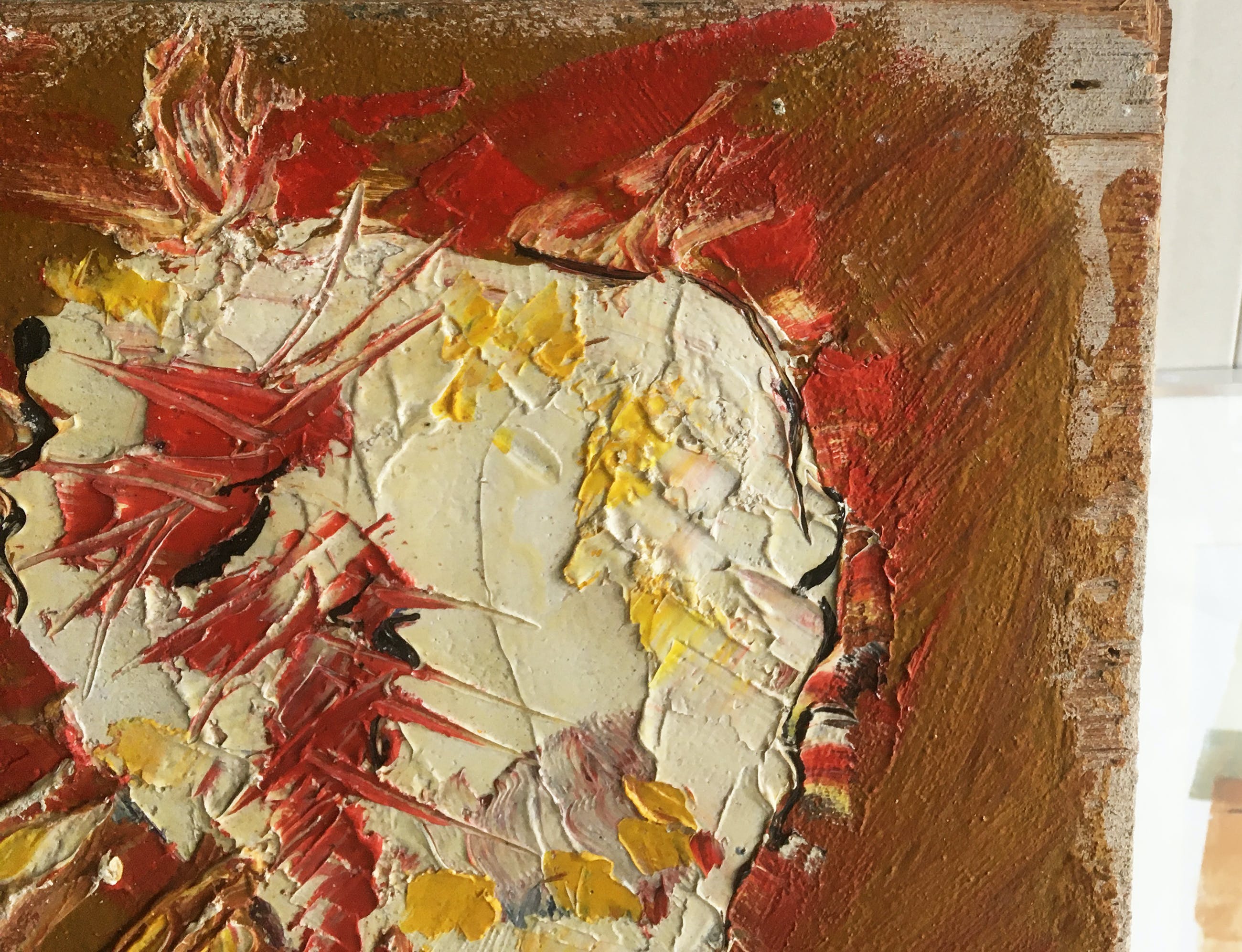 het werk is geschilderd op een stuk spaanplaat, zie detailfoto's