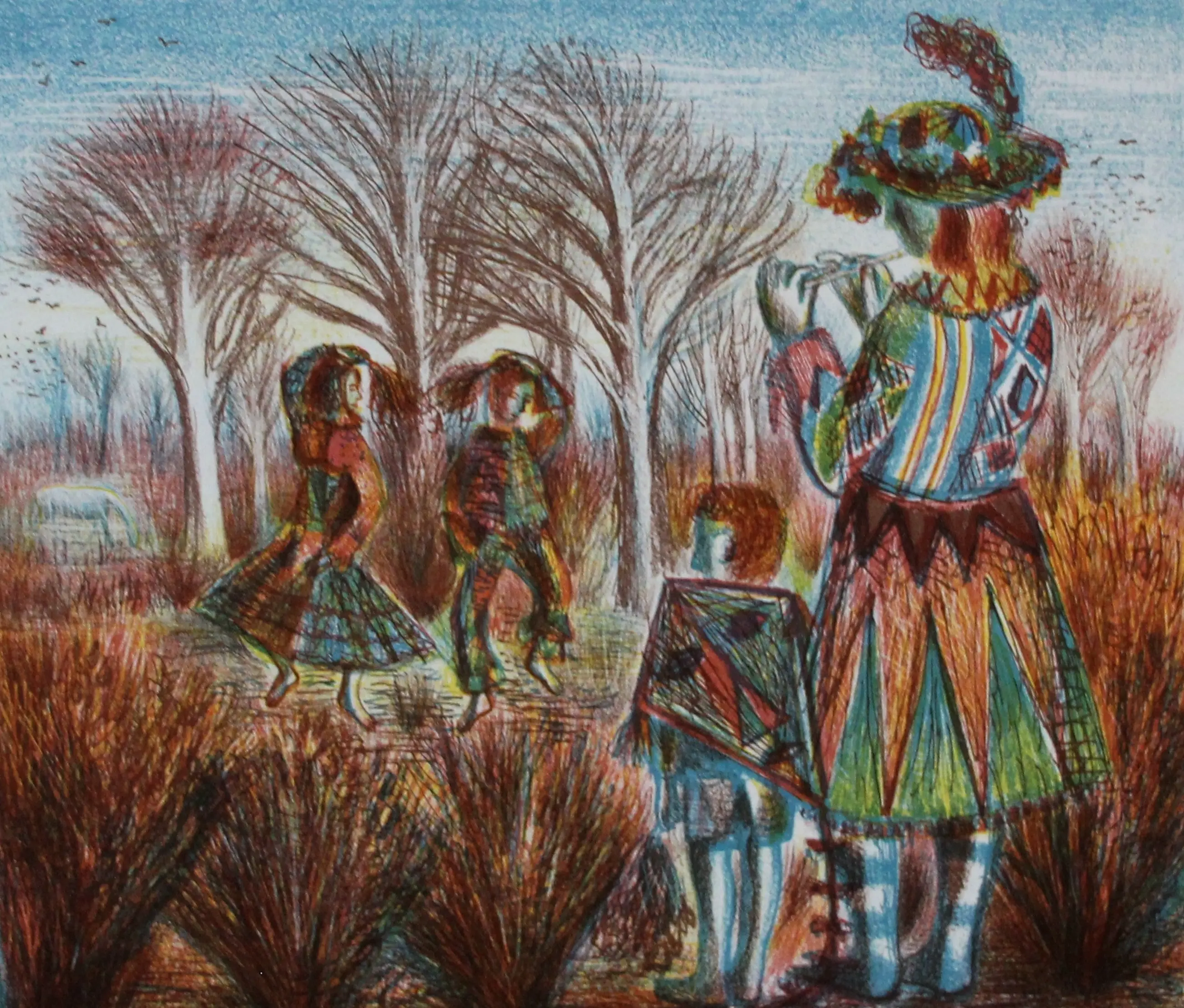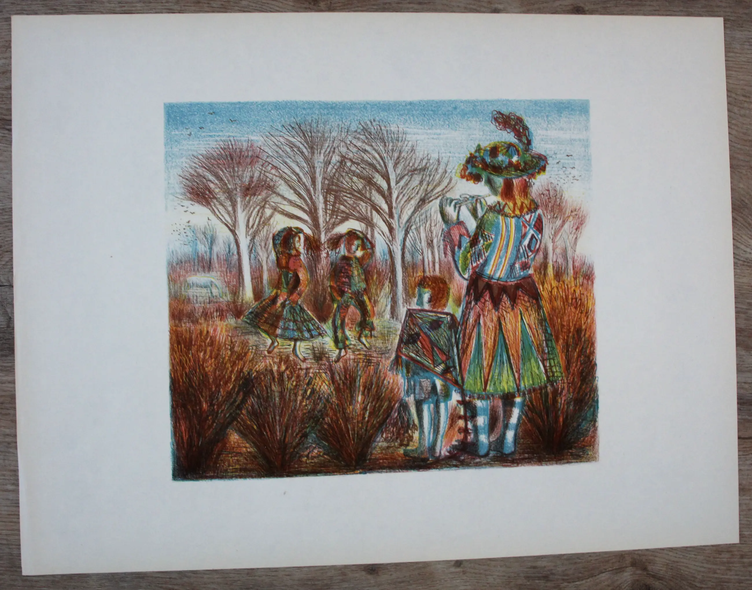 Kleurenlitho van Kees Andrea. Titel: De fluitspeelster. Afmetingen blad: H47.5 x b63 cm. Afmetingen voorstelling: H32 x b37cm. Het werk is niet gesigneerd.
