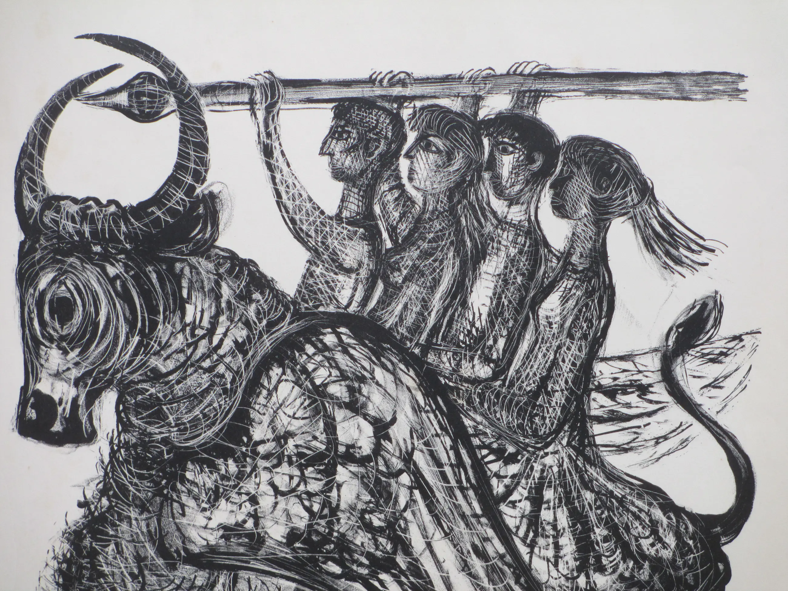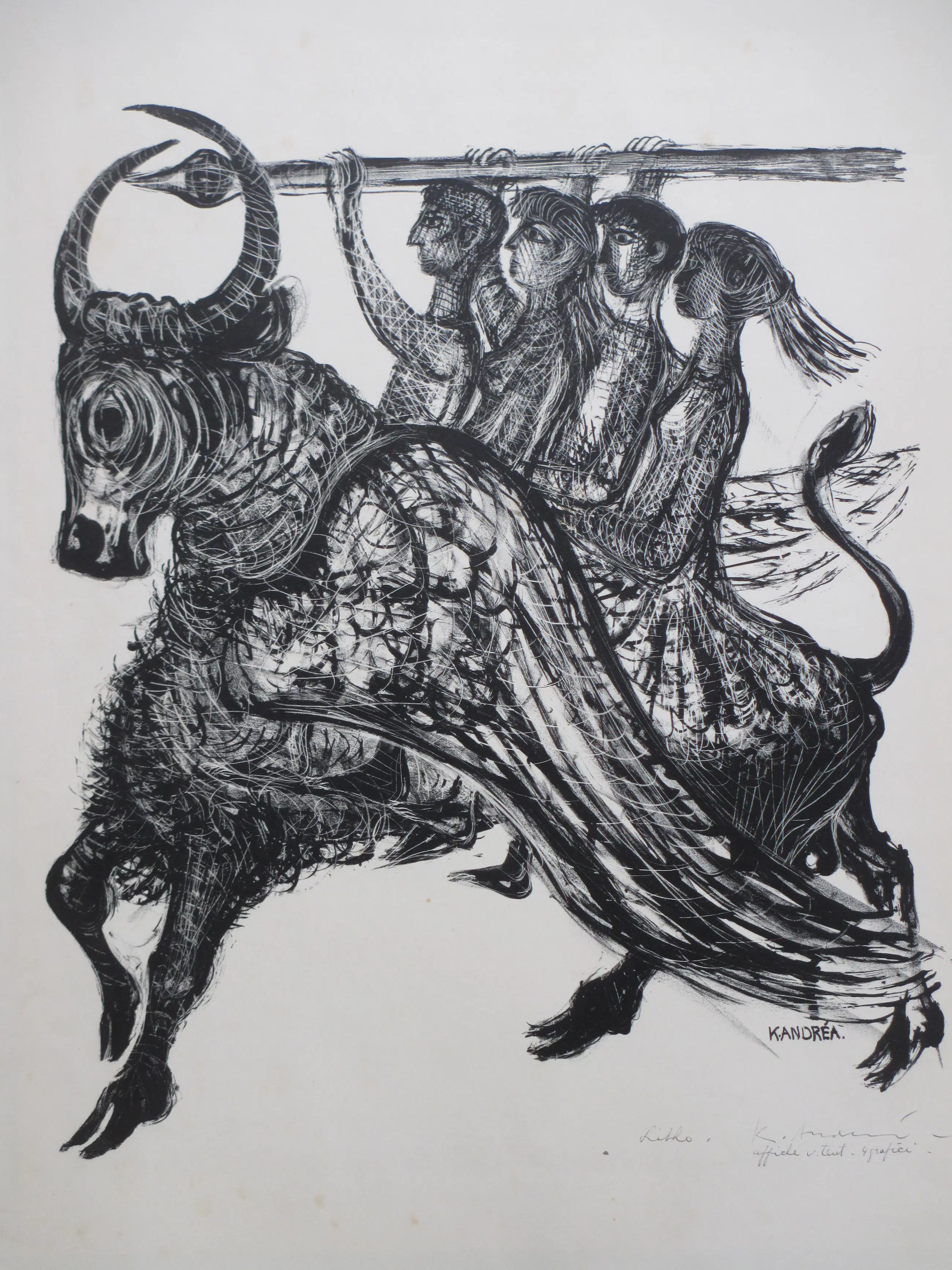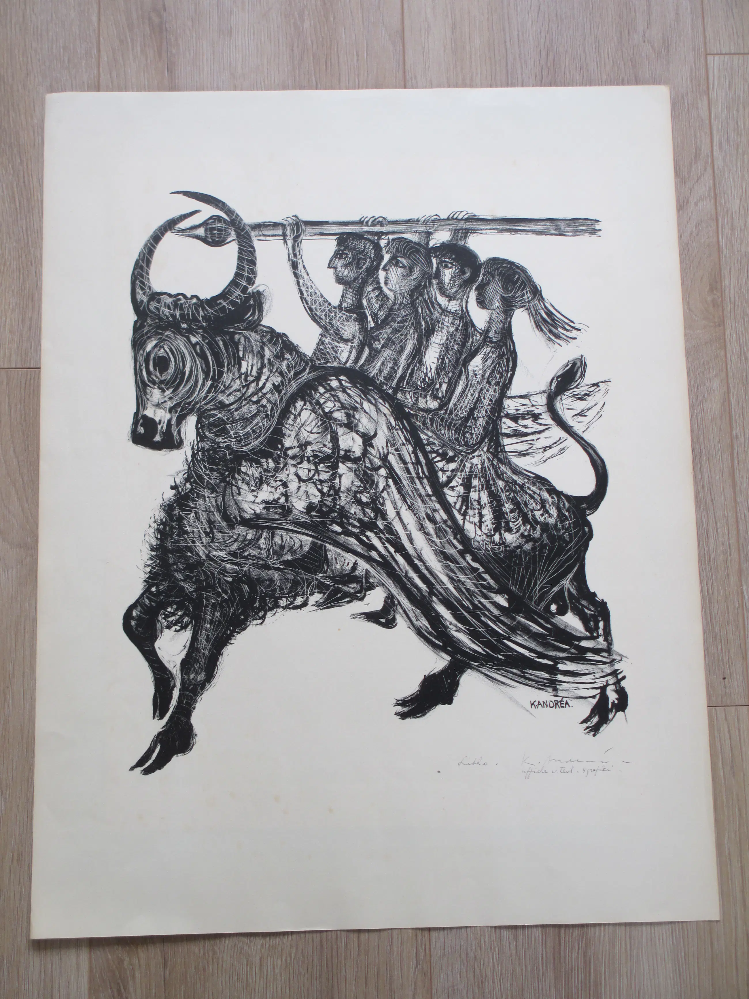Litho door Kees Andrea Voorstelling van de Vier Heemskinderen Losbladig, beeldmaat 45x38, bladmaat 65x50 Gesigneerd met annotatie r.o. : 'K Andrea' en 'affiche van tent. 4 grafici' Tevens gesigneerd in de druk r.o.: 'K.Andrea' Authenticiteit volledig gegarandeerd