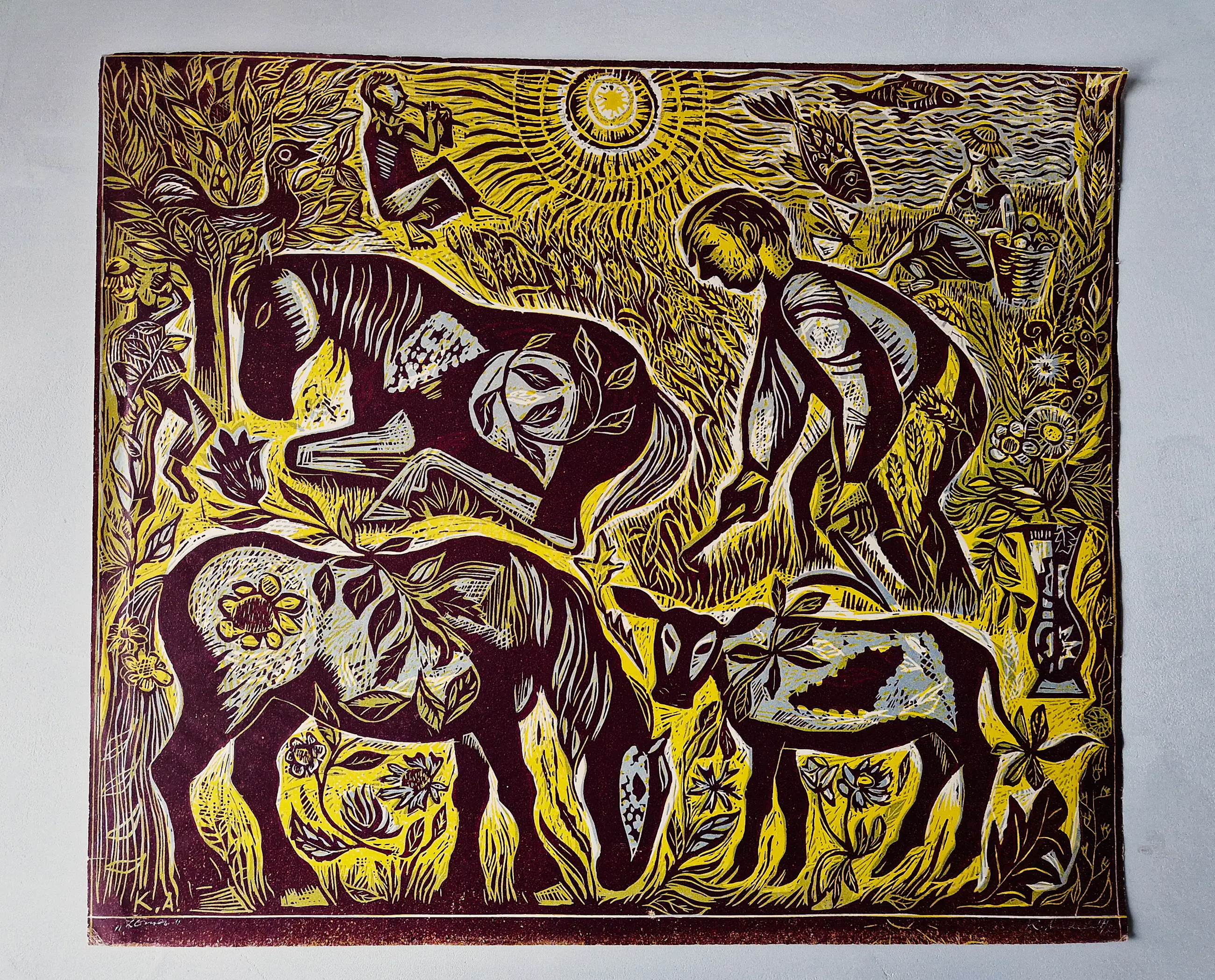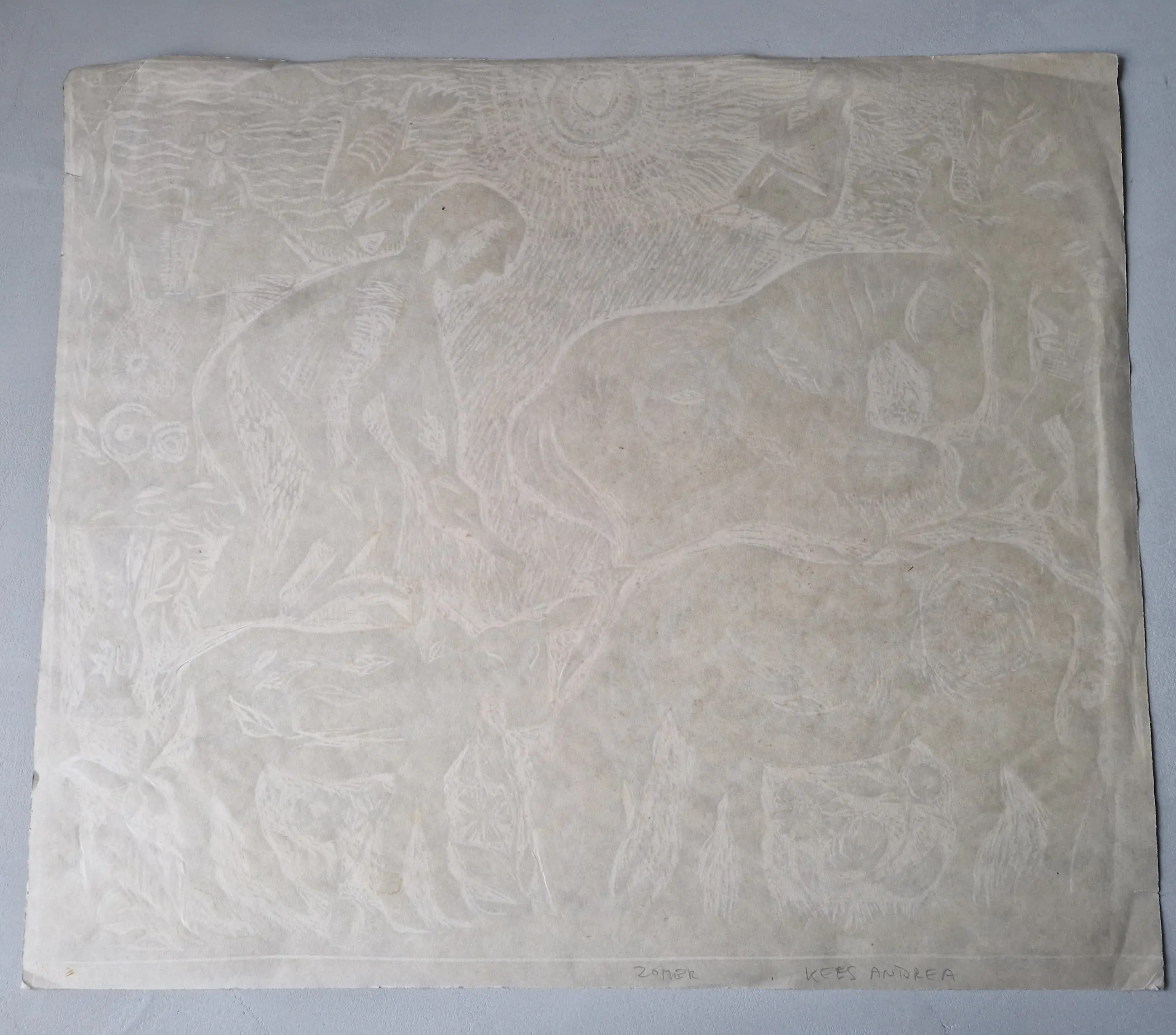 Kees Andréa (1914-2006) schilderde, tekende, aquarelleerde, etste, lithografeerde en maakte ontwerpen voor gobelins, wandmozaïeken en glas-in-loodramen. Zijn werk is kleurrijk en quasi naïef van stijl. Toen men hem eens vroeg of hij ook abstract ging schilderen, antwoordeKees Andrea: 'Nee, omdat ik het schilderen zelf abstract vind. Als ik een schilderij met een haan en boeket schilder is dat afwegen van de kleuren en vlakken voor mij een abstracte bezigheid. Maar het abstracte schilderen is het kind met het badwater weggooien.'