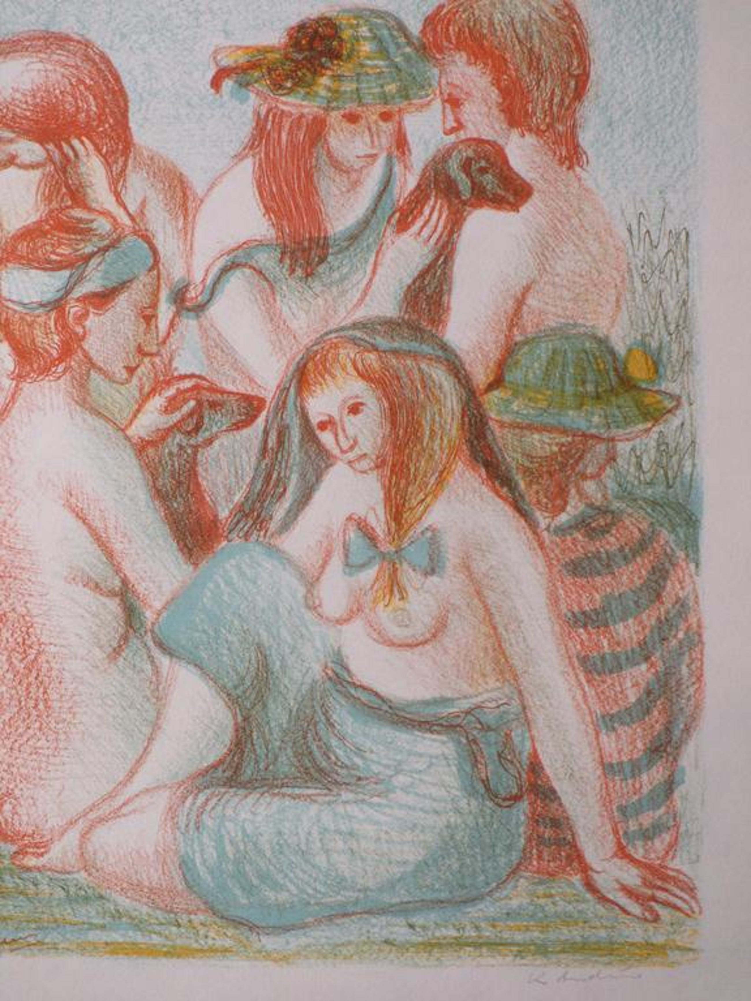 Voorstelling van een zestal baadsters met een hond