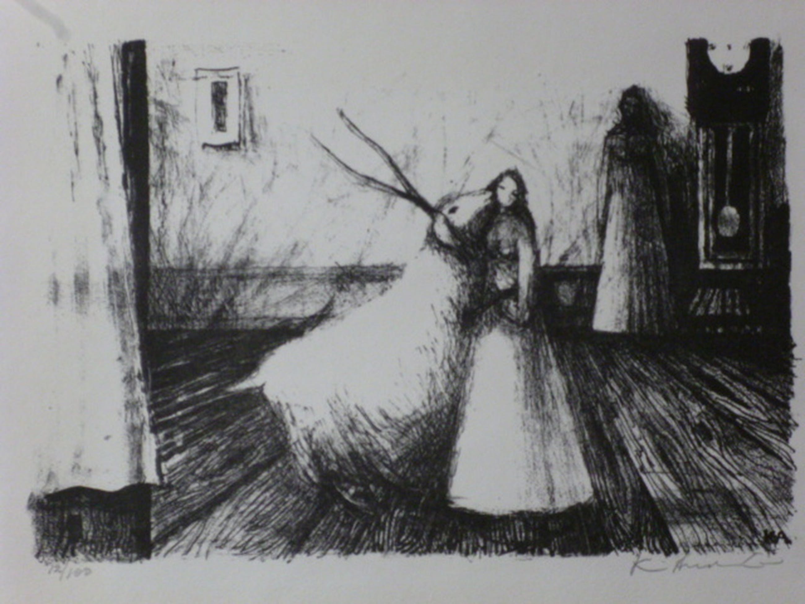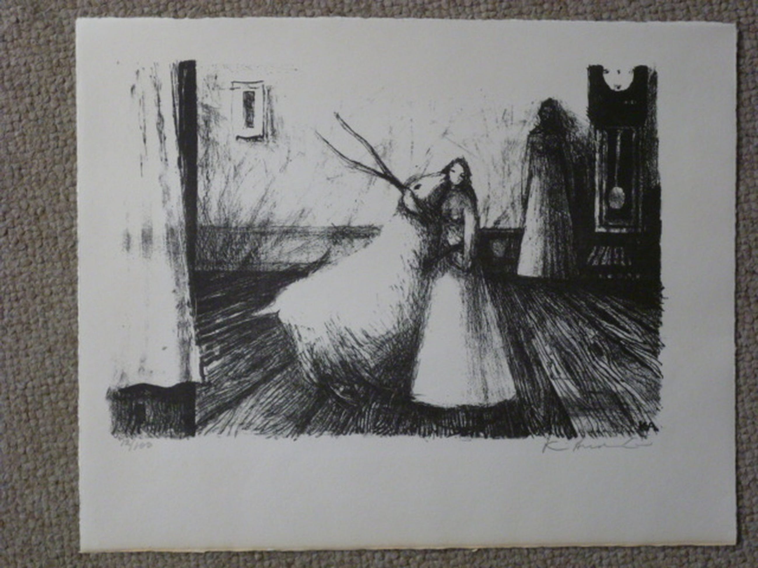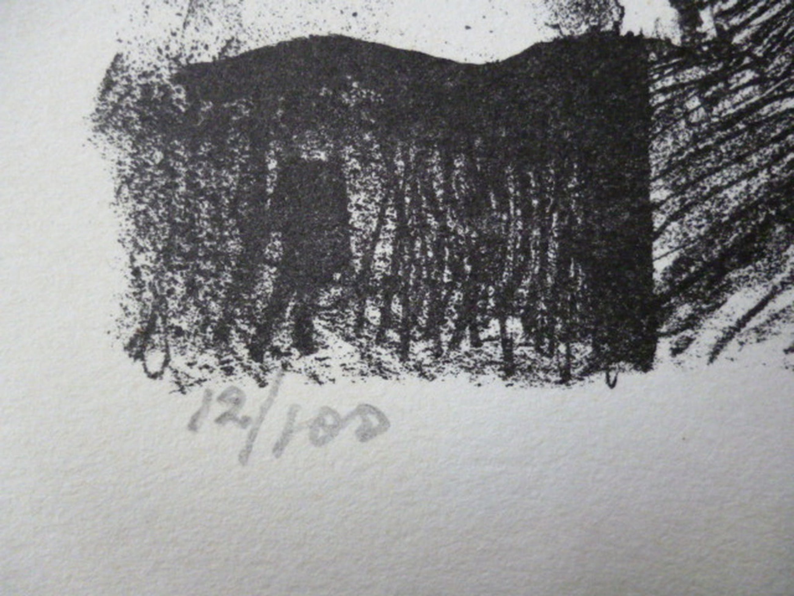 Litho, potlood gesigneerd rechtsonder. Genummerd 12/100 linksonder. Initiialen in de steen rechtsonder.
