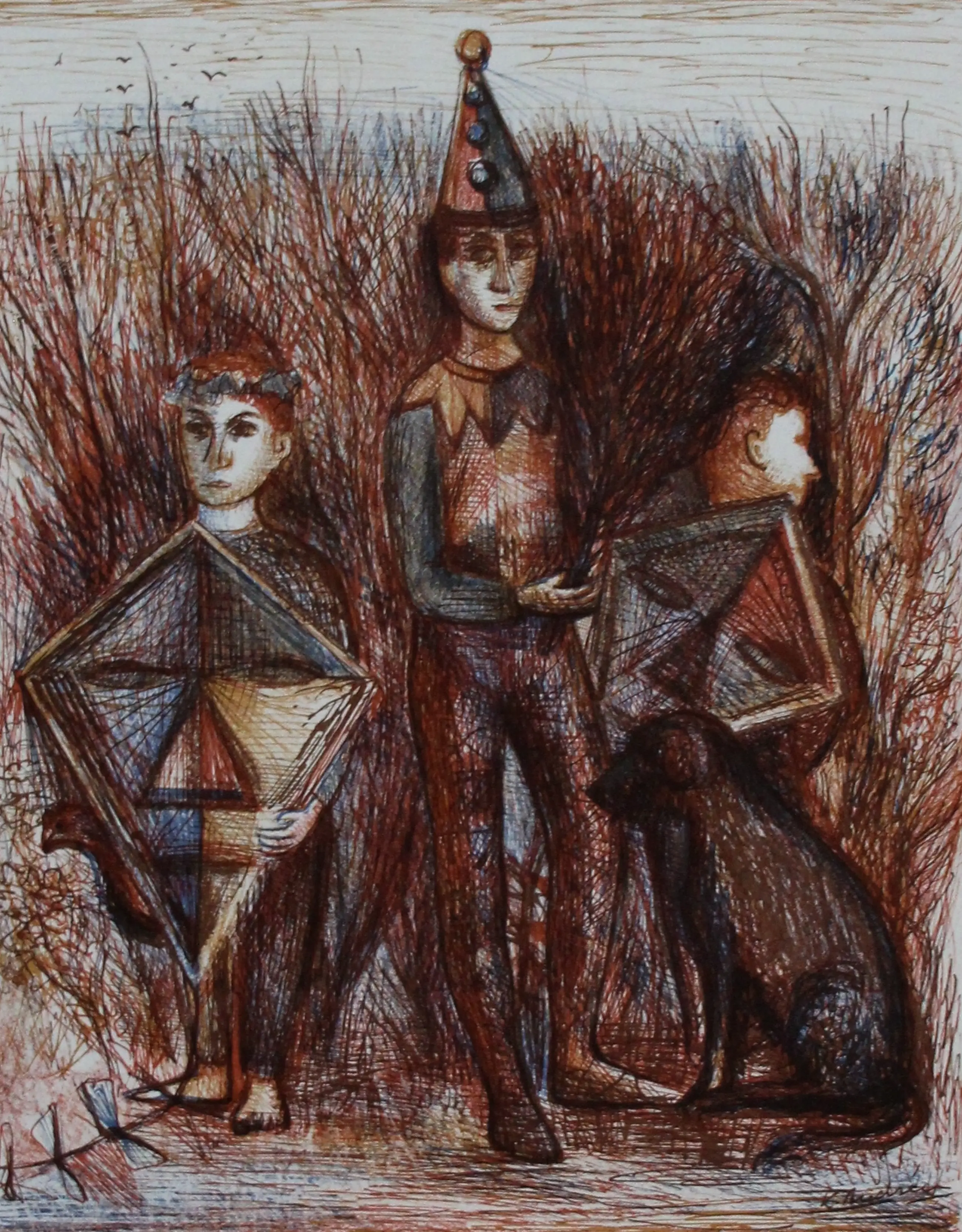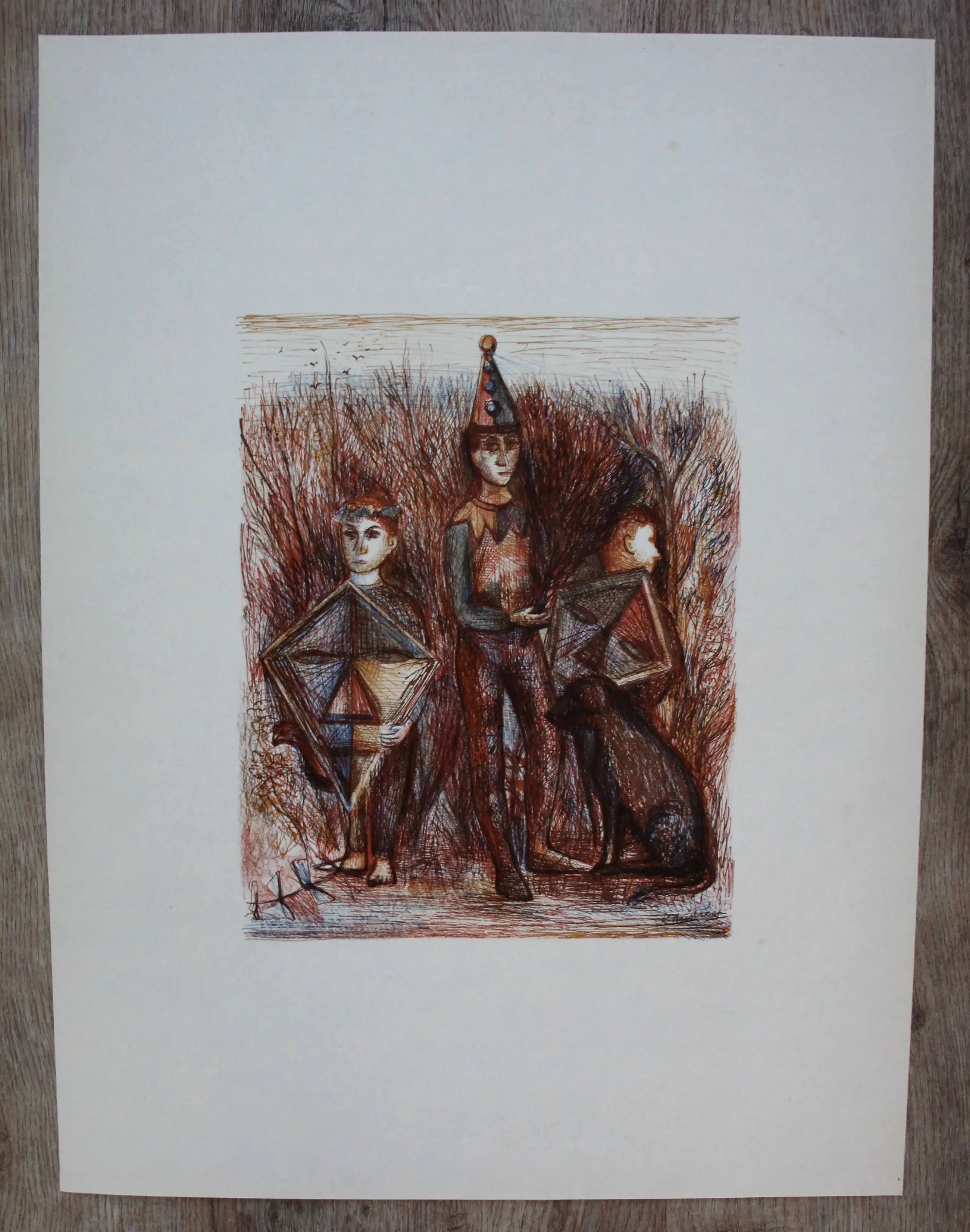 Kleurenlitho van Kees Andrea. Titel: Harlekijnen met vliegers en hond. Afmetingen blad: H63 x b46 cm. Afmetingen voorstelling: H32 x b25 cm. Het werk is rechtsonder in de druk gesigneerd. De authenticiteit van het aangeboden werk wordt volledig gegarandeerd. Een certificaat van echtheid kan, op aanvraag, worden gemaild.