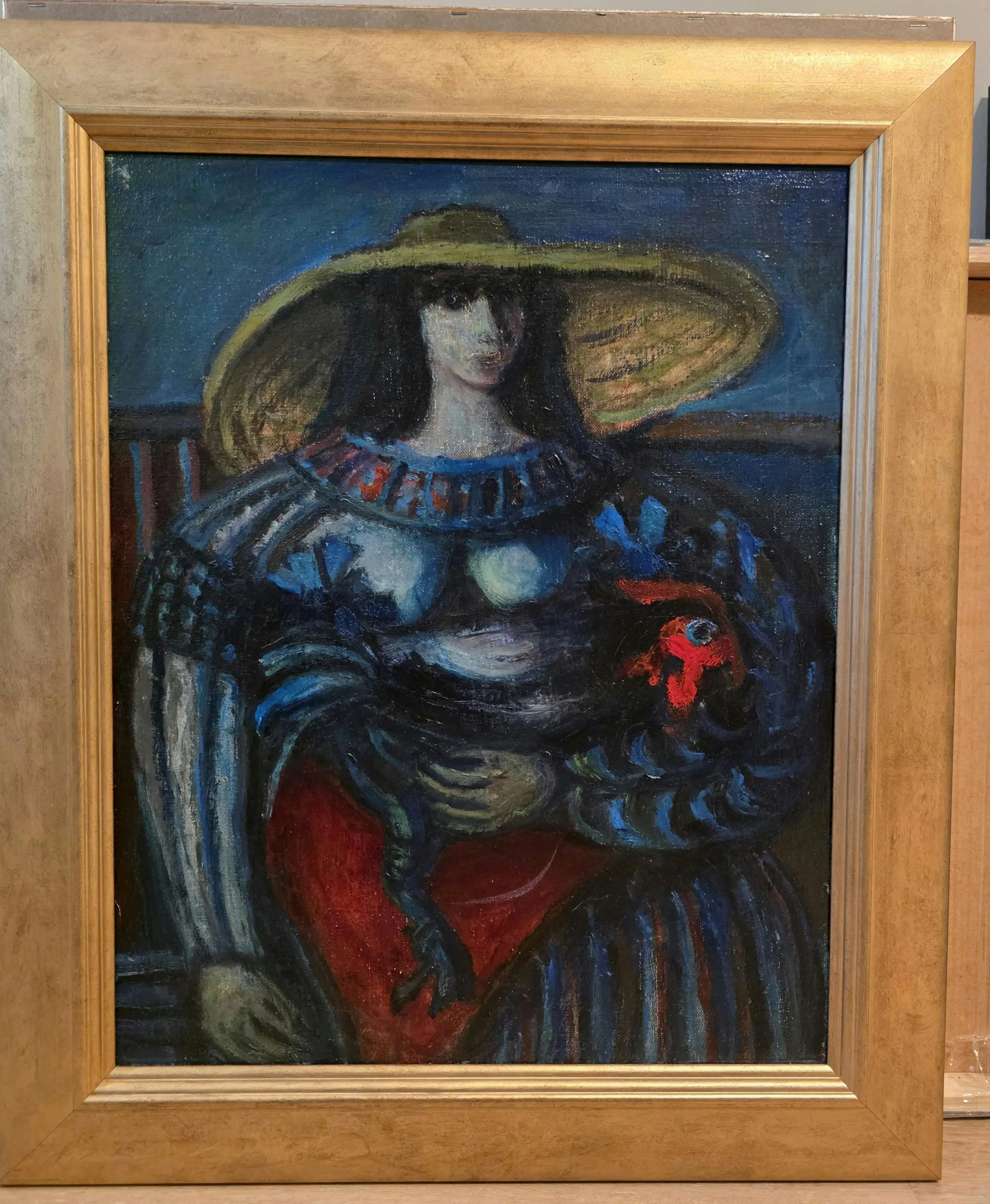 Mexico - Vrouw met haan en zonnehoed, olieverf op doek, gesigneerd achter op het raamwerk. 50 x 40 cm.