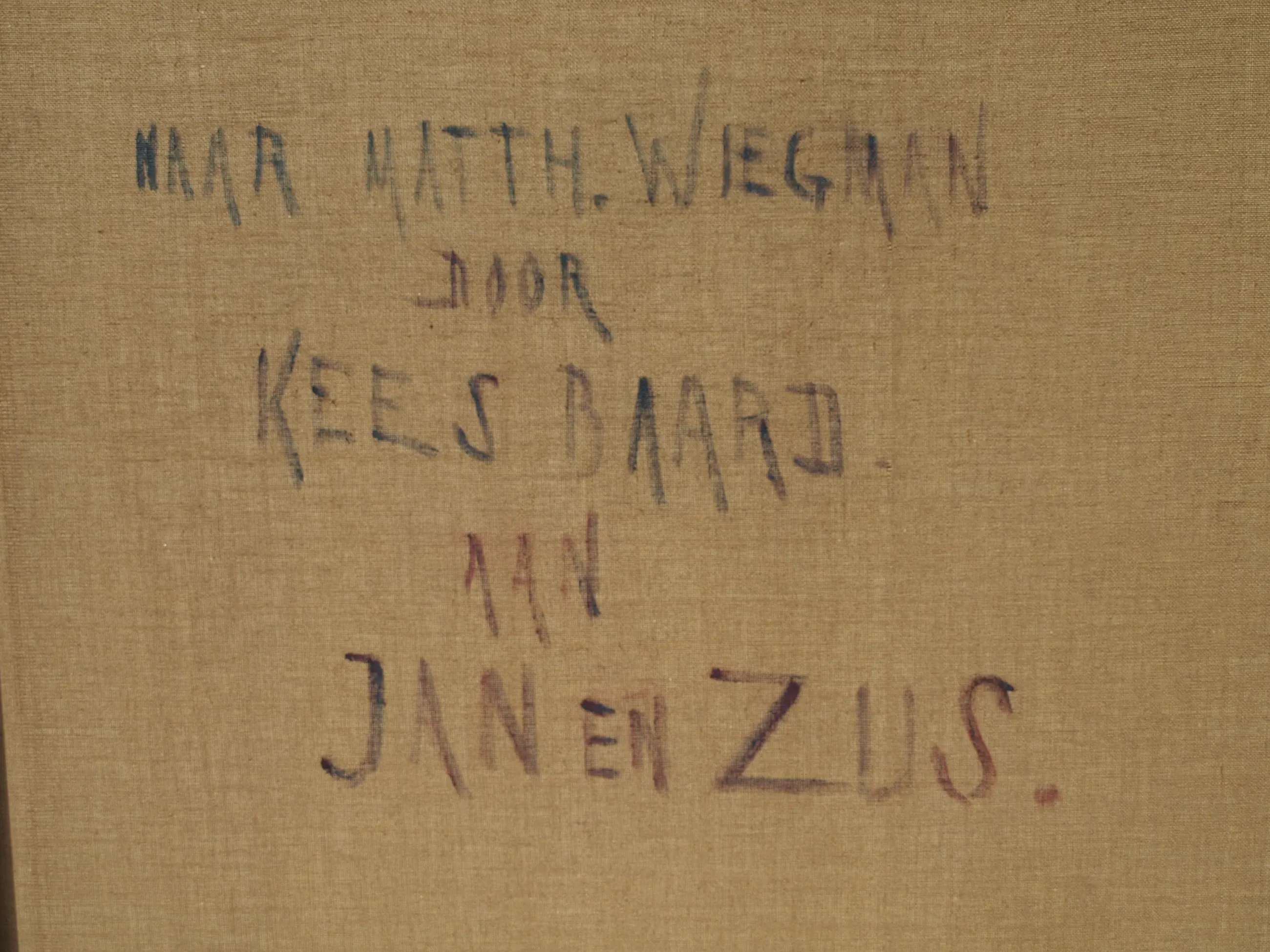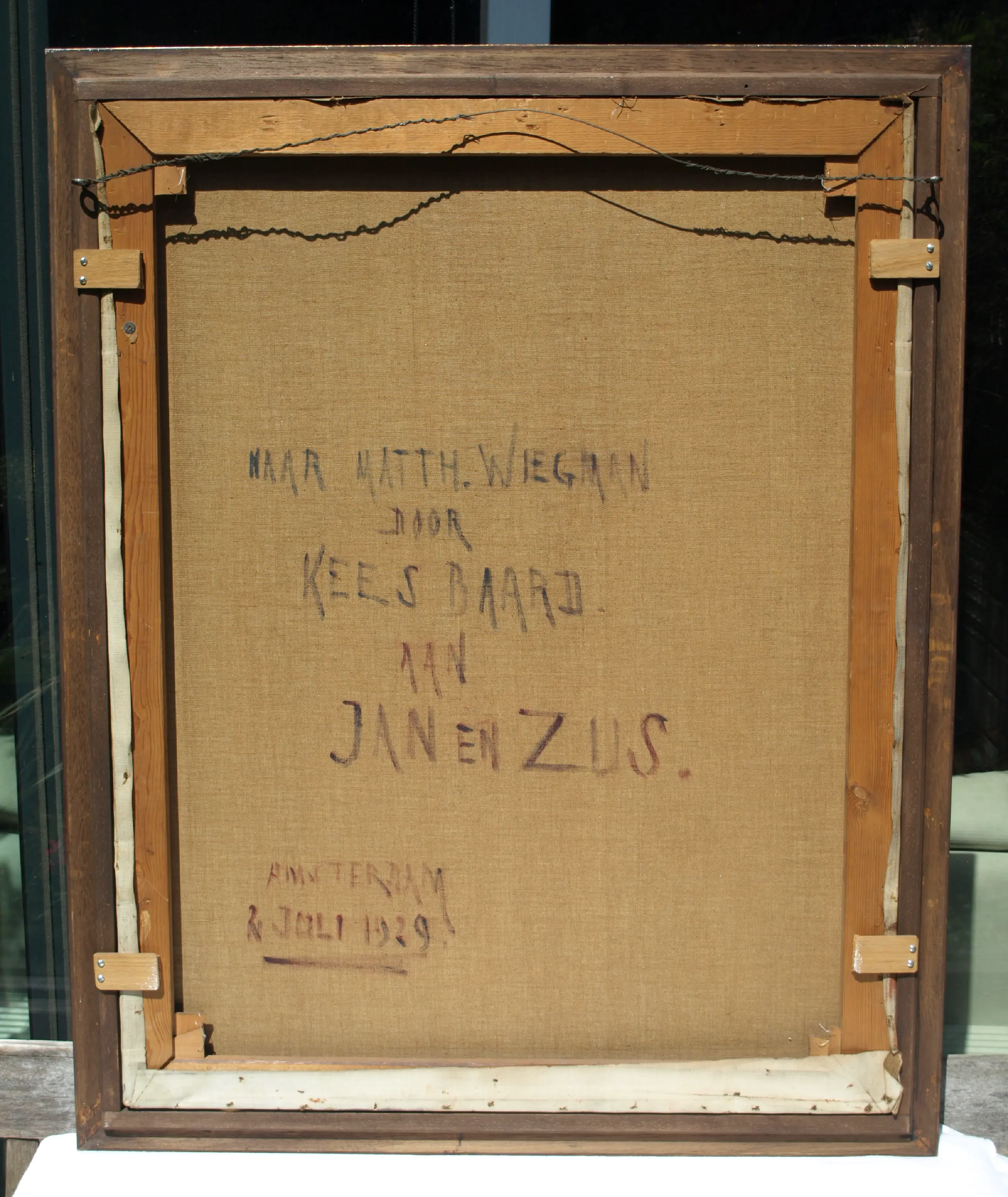 Een groot schilderij uit 1929 van de Nederlandse kunstenaar en kunstverzamelaar Kees Baard (1897-1972), met een voorstelling naar de Bergense School kunstenaar Matthieu Wiegman (1886-1971). -Olieverf op doek, opgespannen op een houten spieraam en ingelijst in de originele houten lijst. -Gesigneerd, gedateerd en met annotatie op de achterkant van het doek. -Afmetingen: Lijst, 101 x 81 cm. Spieraam, 91,5 x 71,5 cm. Beeld, 89,5 x 69,5 cm. -Herkomst: uit de kunstcollectie van Brentano, een organisatie die zijn bestaan te danken heeft aan Josephus Augustinus Brentano (Amsterdam, 28 augustus 1753 - Amsterdam, 16 april 1821), een Nederlandse katholieke koopman van Italiaanse afkomst, kunstverzamelaar, mecenas en filantroop. -Conditie: Het werk is in zeer goede staat. De lijst heeft lichte slijtplekjes. Zie ook de foto’s voor een eigen indruk. Kan zo aan de muur.