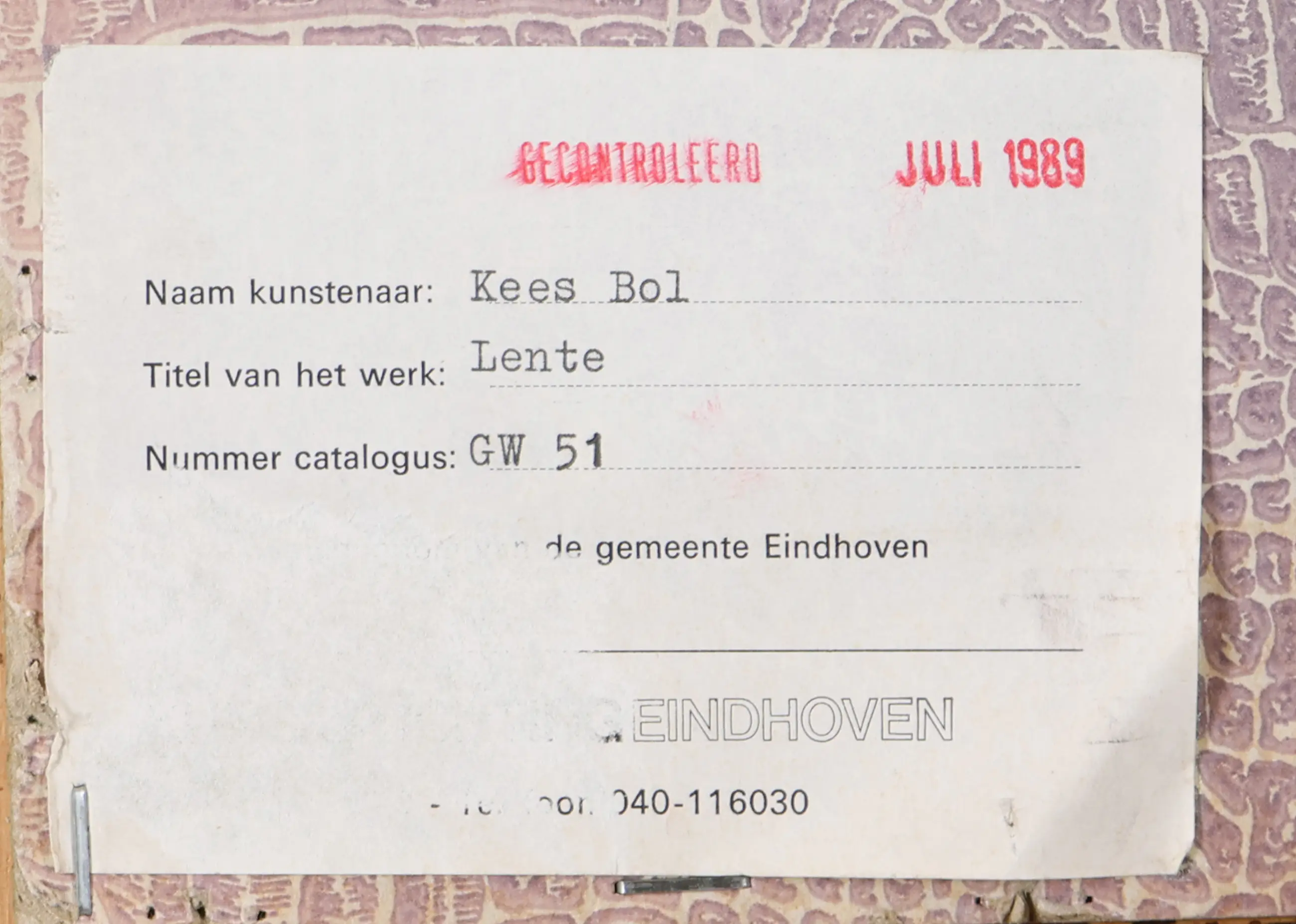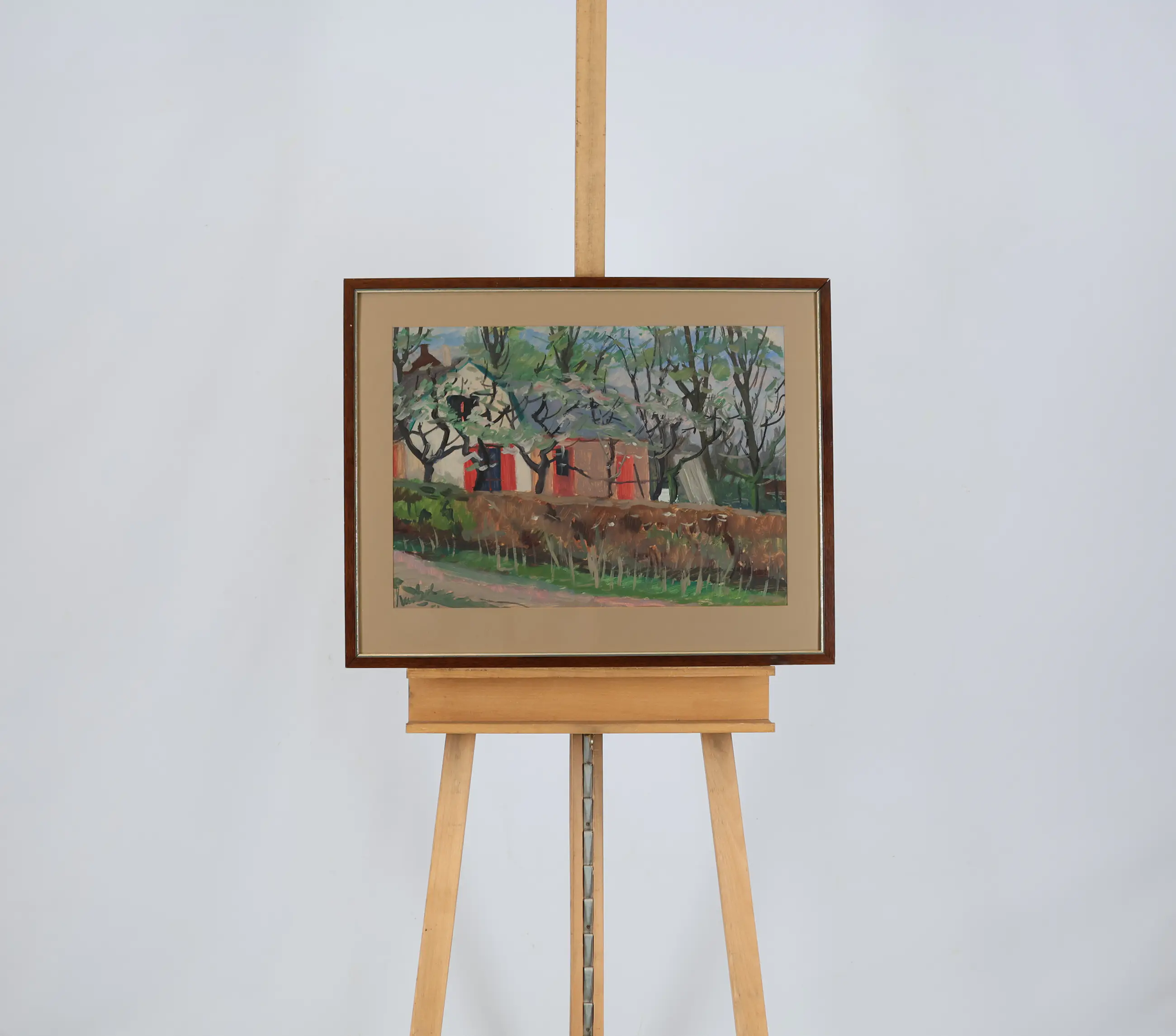 In deze levendige gouache op karton toont Kees Bol zijn kenmerkende stijl waarin eenvoud, kleur en ritme samensmelten tot een harmonieuze compositie. Te zien is een landelijke woning verscholen achter bloeiende bomen, met de karakteristieke rode luiken en deuren die een warm accent vormen binnen de zachte lentekleuren.