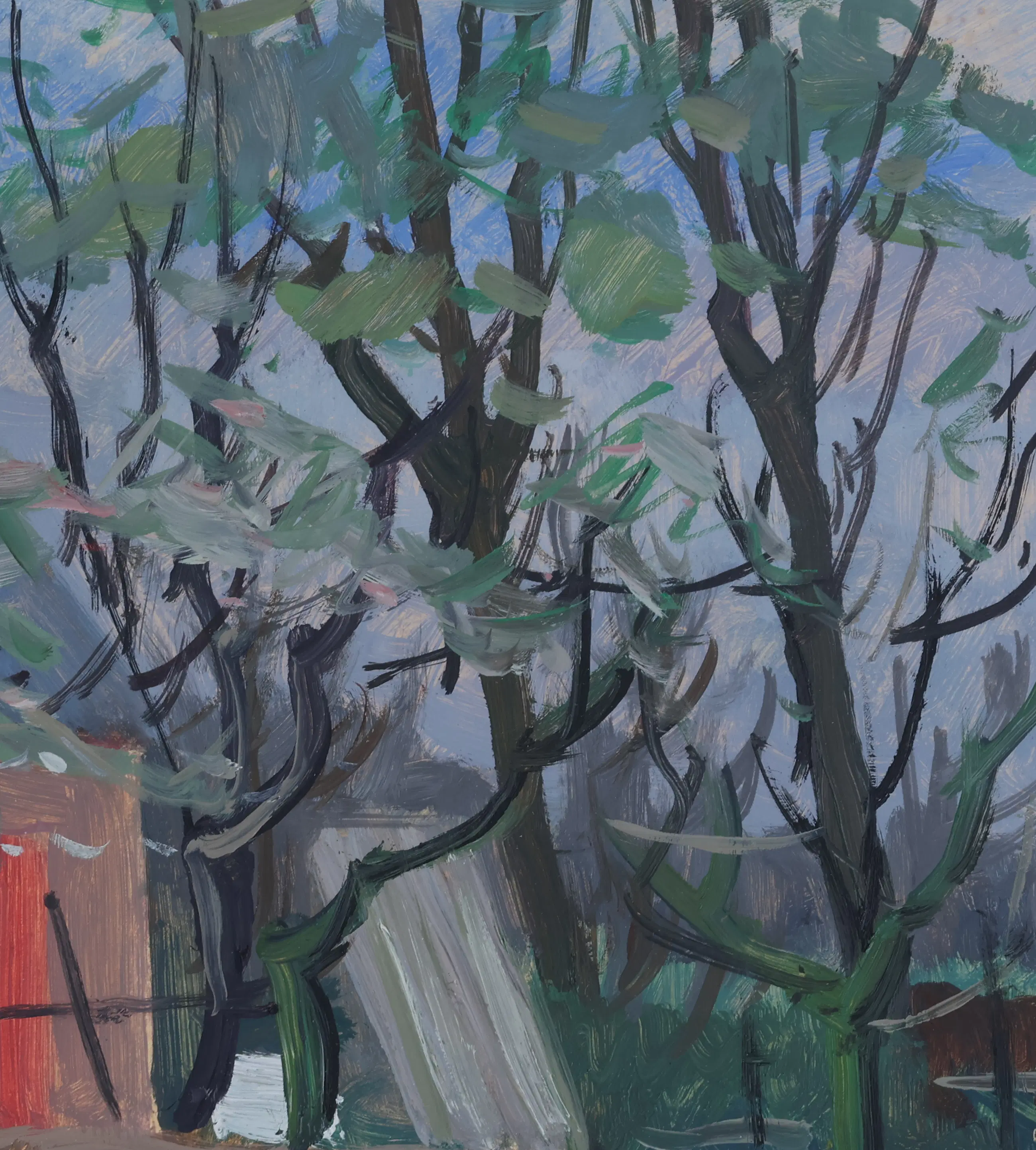 De penseelvoering is los en energiek; brede streken in groen, blauw en bruin suggereren beweging en lichtval zonder nadruk op detail. Bol weet met minimale middelen de sfeer van een vroege voorjaarsdag vast te leggen – fris, open en vol verwachting.