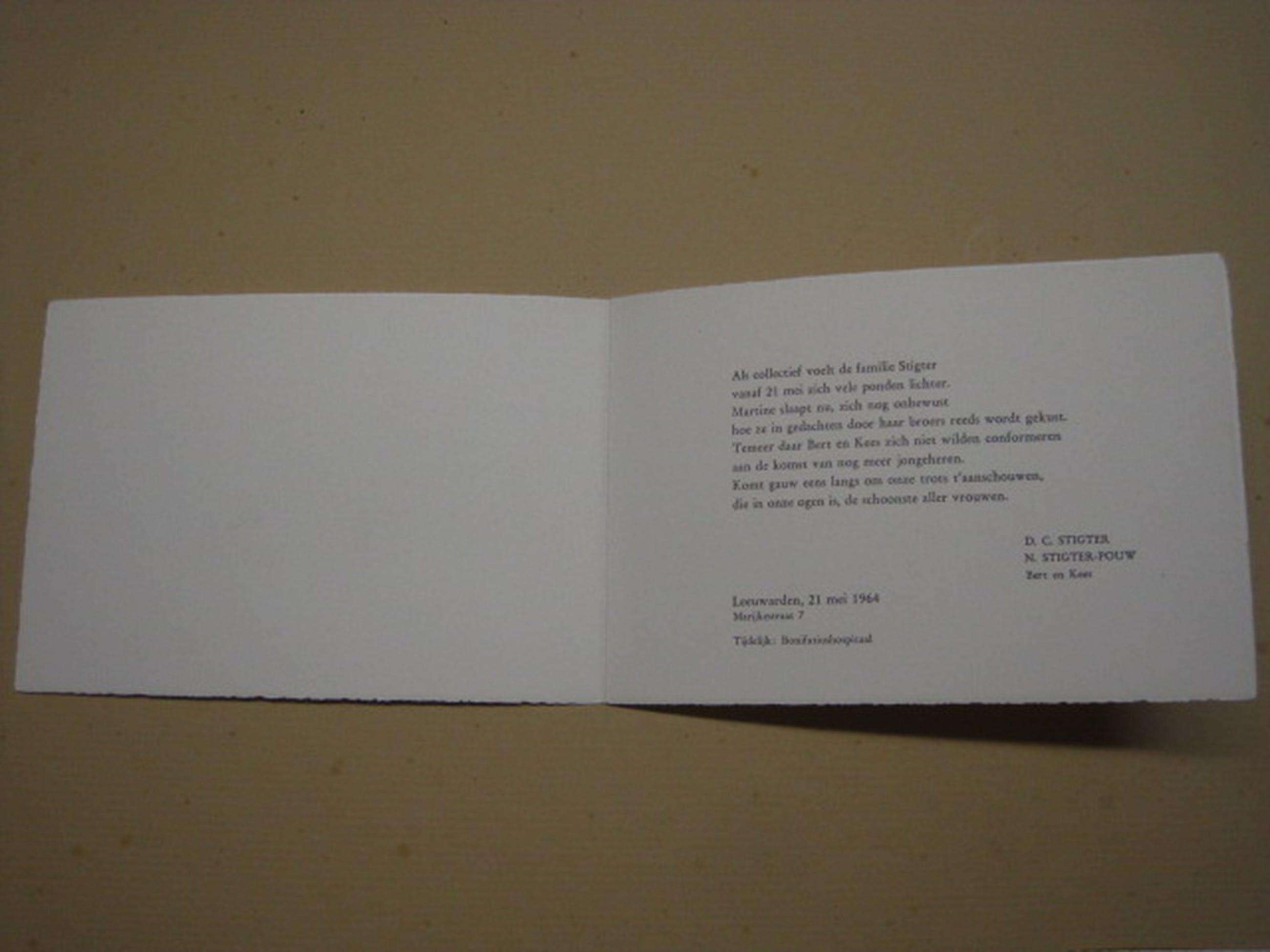 Titel : " geboortekaartje Martine Stigter 21/05-1964 " ( plus een niet gesigneerd litho van baby )